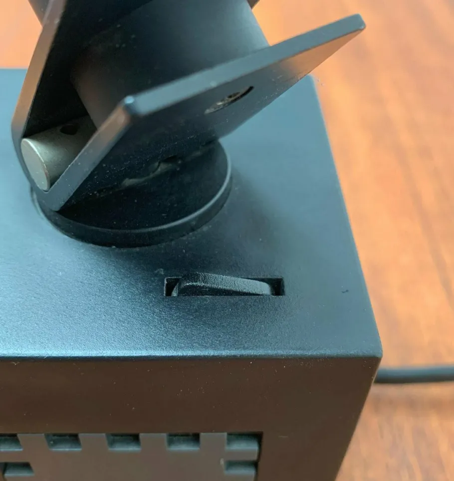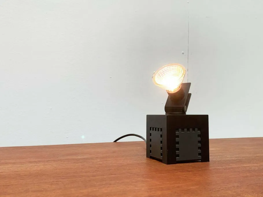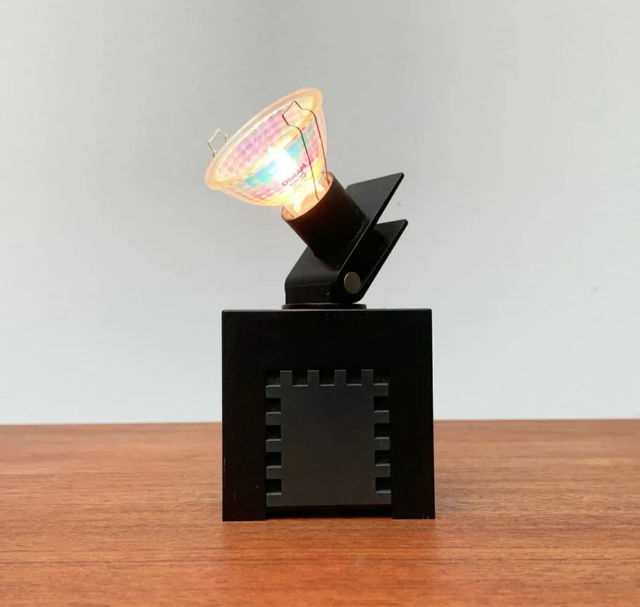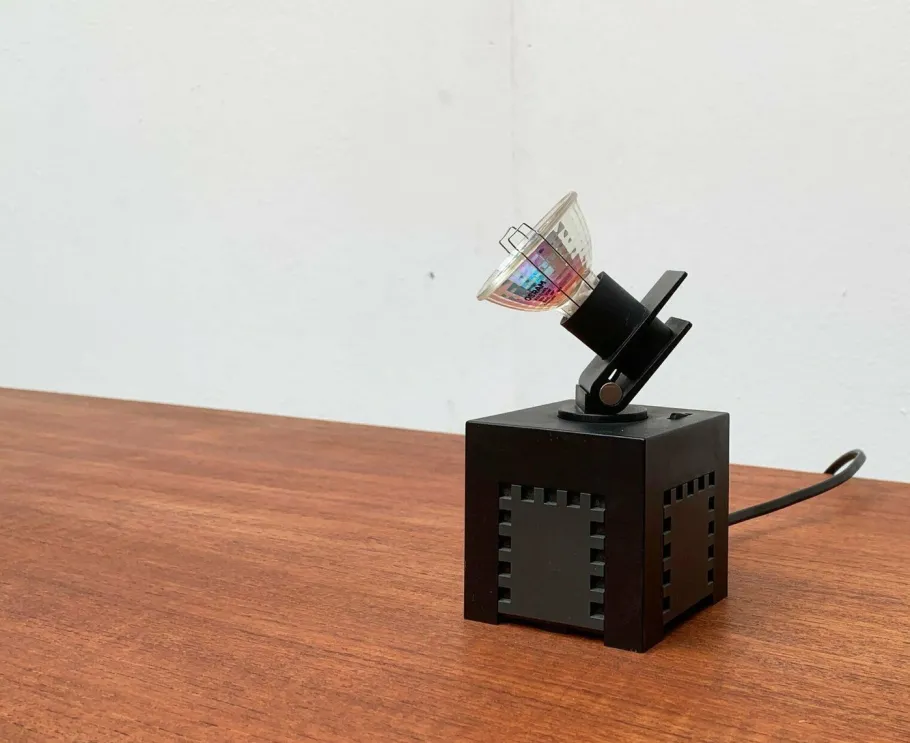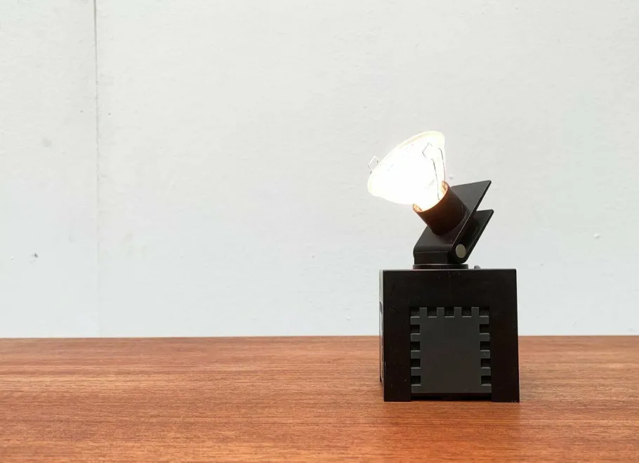 A functional design with postmodern details. The cubic base primarily consists of the cladding of the transformer. On the outside it is decorated all around with a graphic ornament. A narrow switch is inconspicuously integrated on the top. The actual lamp head protrudes from the center of the base and consists only of a socket and a handle. The spotlight bulb is a design element of this small lamp. It is also held in position by two metal clips. The head is flexibly mounted and can rotate and tilt. The lamp also has a holder for wall mounting.