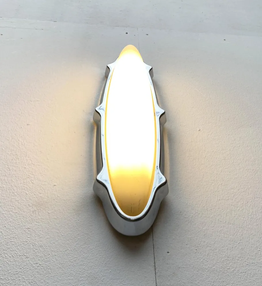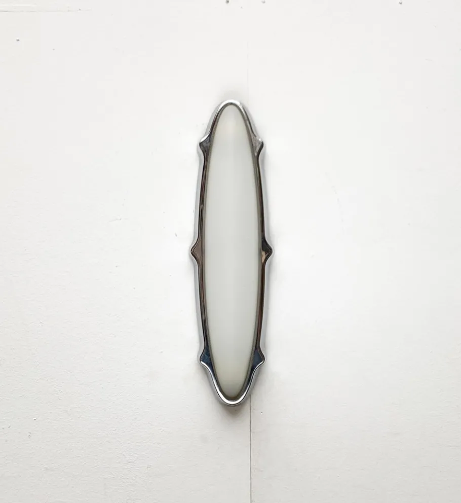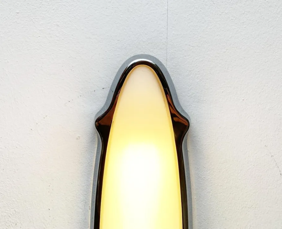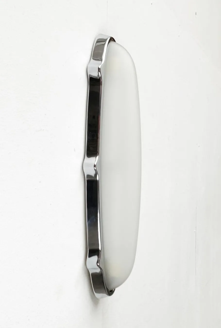 A postmodern design of special materiality. The luminous body shows a fine ornamentation that interprets forms and motifs of Art Deco in new materiality. The lamp consists of an aluminum frame, the base plate and the glass diffuser. The translucent glass is framed by the aluminum frame and closes the lamp to the wall. The glass protrudes as an elongated, gently curved hood. The lights are protected and can also be used for the outside area.