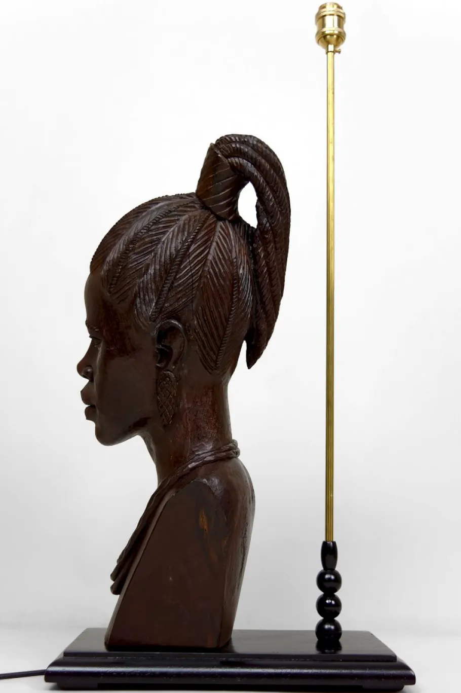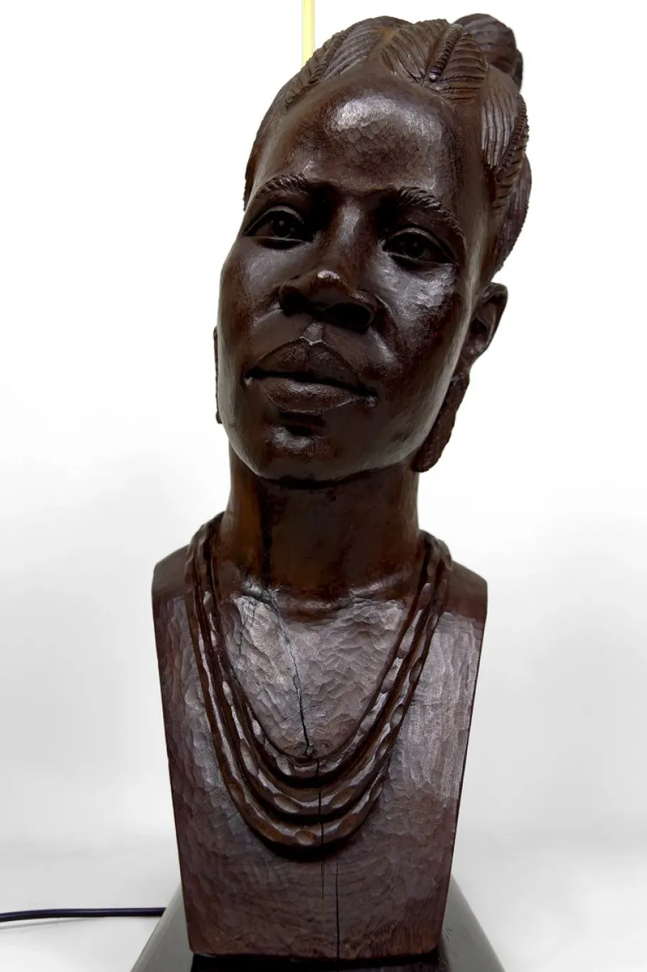 It features a finely carved bust of an African woman in solid ebony, resting on a matching wooden base.