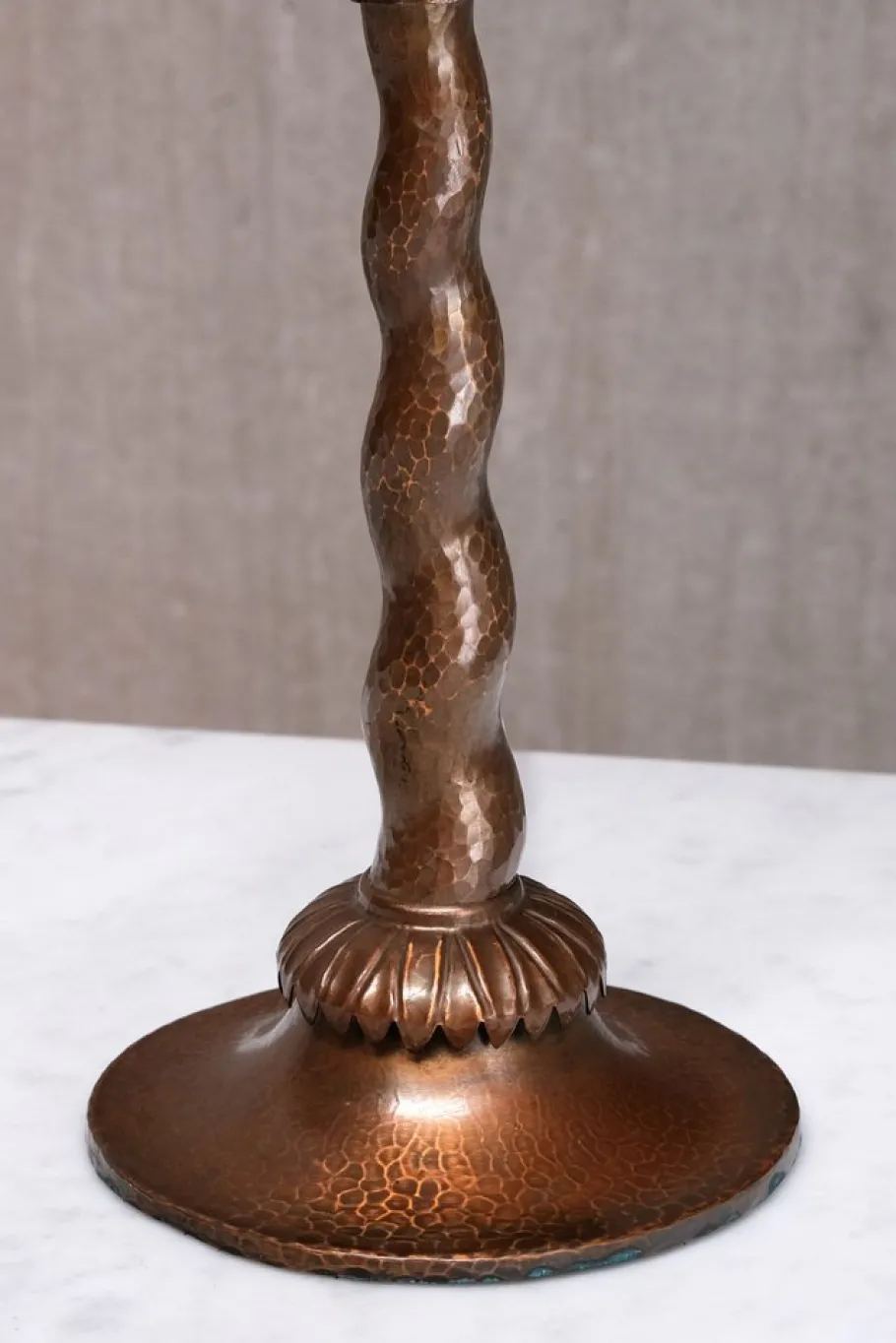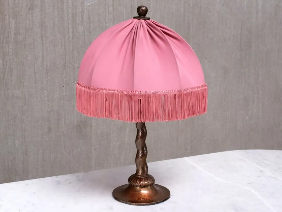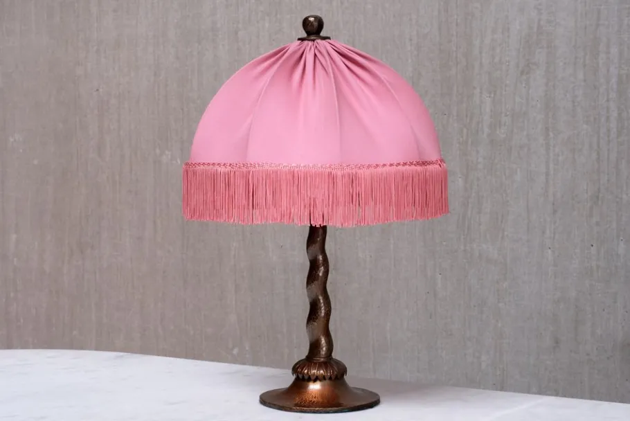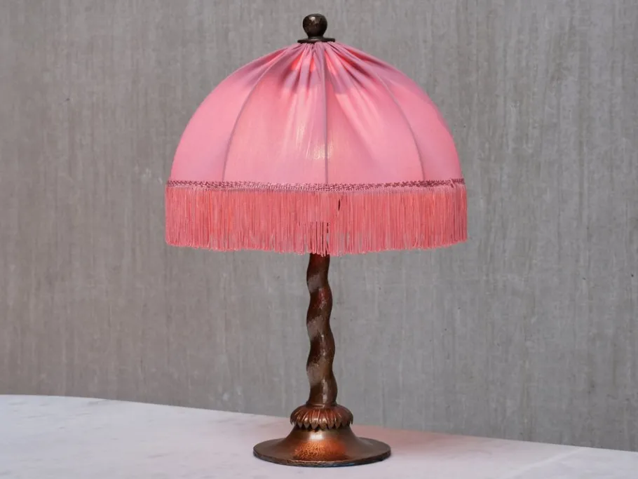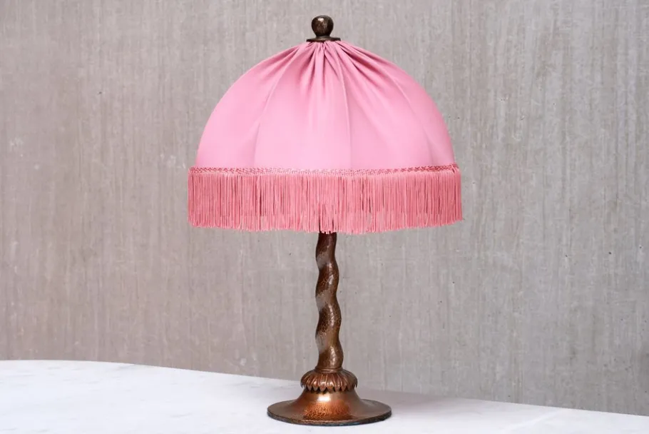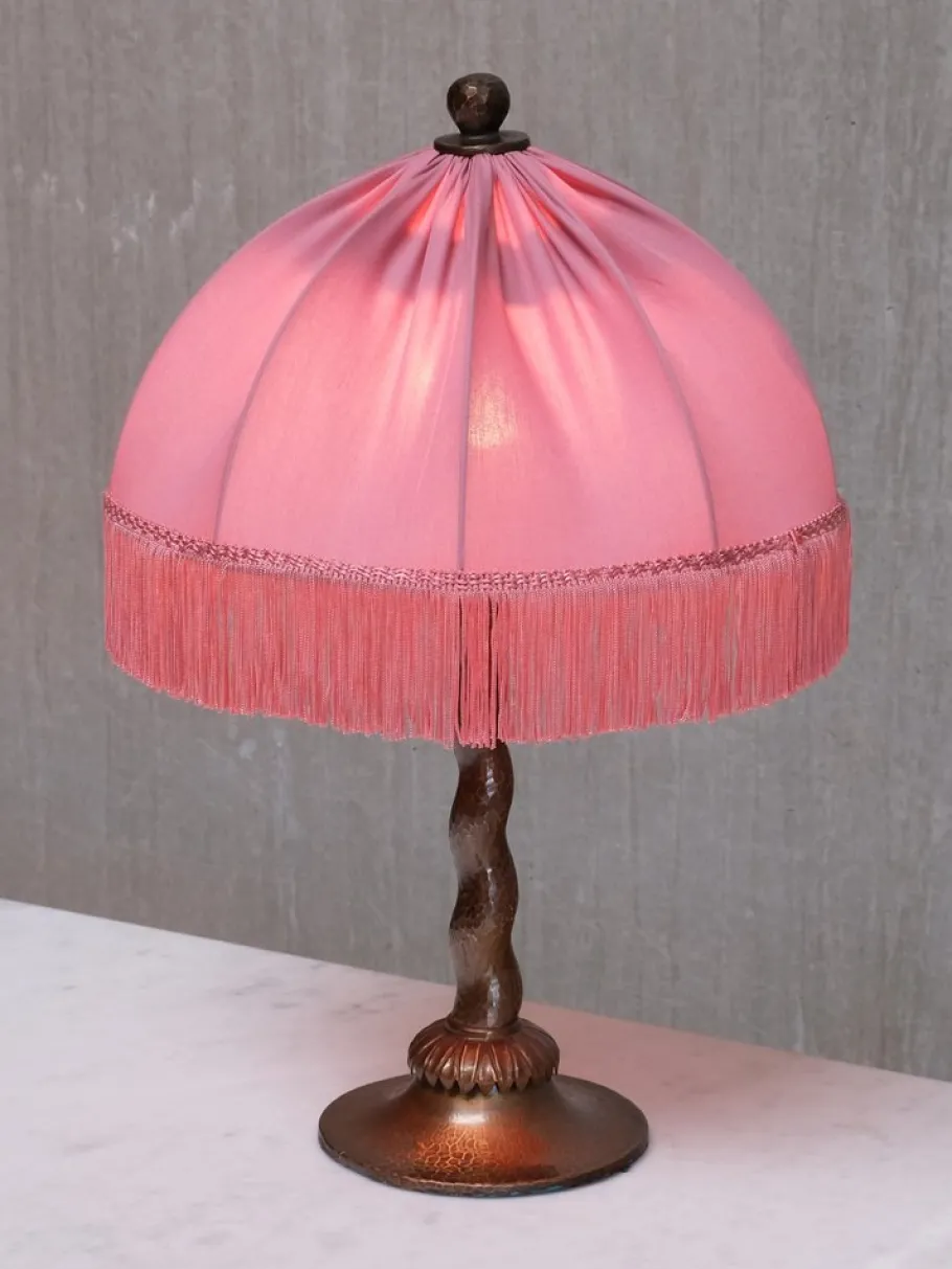 Executed entirely in hand-hammered copper, the lamp features a tapered barley twist stem, a flared disk base, and a palmate detail at the collar. The domed shade is topped with a decorative cap and crowned by a sculpted sphere finial. The original frame has been preserved, while the shade has been newly dressed in soft pink fabric with coordinating silk fringe.