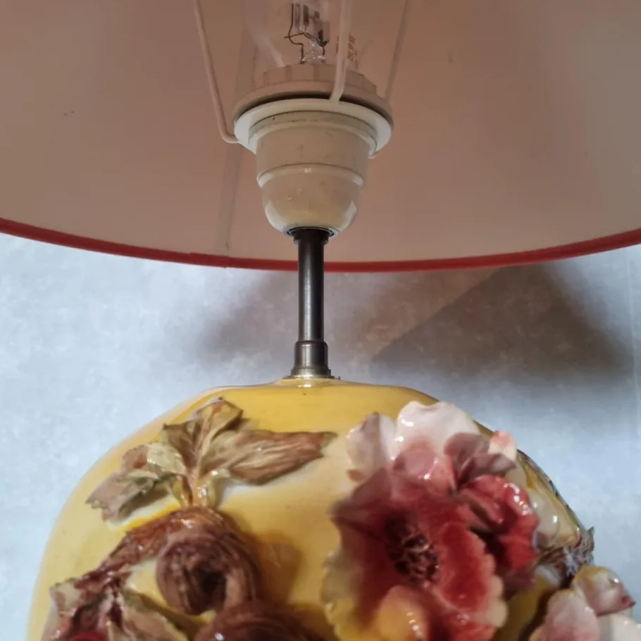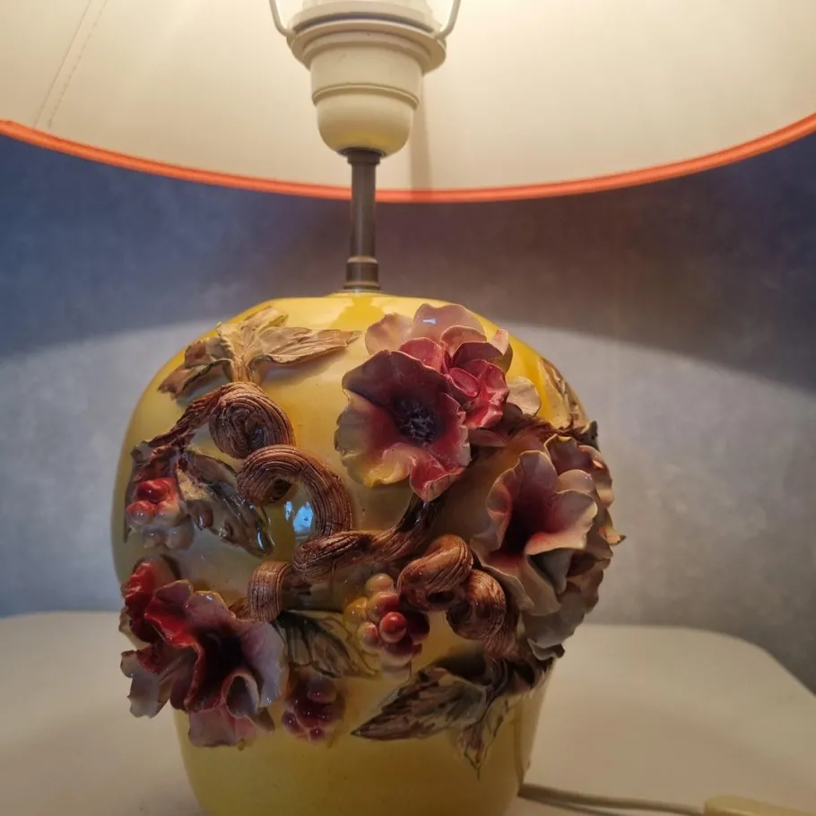 Yellow ceramic base with multicolored slip-cast floral decorations: height without shade: 25 cm
