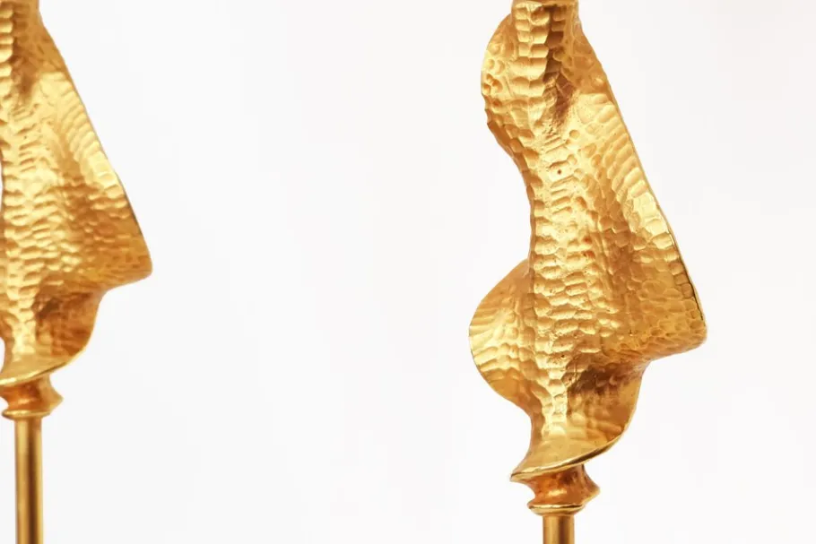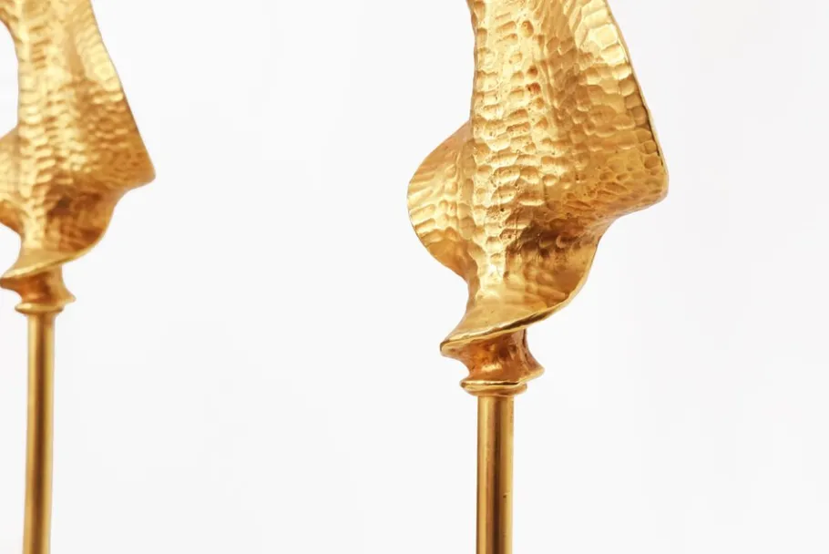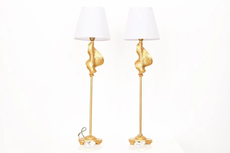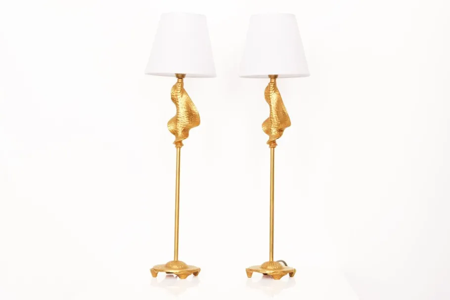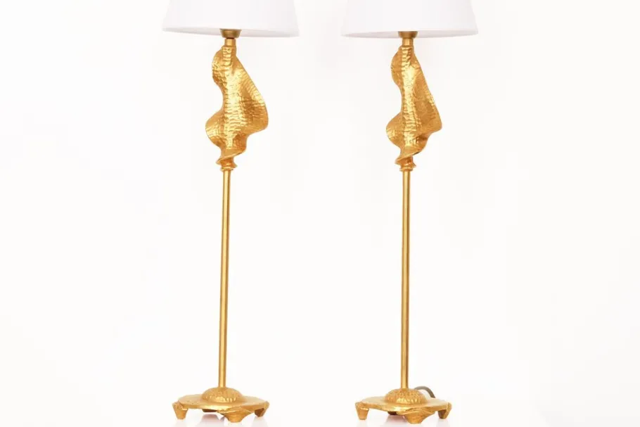 The lamps are presented with tapered fabric shades, their understated simplicity allowing the golden bronze structure to take center stage. The warm, lustrous patina enhances the finely worked surfaces, highlighting the artisanal quality of the casting.