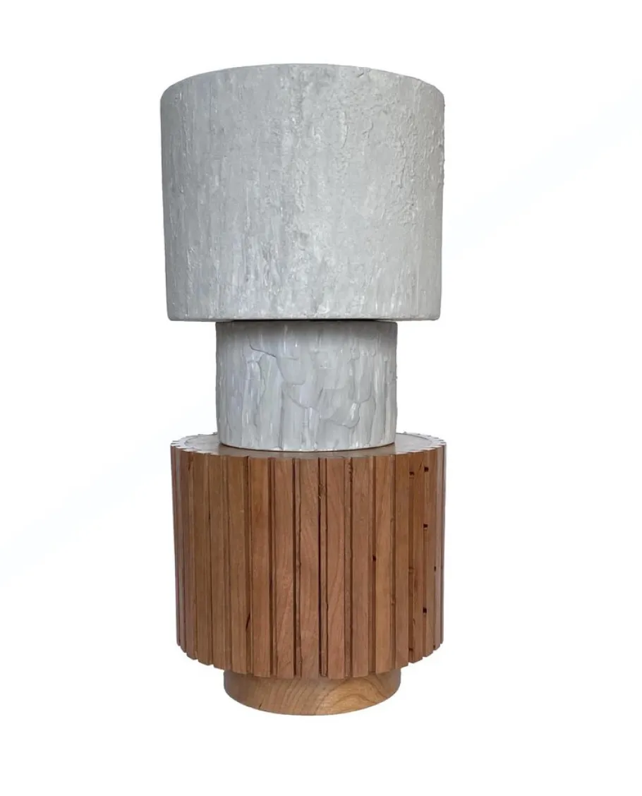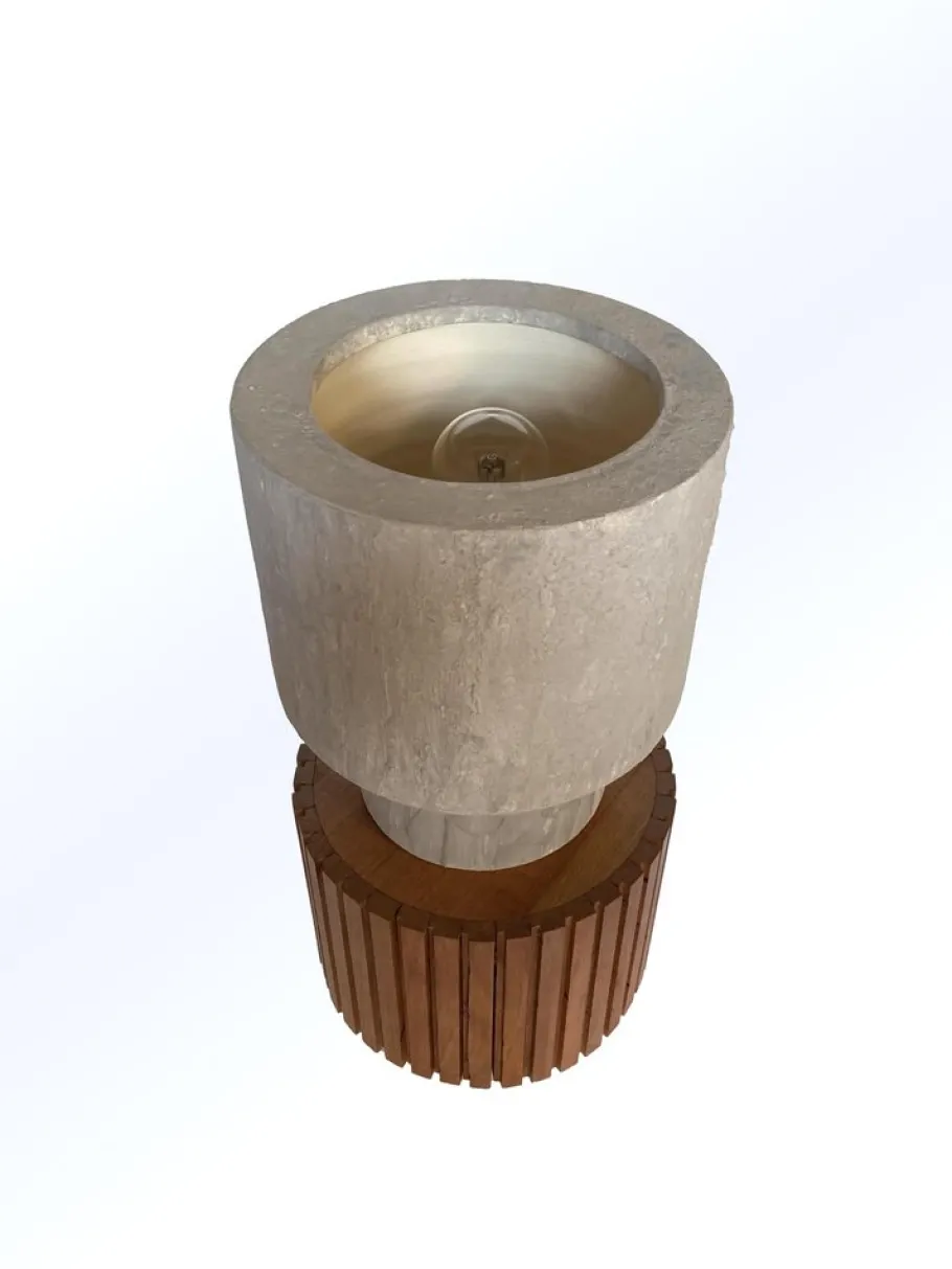 The lamp is composed of a cherry wood part and a decorated terracotta part.