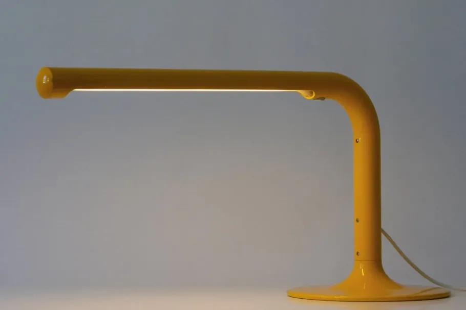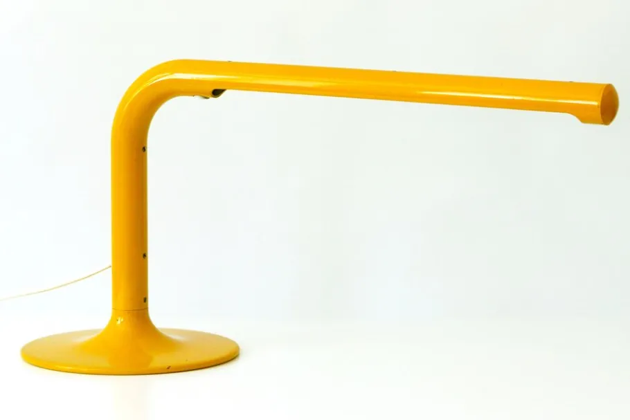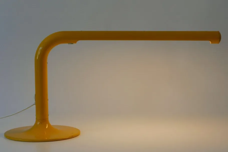 Executed in yellow enameled metal, the desk lamp needs 1 x fluorescent tube, is with original wiring, in working condition and runs on 230 volt. For use in USA, you need an adapter.