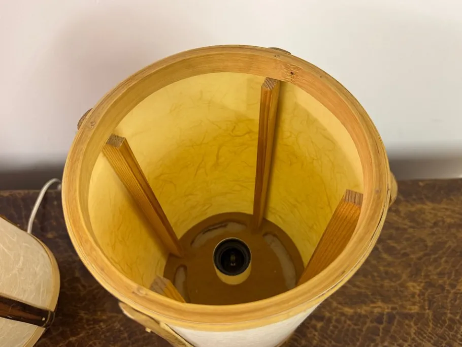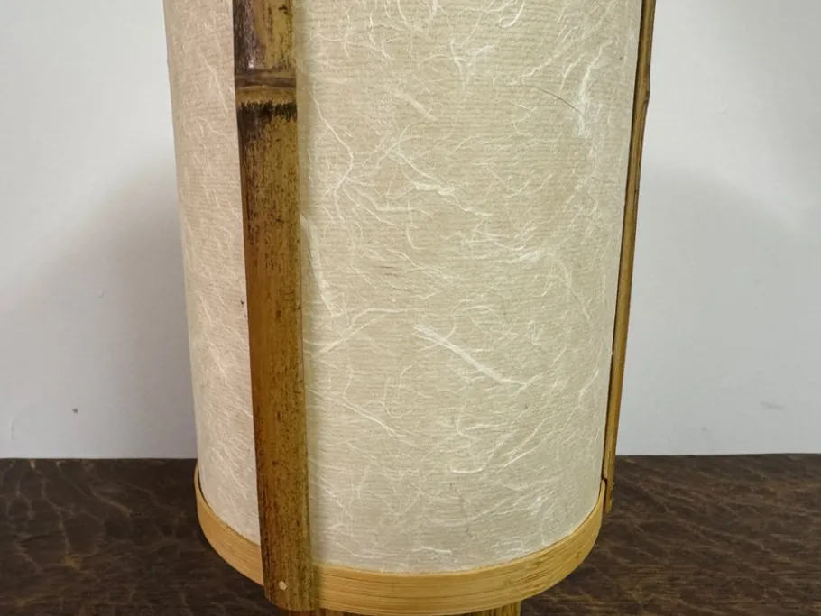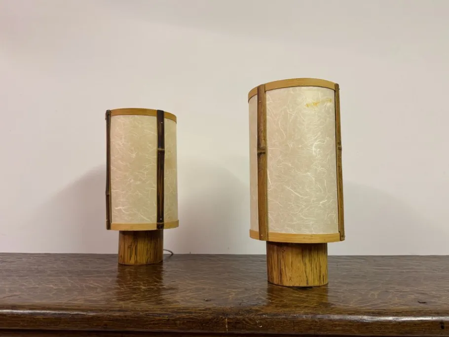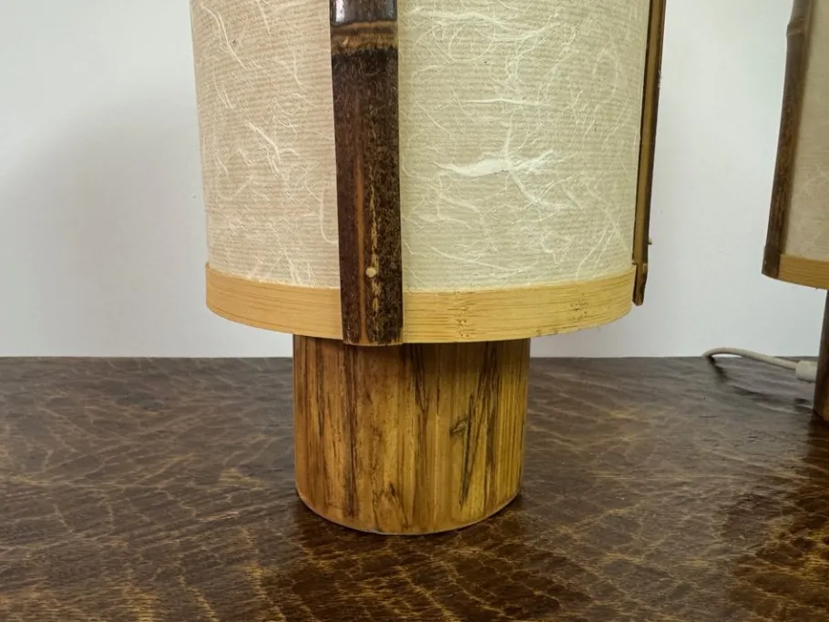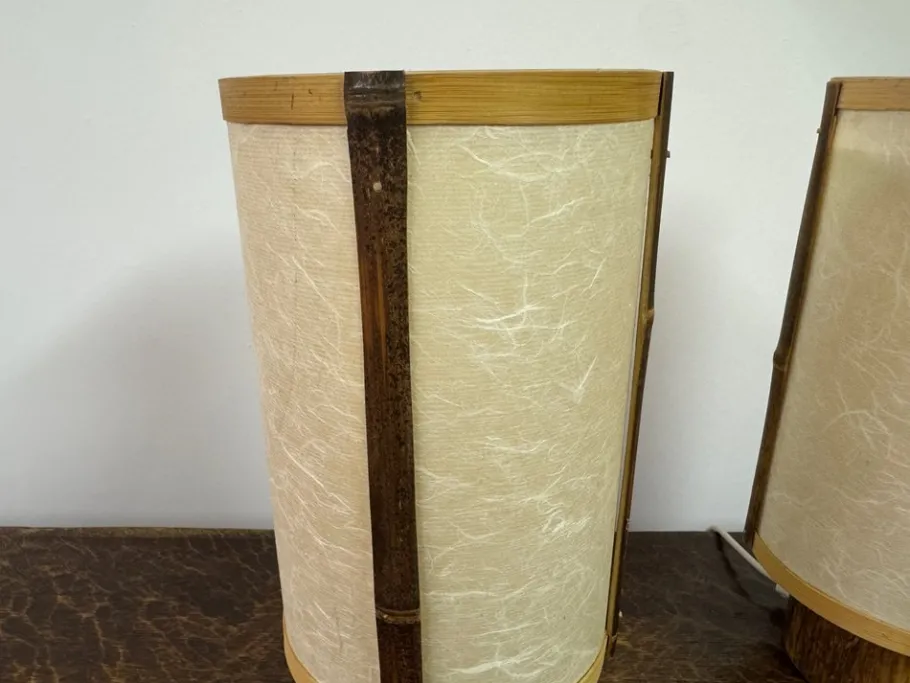 A striking pair of table lamps in bamboo and rice paper, dating to the 1960s. Each lamp is constructed with vertical bamboo supports framing softly textured rice paper shades, their natural fibres creating a delicate interplay with light. The cylindrical bases, also in bamboo, lend a sense of organic solidity that grounds the design.