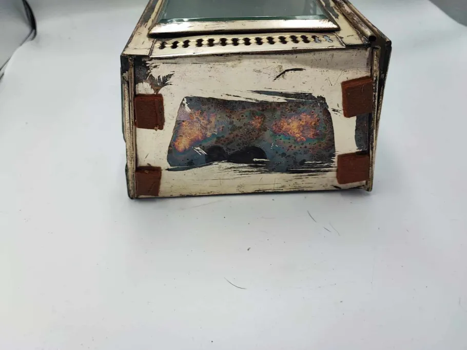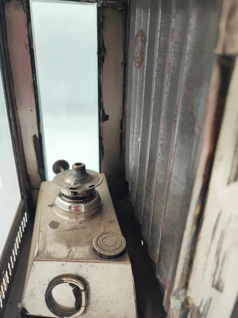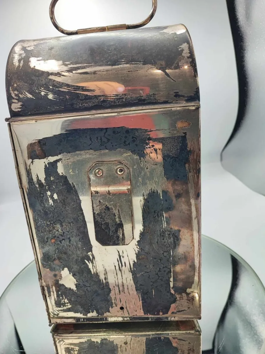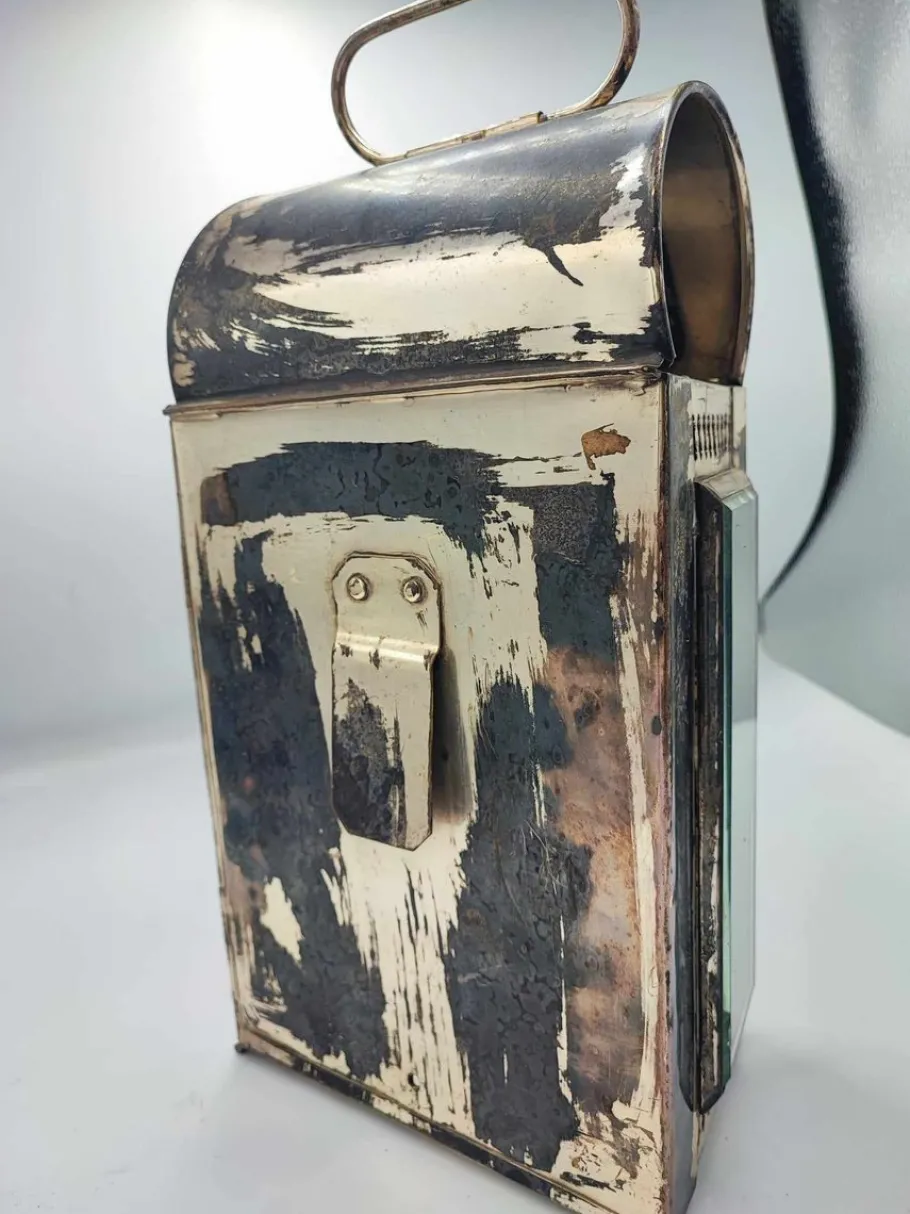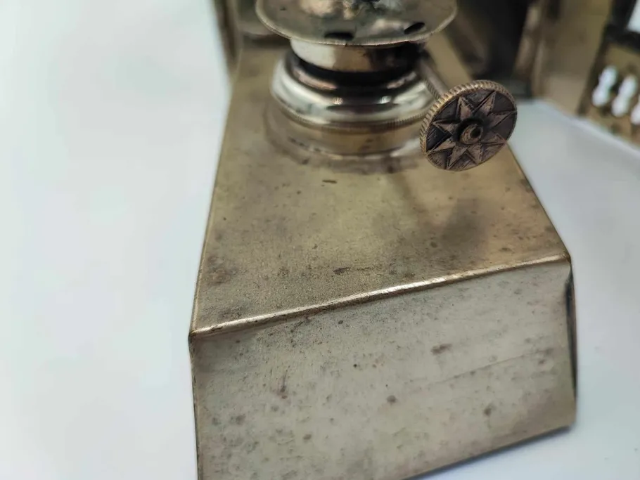 | Restoration and Damage Details | Patina consistent with age and use, Pre-war brass nickel-plated railway kerosene lamp from 1930 , dimensions height 36 cm, width 18 cm, depth 11 cm. |