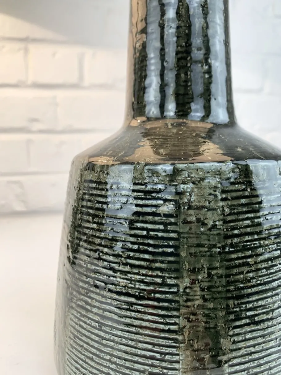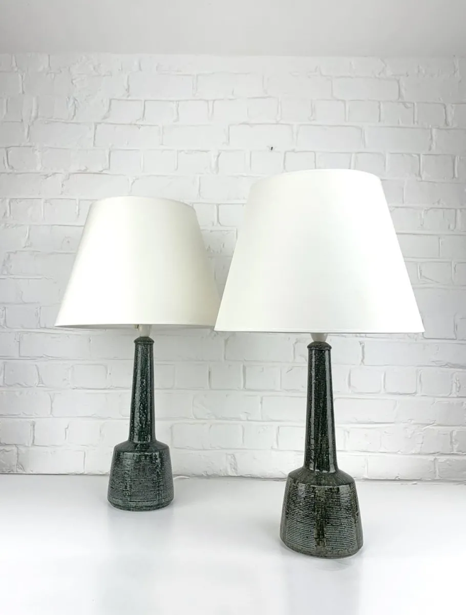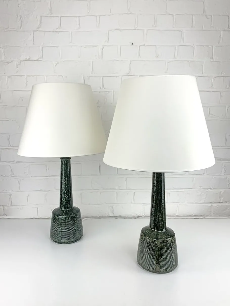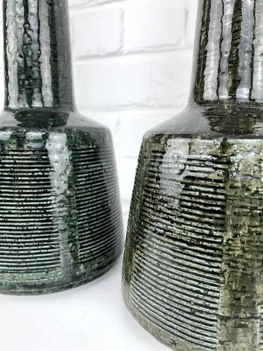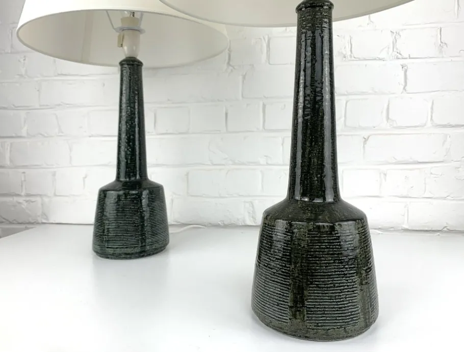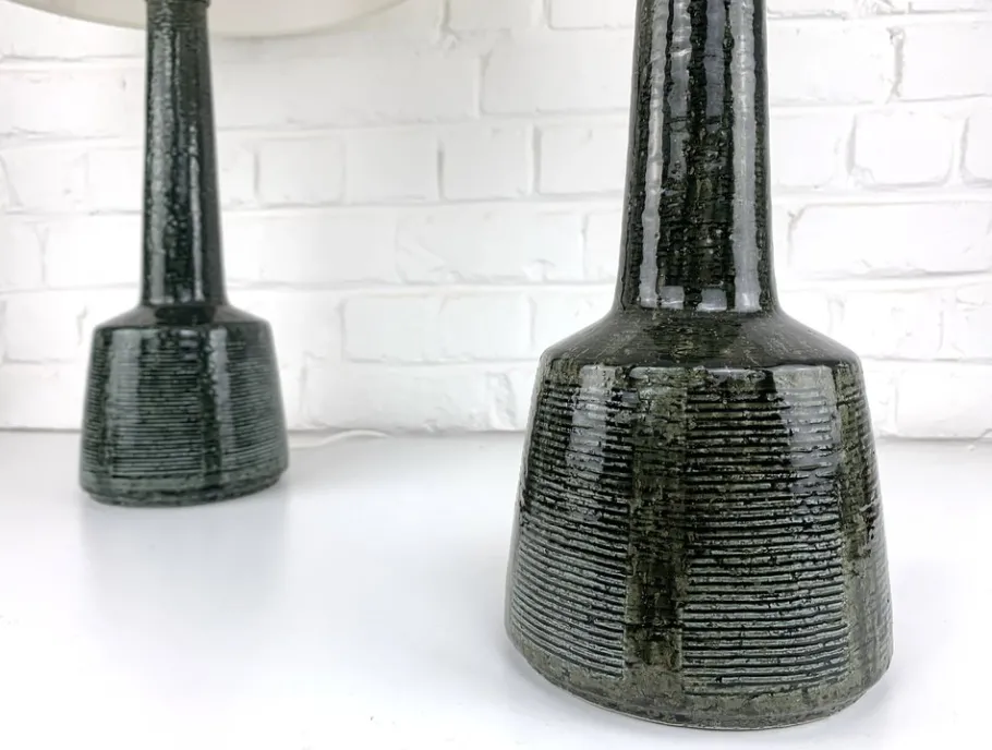 The lamps have a dark green / olive green glaze and come with a geometric line pattern on the base. The chamotte clay gives a natural and living surface. Signed under the base (EK for Esben Klint).