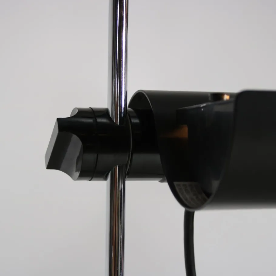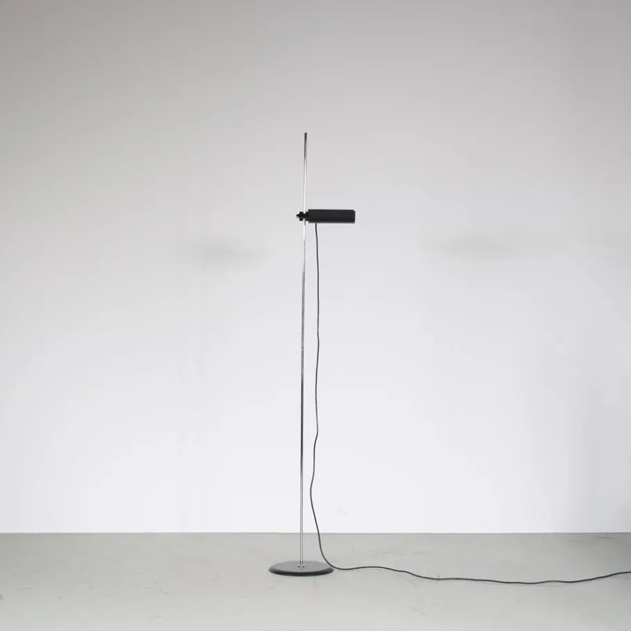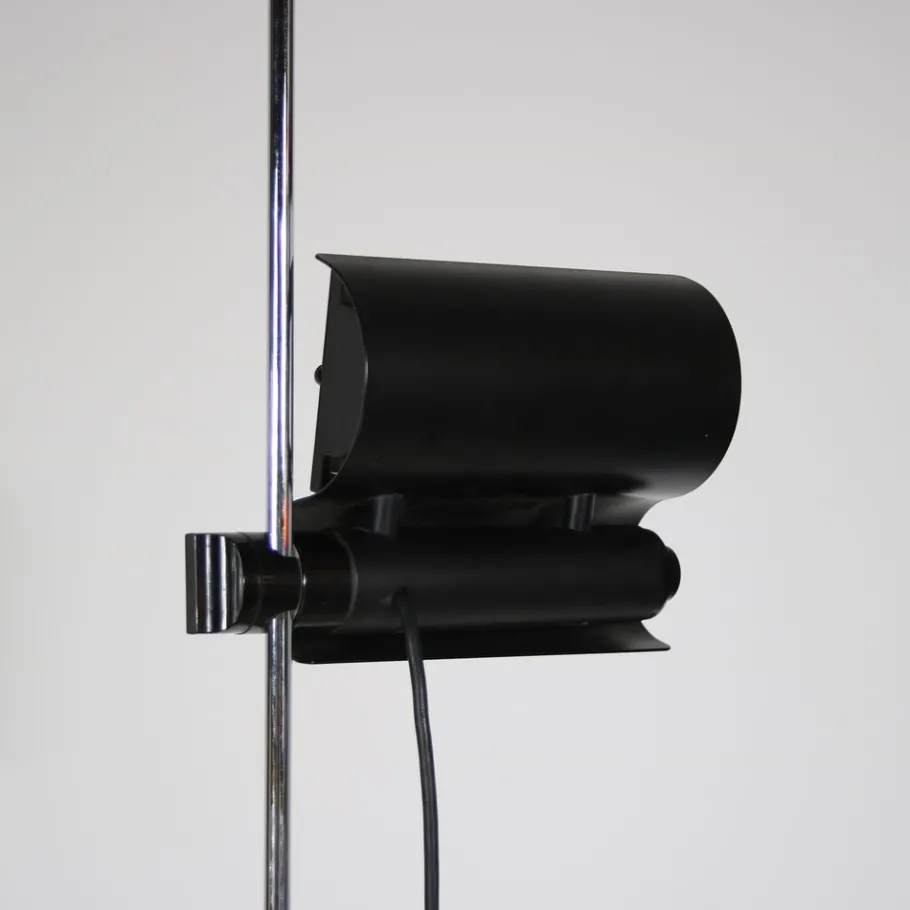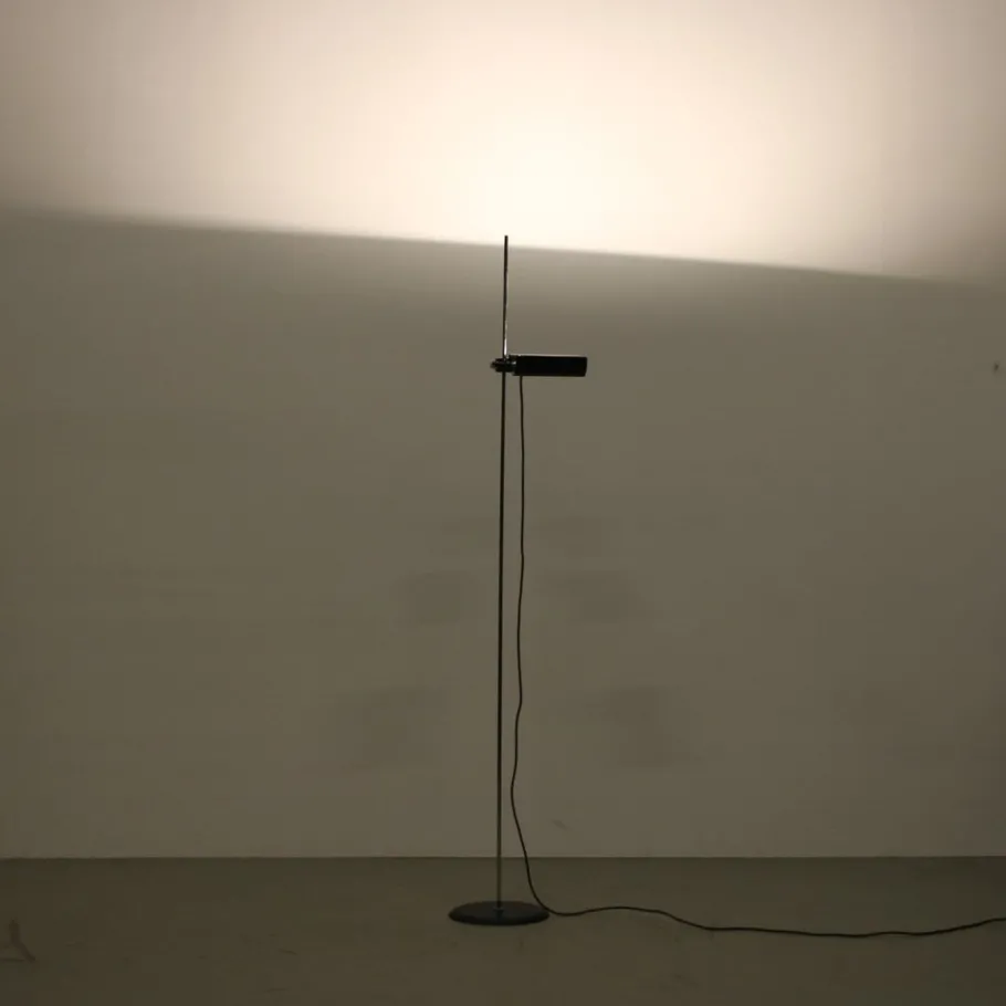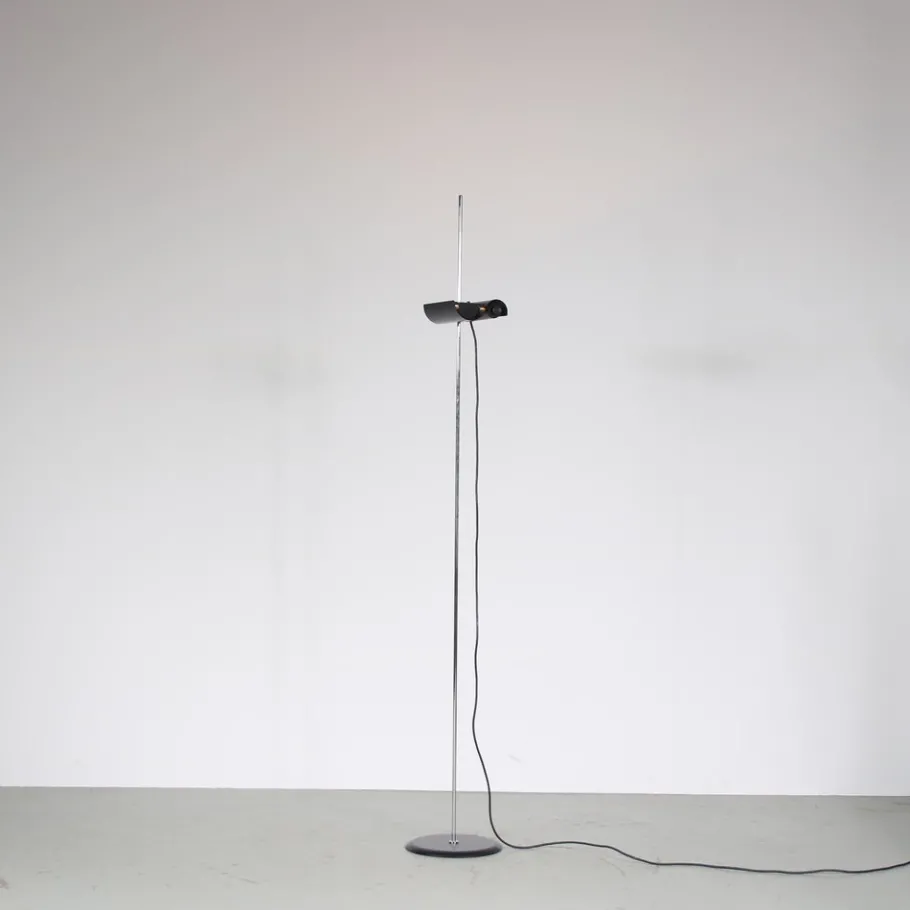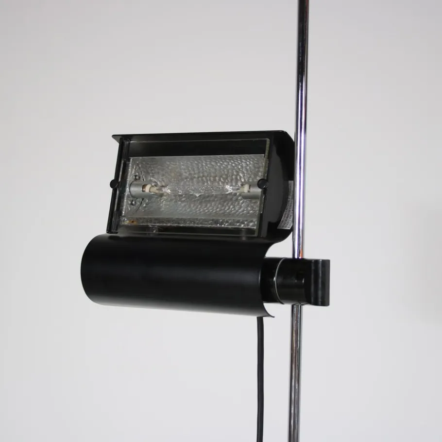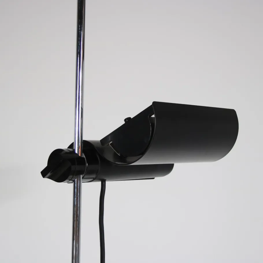 This striking floor lamp embodies the essence of minimalist design with its clean lines and sleek silhouette. It stands on a black lacquered round foot with a thin tubular chrome plated arm. The highlight of the design is the beautifully waved shaped adjustable hood, which adds a touch of elegance and functionality. The hood (and light source) can easily be adjusted in height by sliding over the arm. The combination of black and chrome finishes creates a visually appealing contrast, adding nicely to the iconic lamp’s overall appeal.