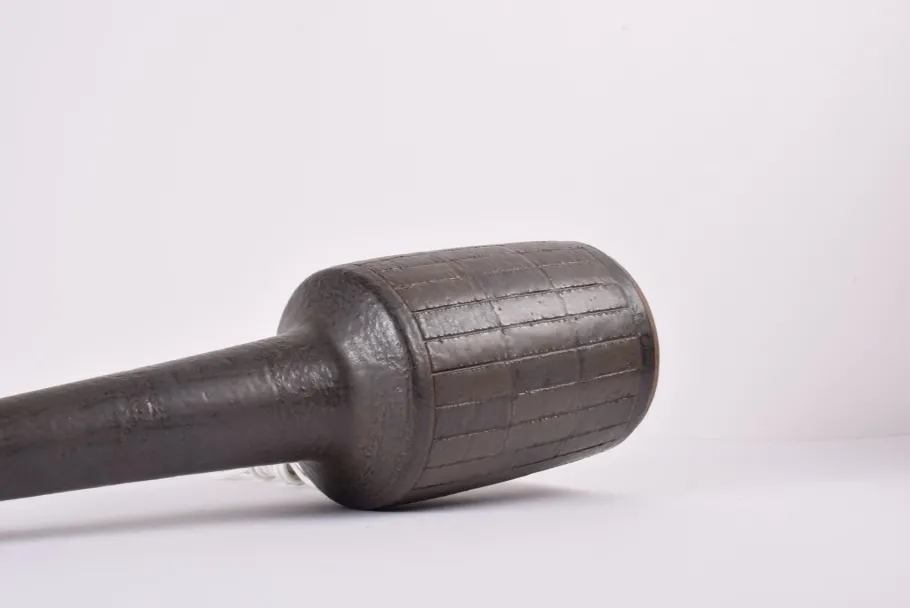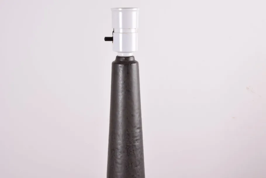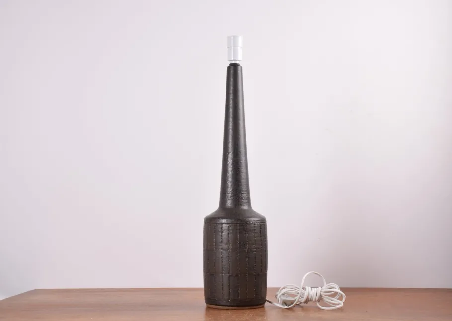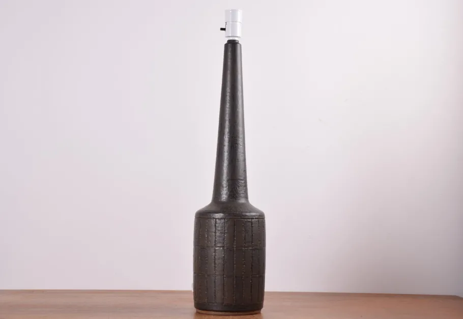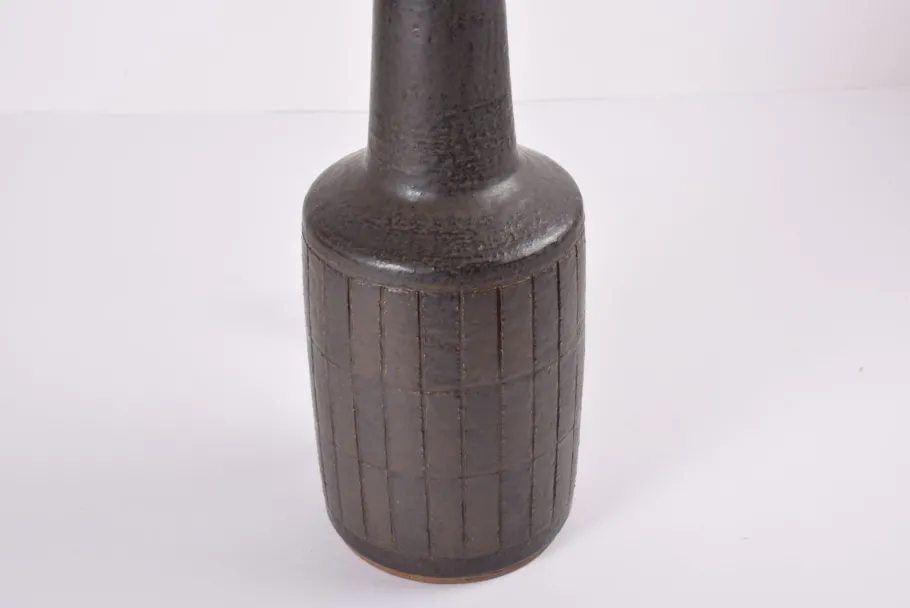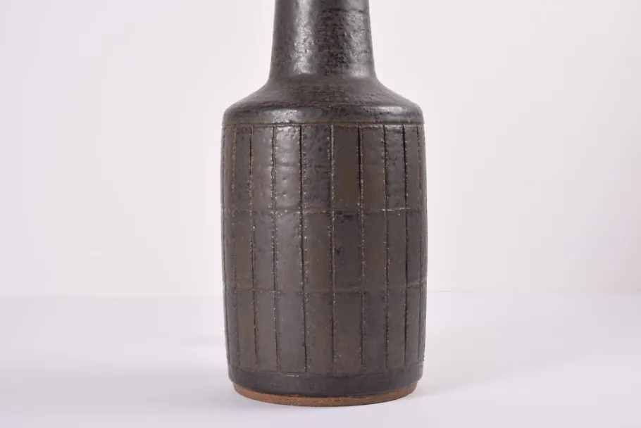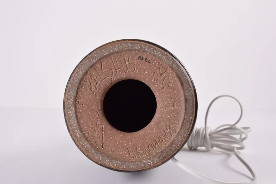 The glaze is brownish dark green and the lamp has a simple incised geometric decor. It´s made with chamotte clay which gives a tactile surface.