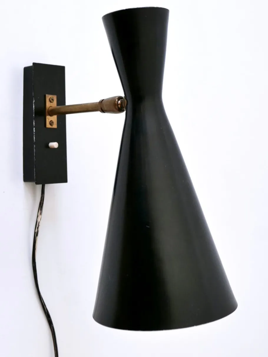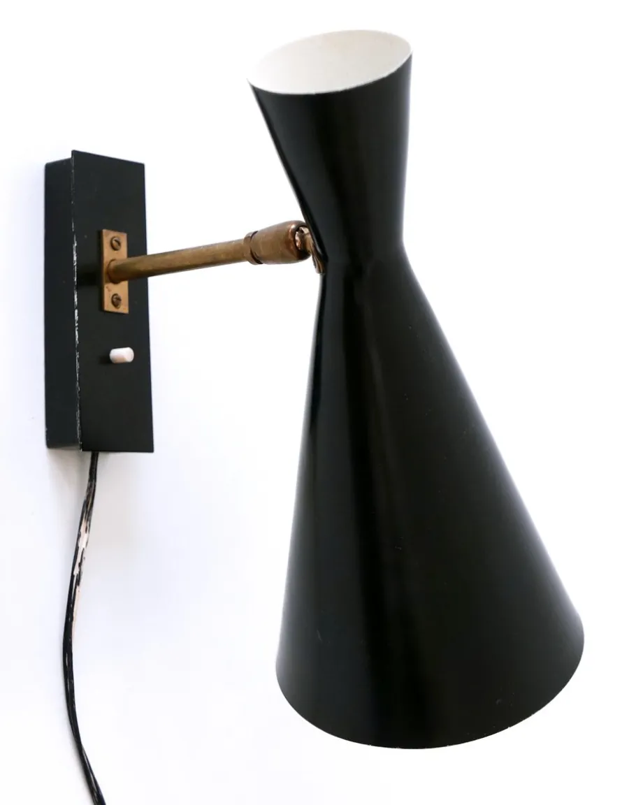 Executed in brass, aluminium and metal, the sconce comes with 1 x E27 / E26 Edison screw fit bulb holder, is wired, in working condition and runs both on 110 / 230 volt.