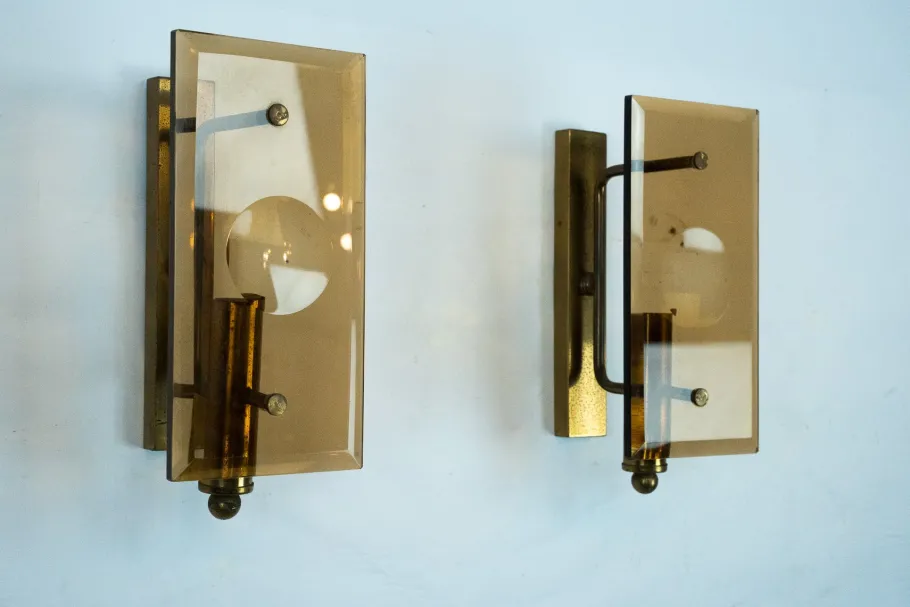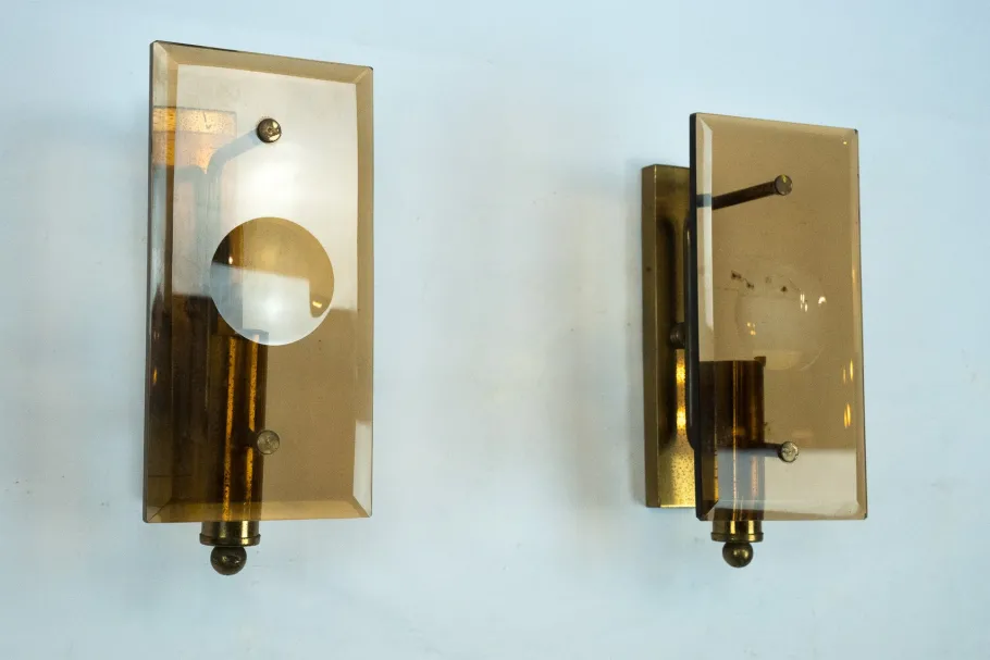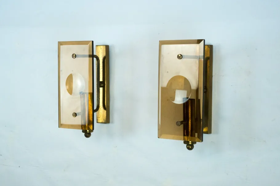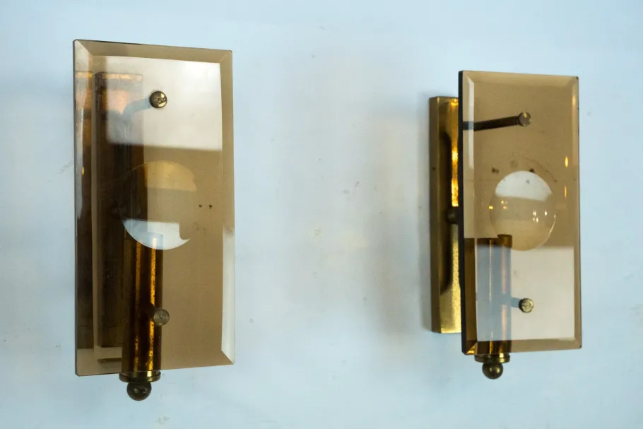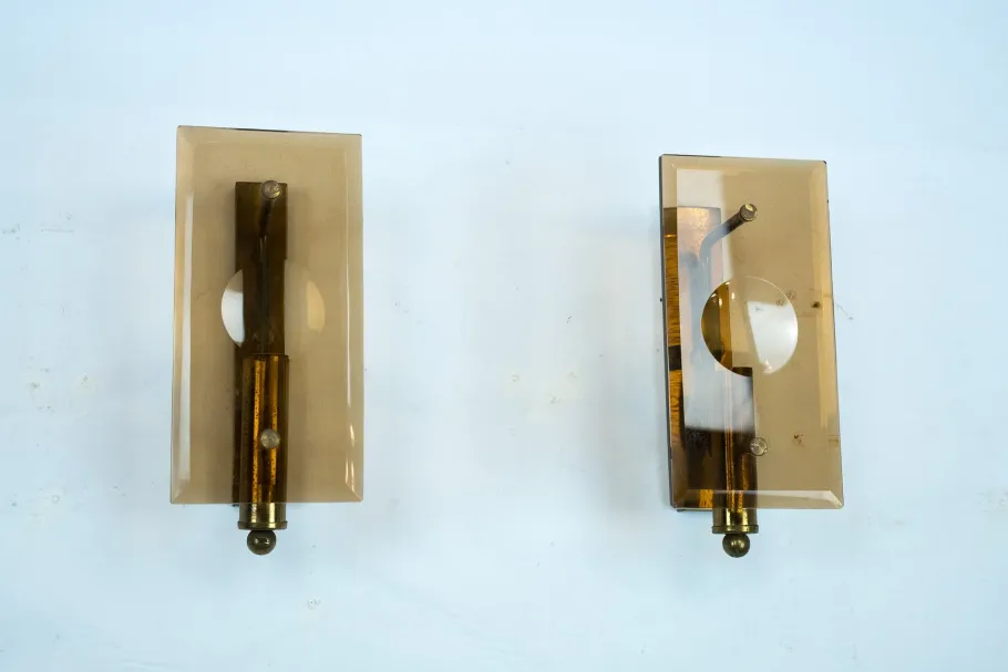 | Restoration and Damage Details | Light wear consistent with age and use, Set of two sconces reminiscent of the style of Cristal Art and produced in Italy during the 60s. They are made of thick amber glass and brass with original patina and dots. The glasses are in perfect condition. Each sconce mounts a socket for E14 bulb. |