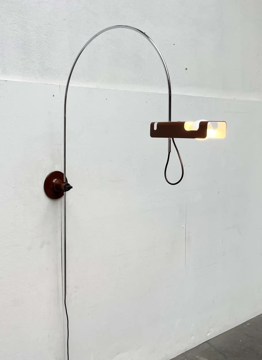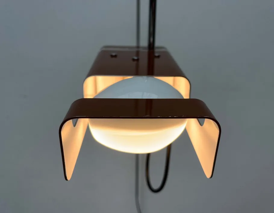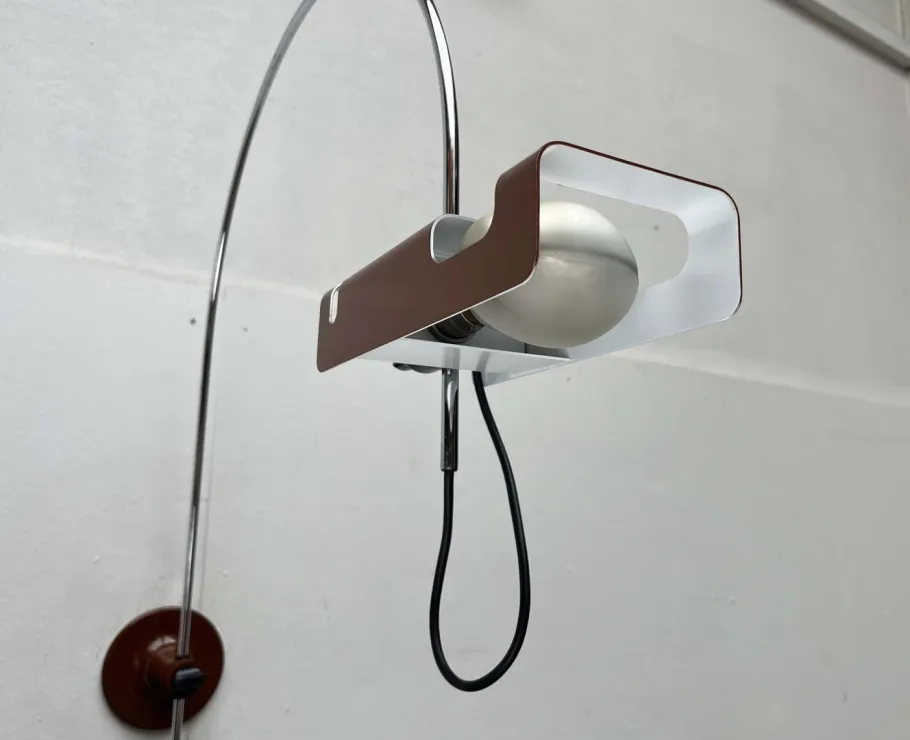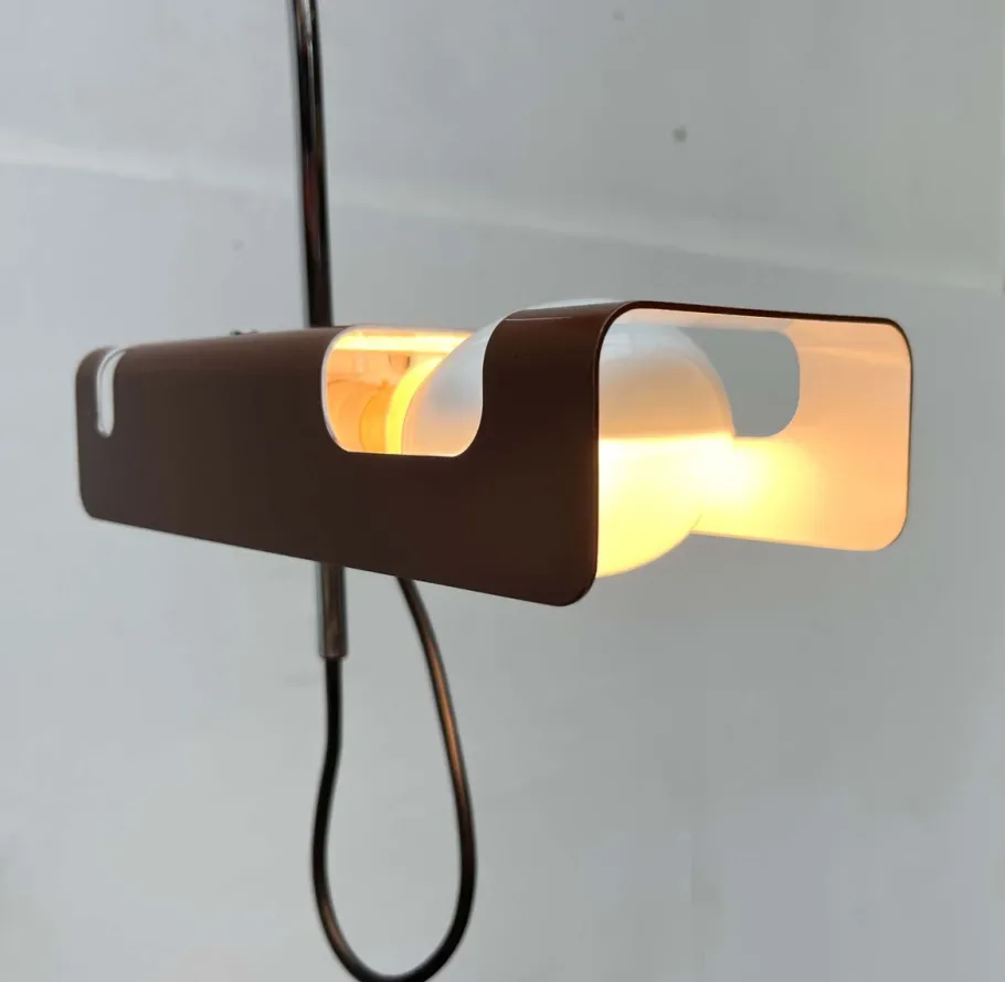 Another Colombo design that was ahead of its time. The lamp head consists of a folded metal element and is perforated with cutouts. The shaft penetrates the reflector through one of these slots. The head is painted brown and can be rotated and tilted within a certain range. It is secured with a plastic screw. The push button switch is located on the back of the head. The finely crafted chrome shaft forms a wide base. The rear section of the shaft is guided in a wall bracket and runs parallel to the wall. The wall bracket is trumpet-shaped and matches the color of the lamp head. The shaft is height-adjustable. The position is secured with a black screw. The cable exits visibly from the bottom of the shaft. A key design element of the design is the light source (not included). The upper opening in the shade is designed to accommodate a Cornalux bulb. This special bulb is now also available as an LED.