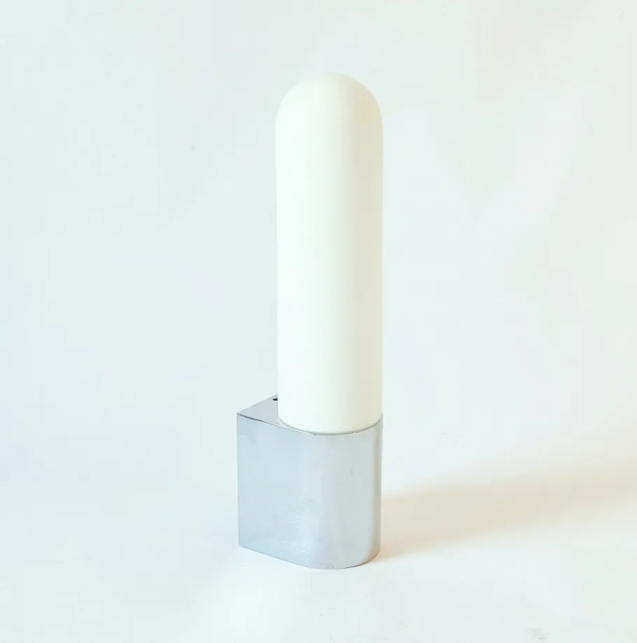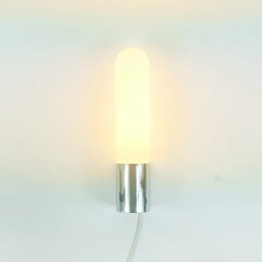 Cleaned, rewired (hardwired) and ready to use (compatible in all countries Europe, US, UK, etc.). Each wall lamp requires 1x E27 tubular light bulb (E26 in the US). LED compatible. Height: 32.5 cm/12.8”; width: 7 cm/2.7”; depth (from wall): 9 cm/3.5”. Very good vintage condition, light wear and patina consistent with age and use.