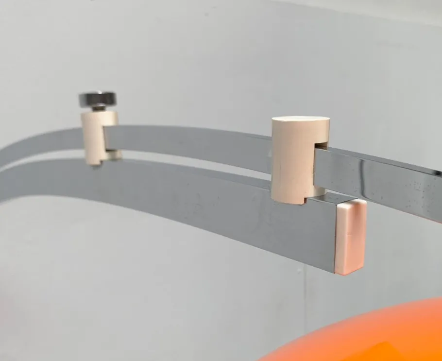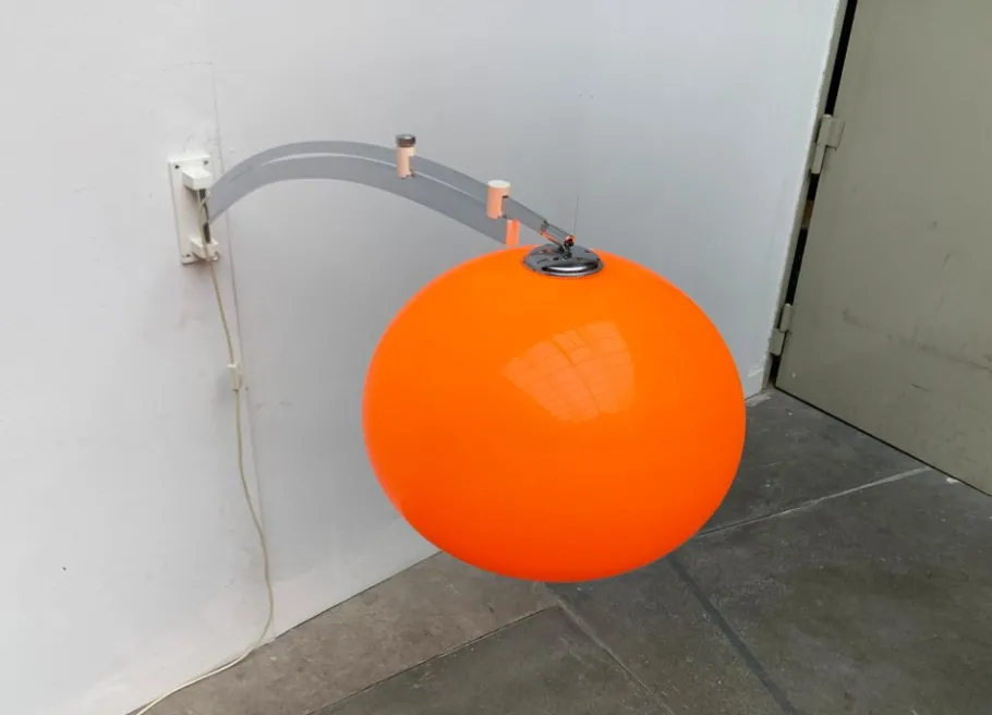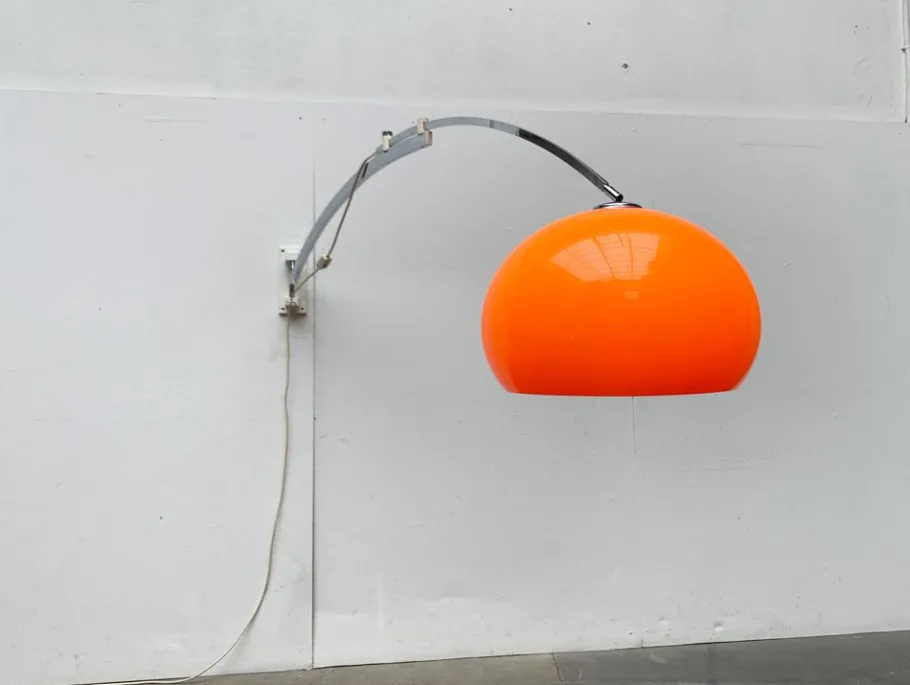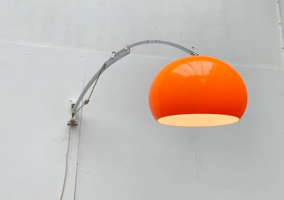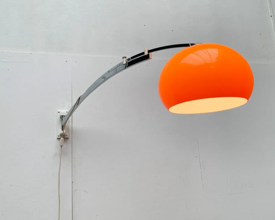The classic shade in orange is striking. It is white on the inside, so that the luminaire releases functional light. However, the special detail is the cantilever arm, with which a long distance can also be overcome. For example, you can take a remote table from the wall to a centrally illuminate and go through under the bow. The curved shaft is designed in two parts. The lower part is connected to the wall base and swiveled. The upper part can be pulled out and glides into two guide elements above the lower shaft. The position is fixed with a knurled screw. The massive wall base is designed in white and is mounted with four screws. A movable bracket serves as a cable routing. The umbrella can be aligned or straightened at a certain angle via a joint. The lamp has a cord switch.