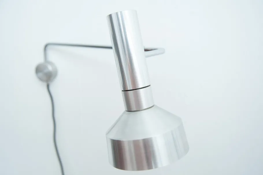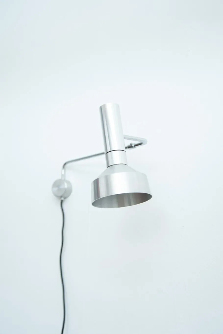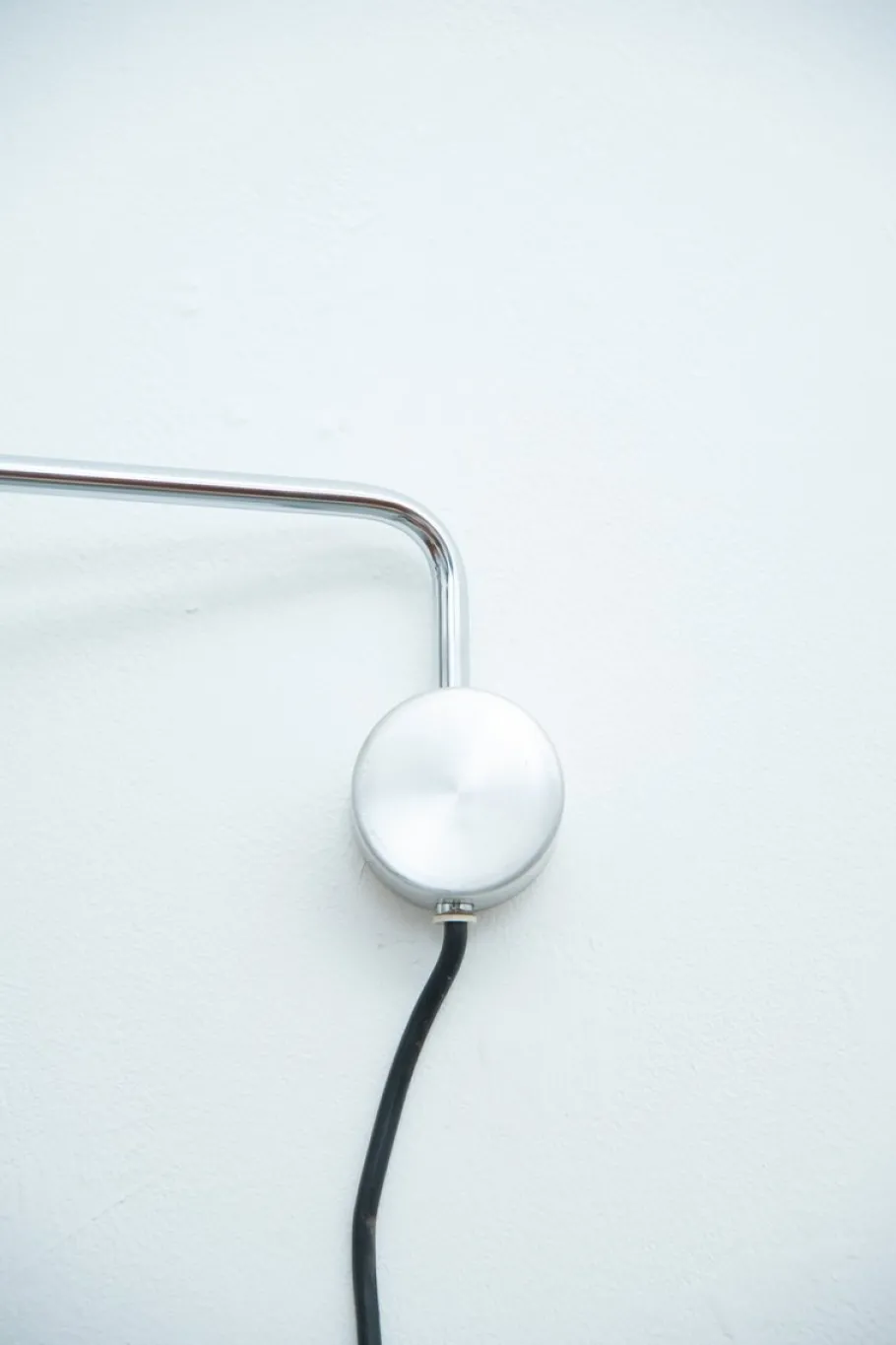 It is connected to a movable, chrome-plated arm that pivots in a wall bracket and can be positioned in a variety of positions using joints.