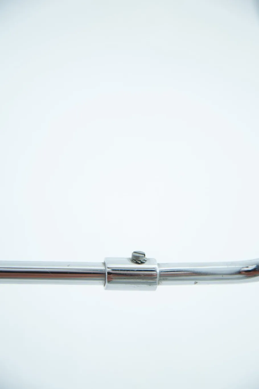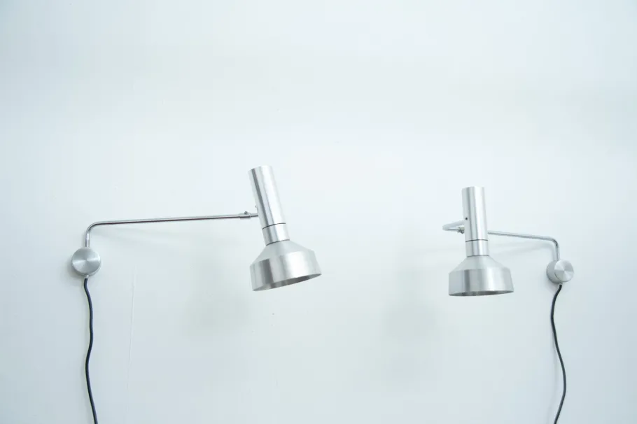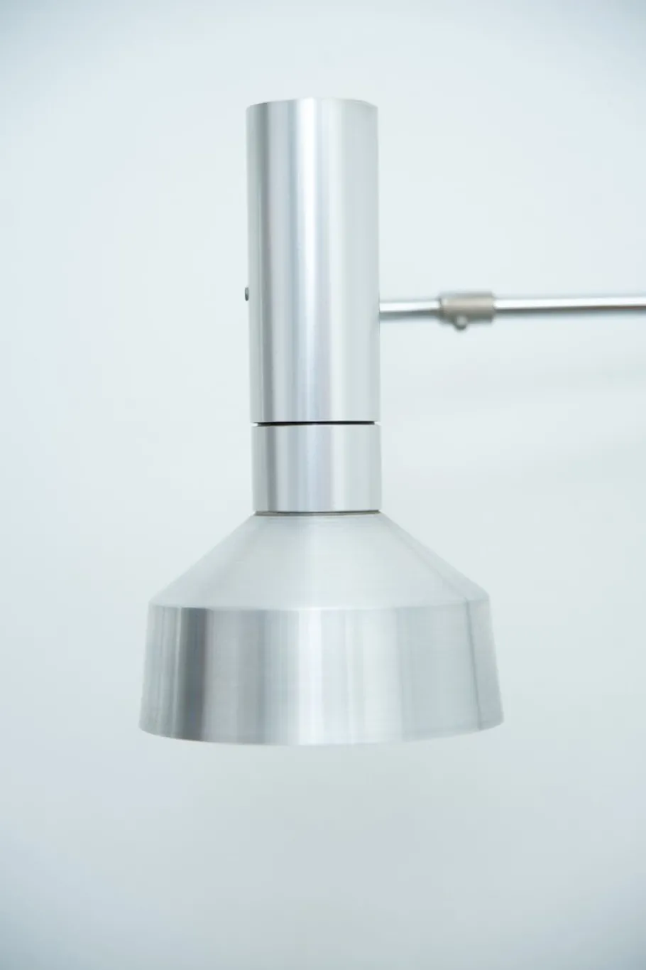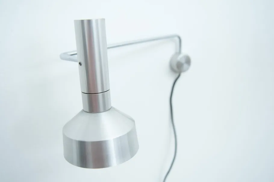 It is connected to a movable, chrome-plated arm that pivots in a wall bracket and can be positioned in a variety of positions using joints.
