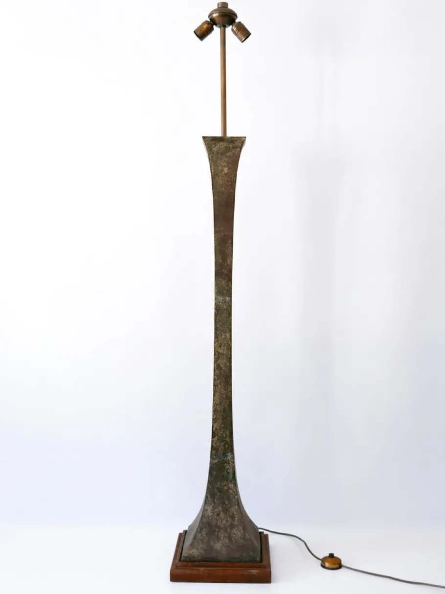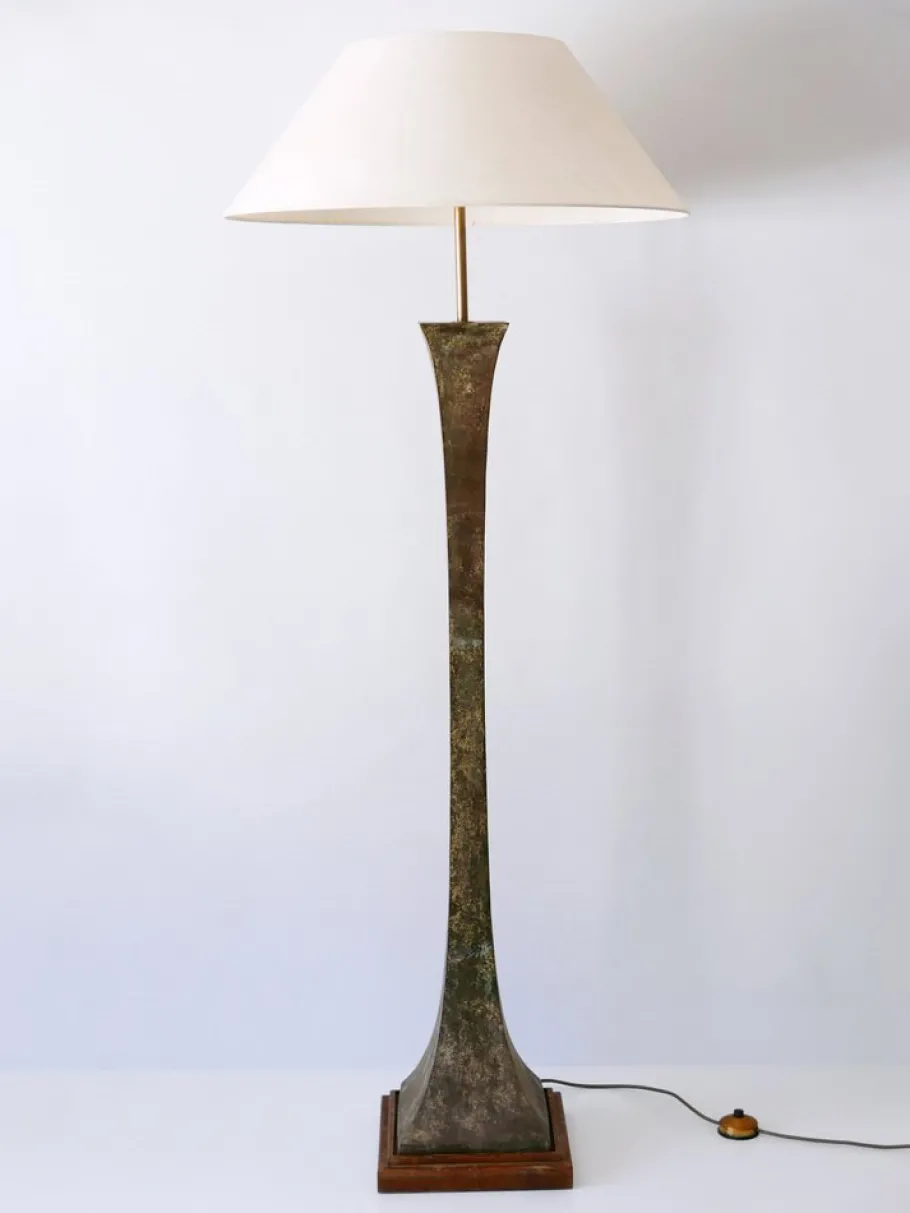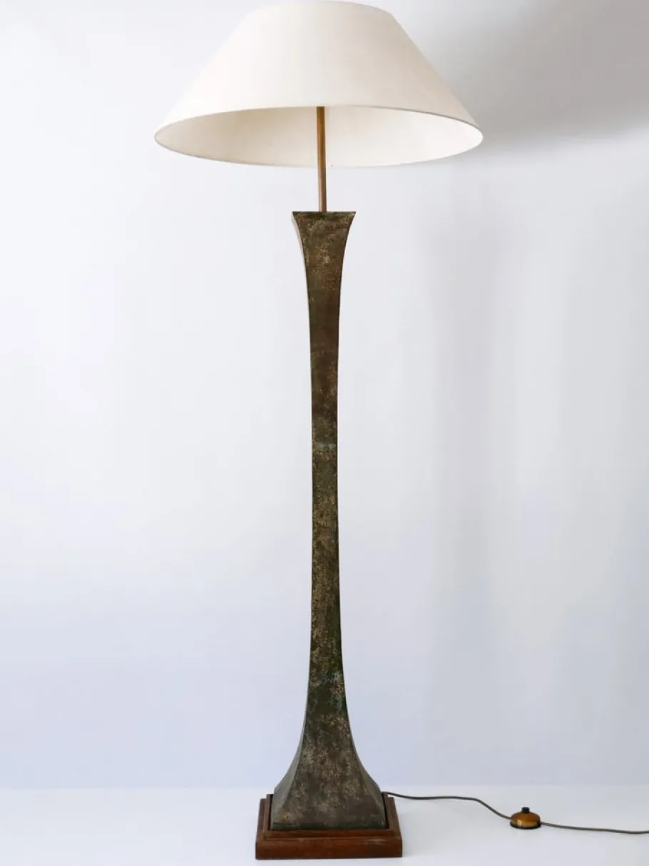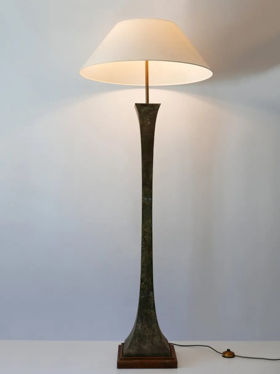 Executed in verdigris bronze, brass and wood; the floor lamp comes with 2 x E27 / E26 screw fit bulb holders, are wired and in working condition and run both on 110 / 230 volt.