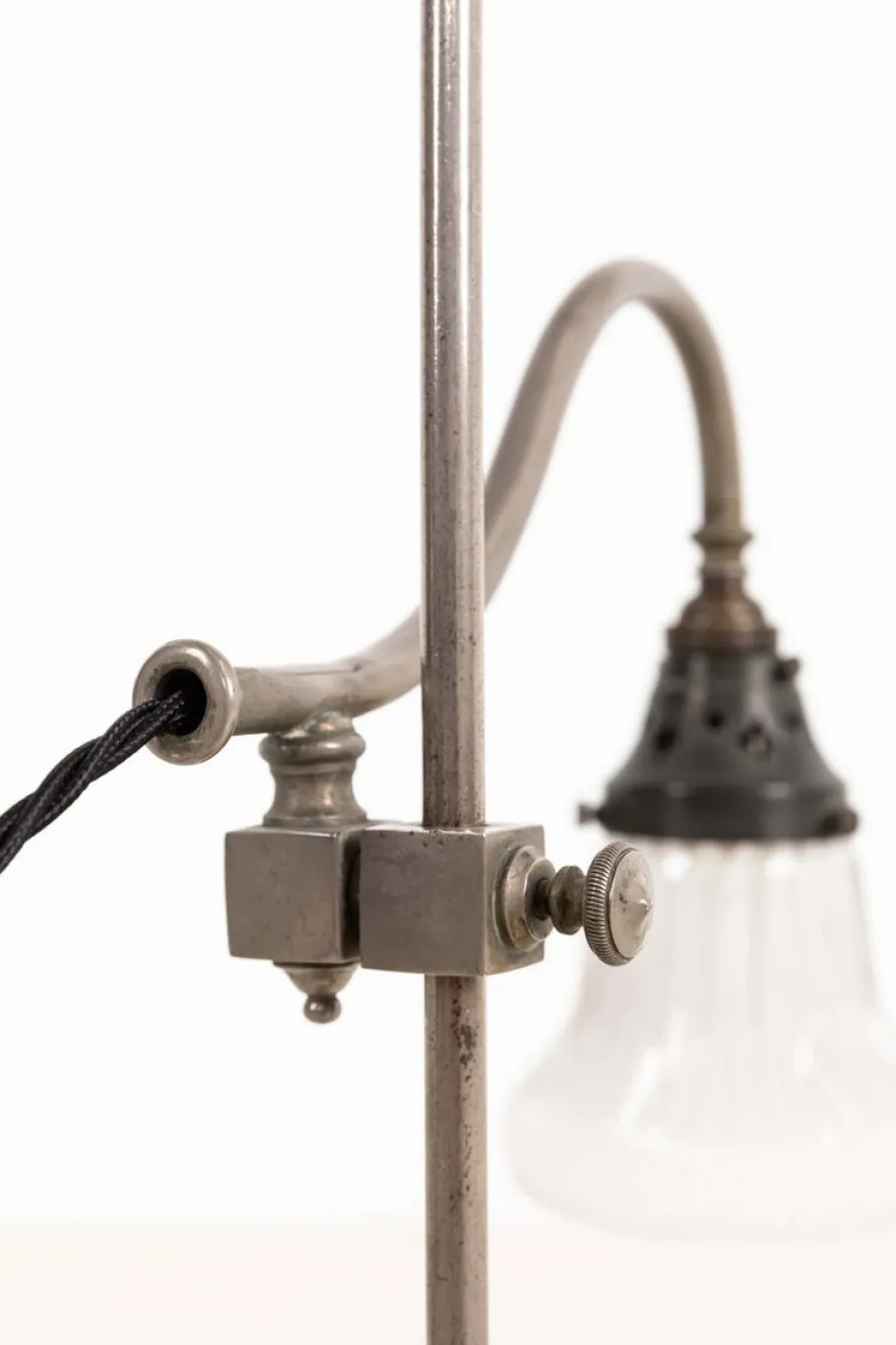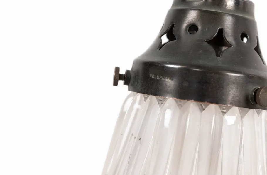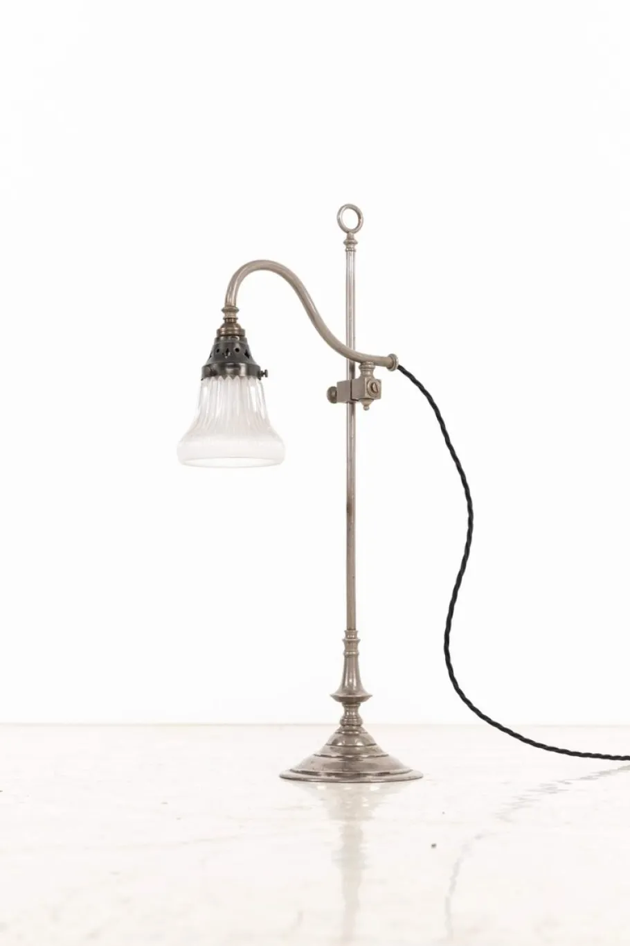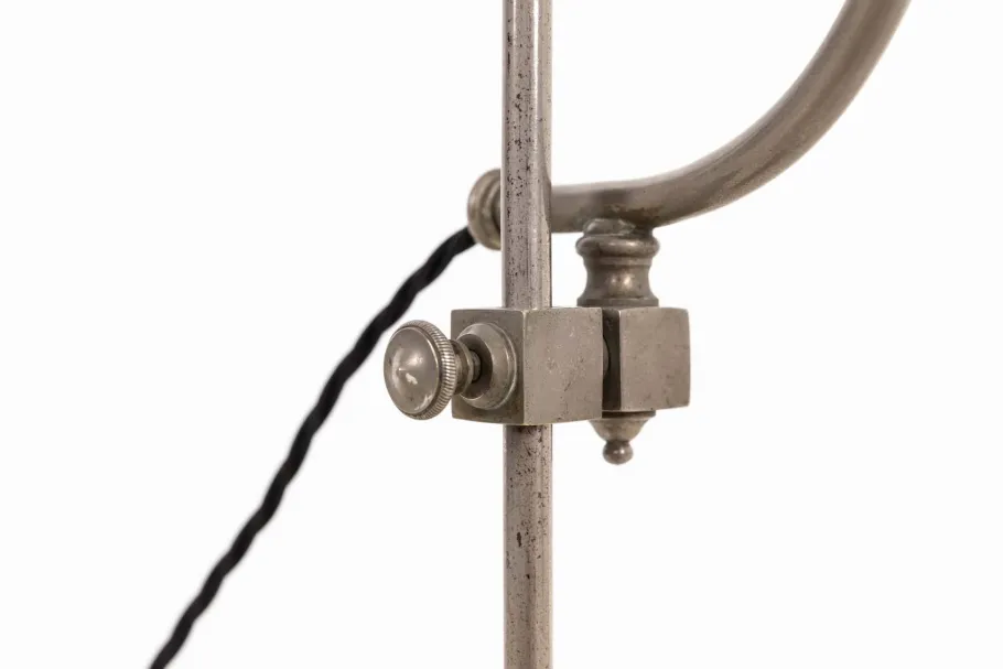 A very high quality piece, presented in excellent original condition, this lamp is crafted from nickel plated brass with a beautifully aged patina throughout. Its substantial base provides stability, while a loop at the top allows for easy portability. The shade height is adjustable along the stem. Complete with diminutive Holophane shade.