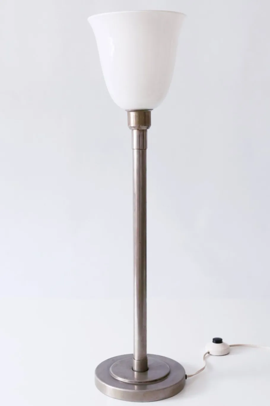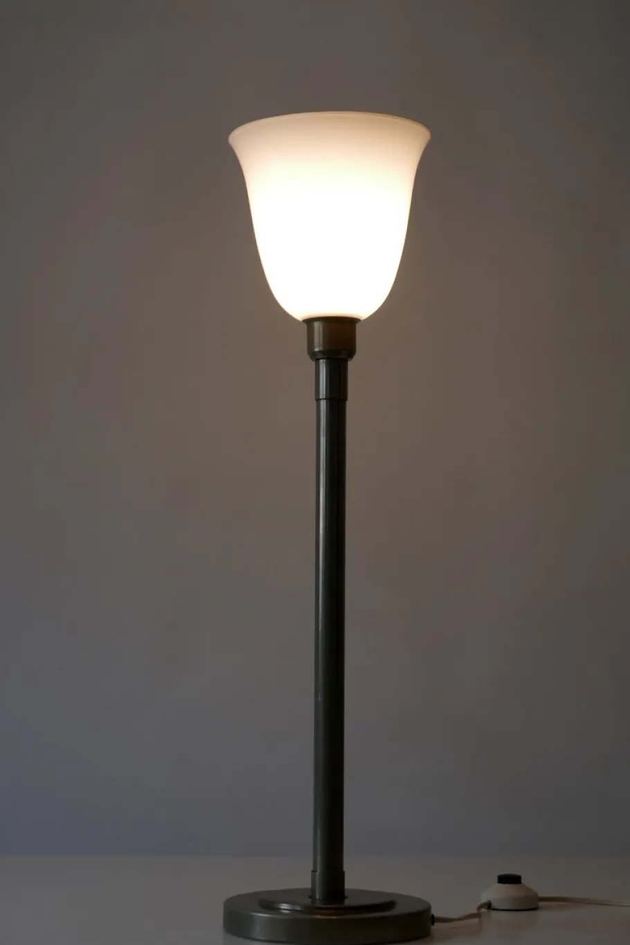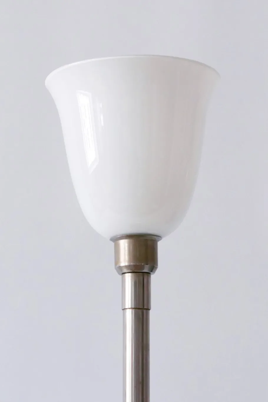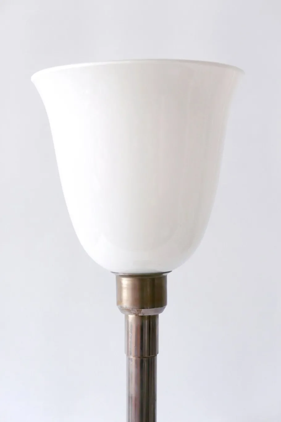 Executed in nickel-plated brass and opaline glass, the lamp needs 1 x E27 / E 26 Edison screw fit bulb, is wired, and in working condition. It runs both on 110 / 230 volt. Interrupter on the cord.