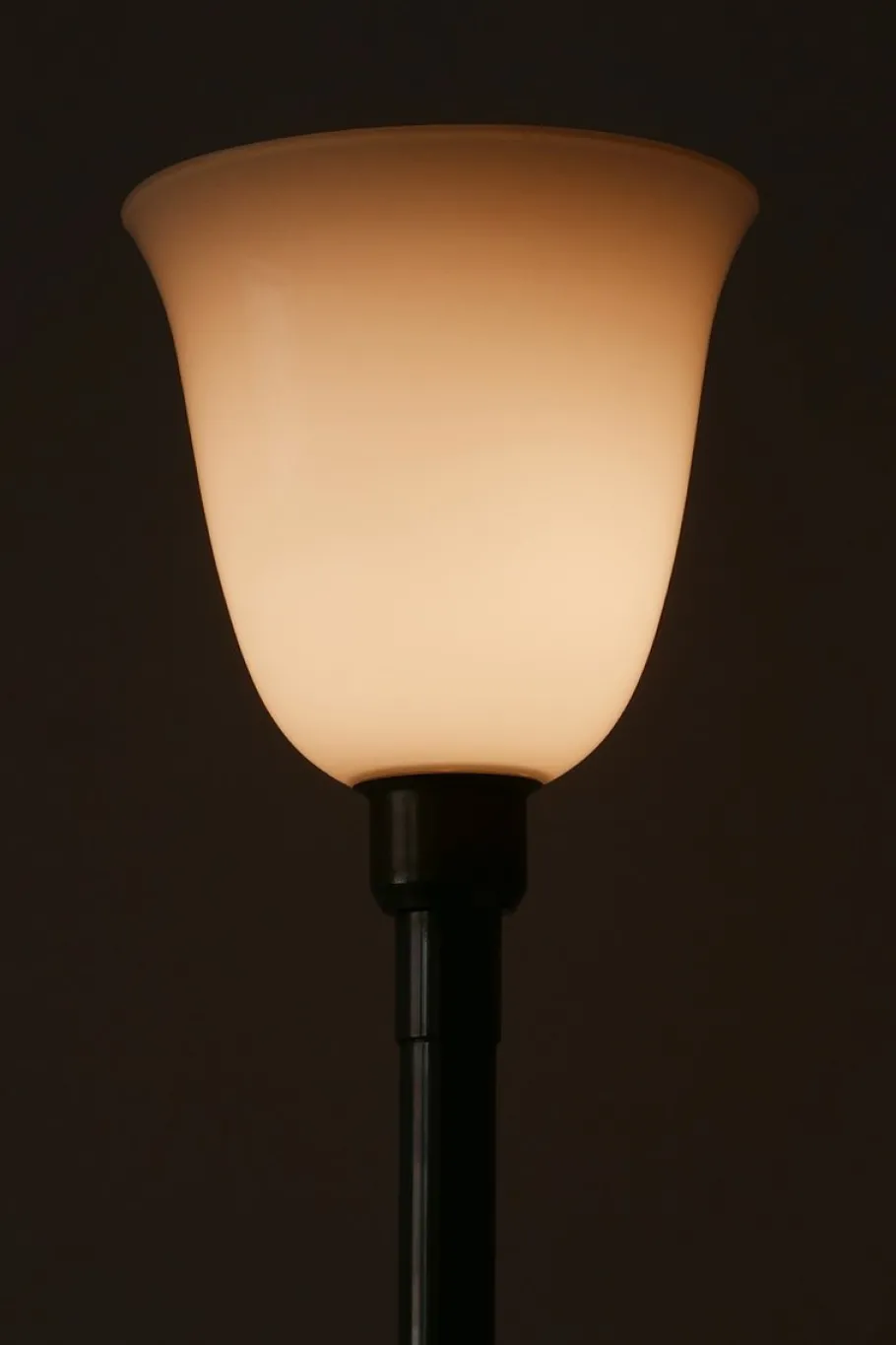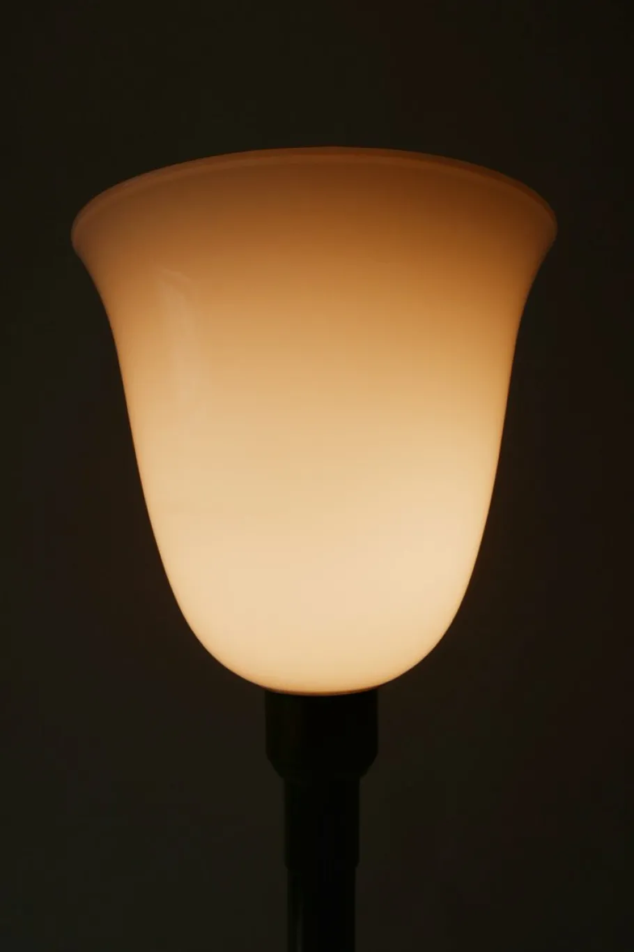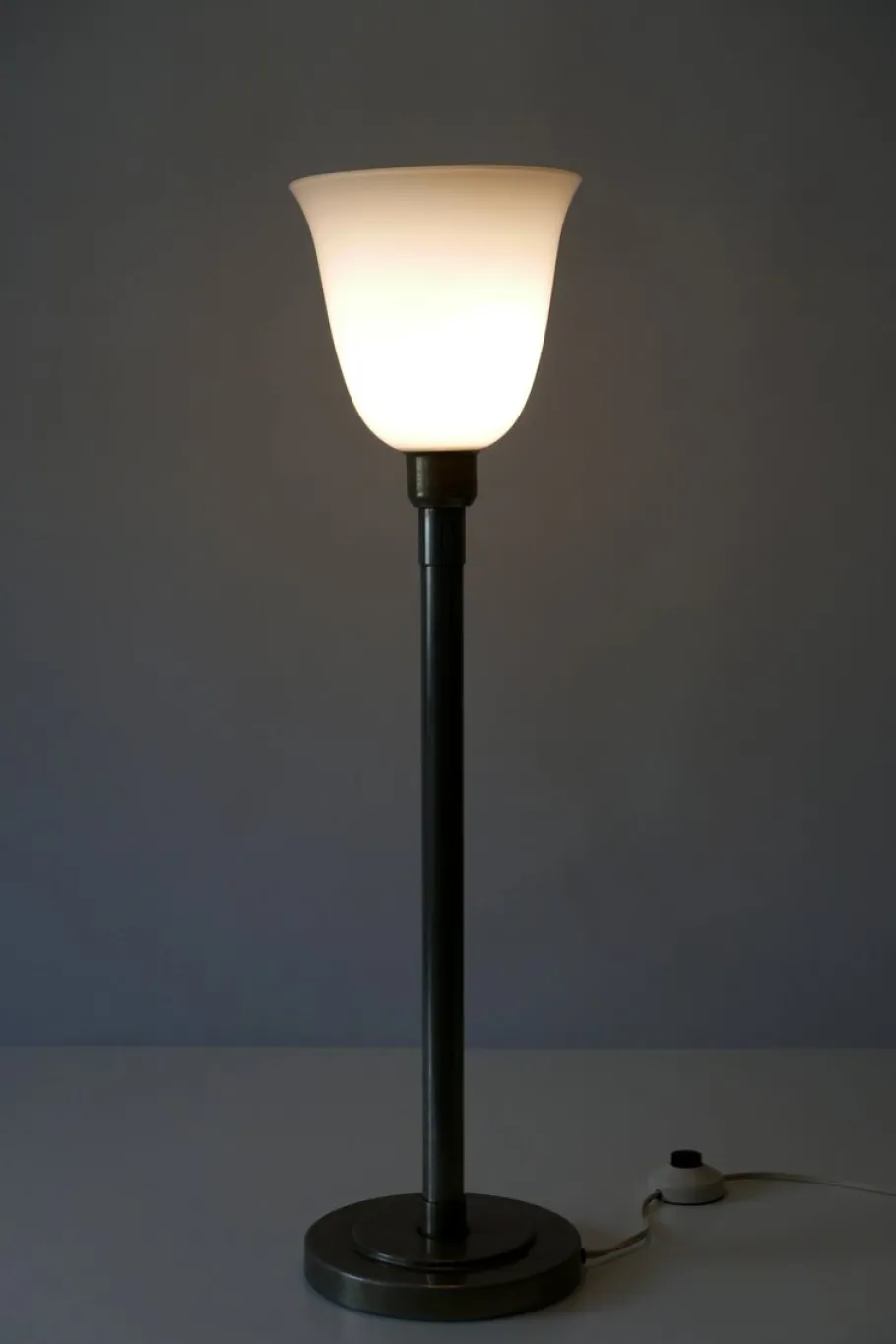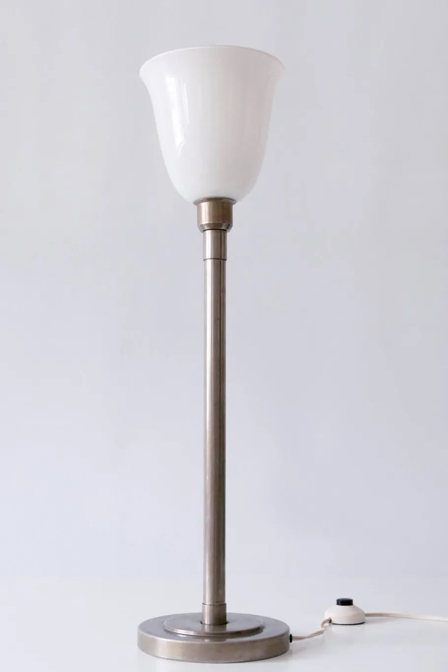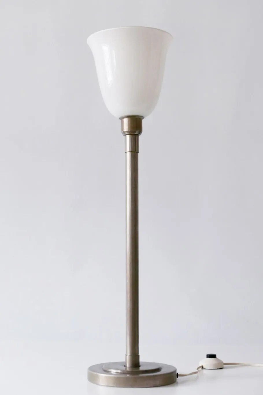 Executed in nickel-plated brass and opaline glass, the lamp needs 1 x E27 / E 26 Edison screw fit bulb, is wired, and in working condition. It runs both on 110 / 230 volt. Interrupter on the cord.