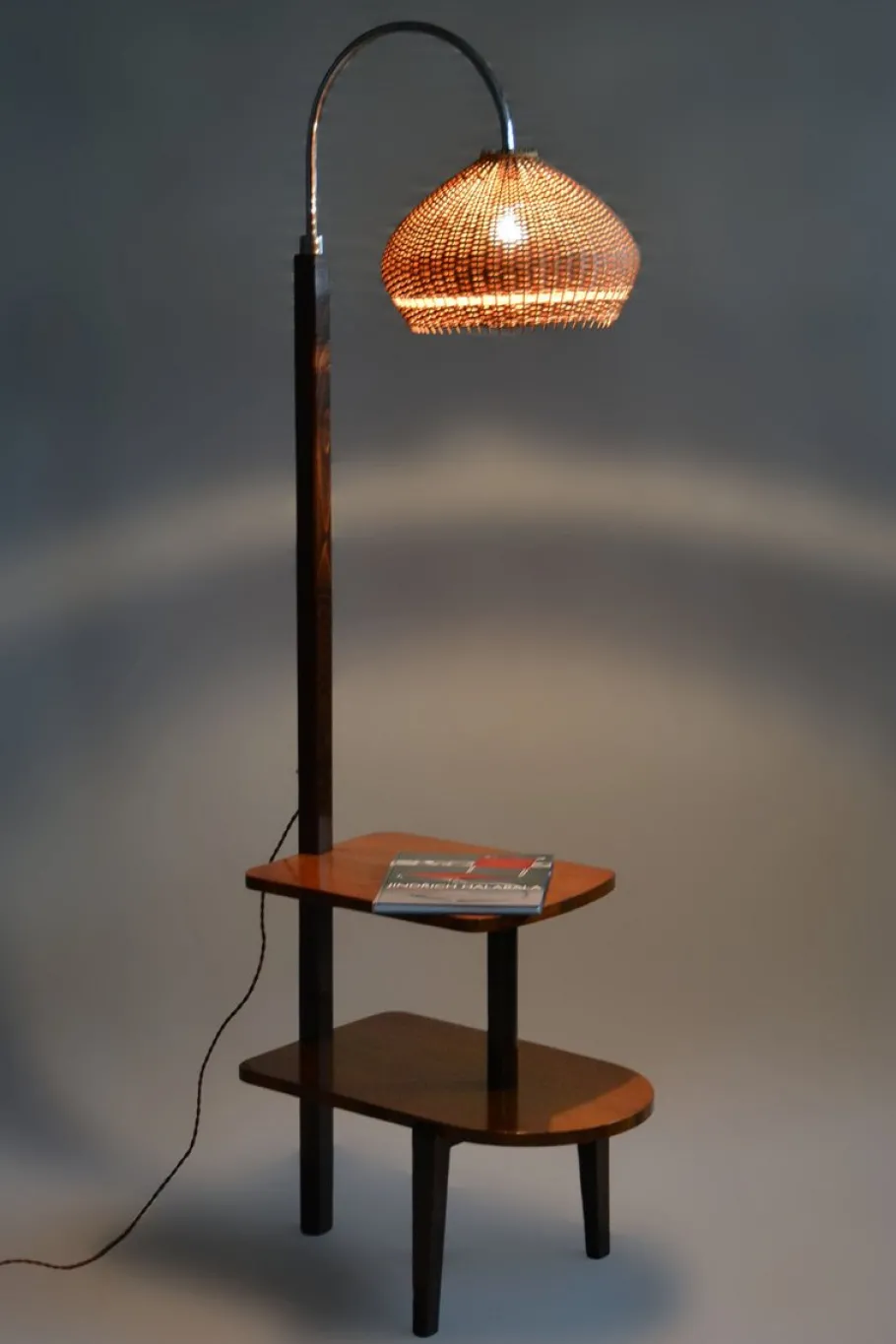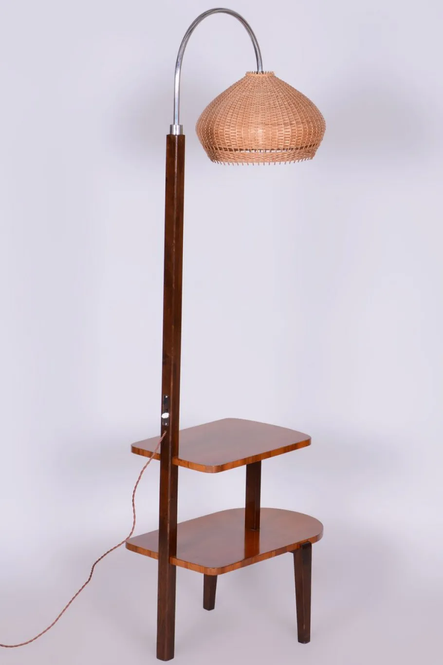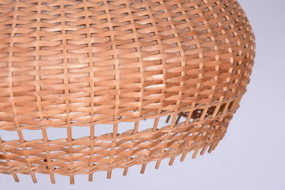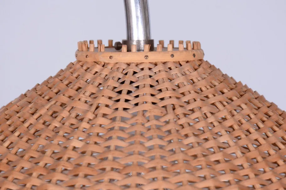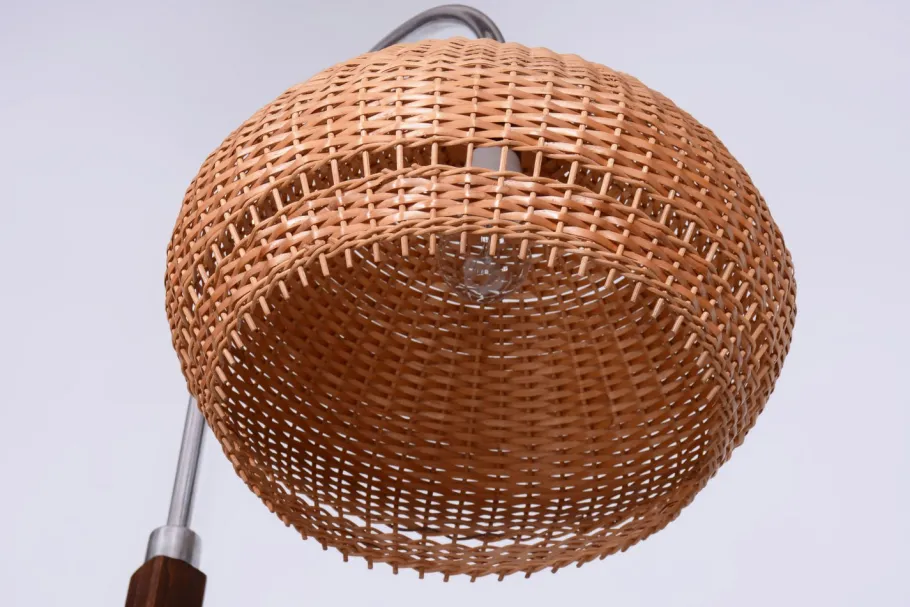 It is crafted from beech and cherry wood, featuring its original rattan lampshade. The lamp has been fully restored, with the original wood finish revived. It has also been newly electrified to ensure full functionality.