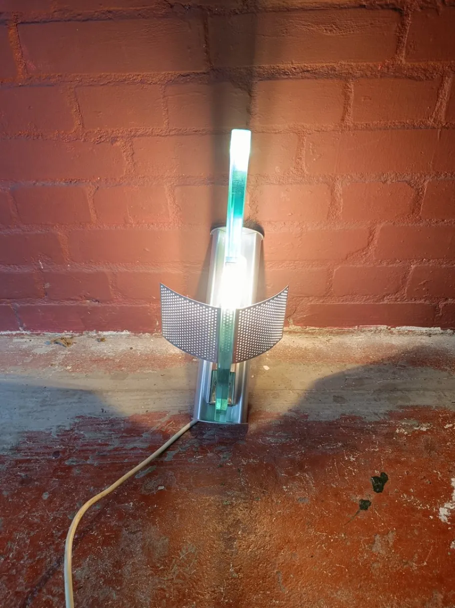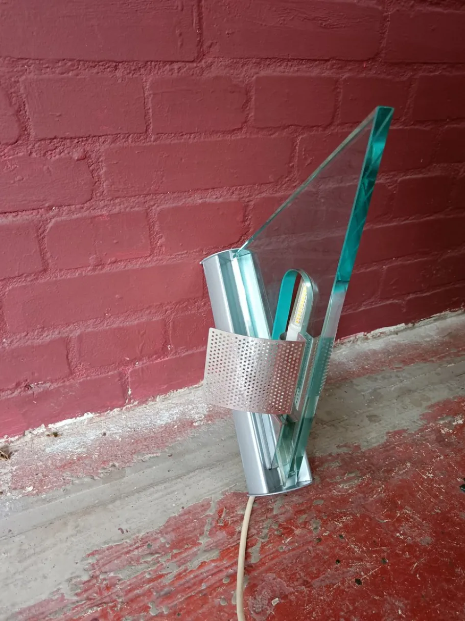 The frame is made of grey painted steel, the diffuser is made of perforated aluminium and the glasswork is thick ground glass.