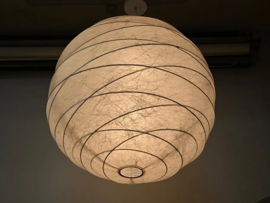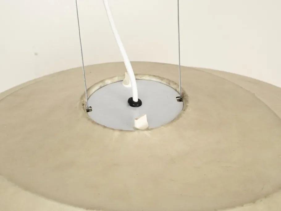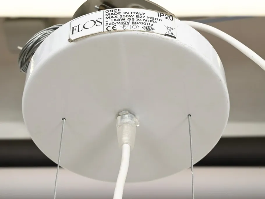 The chandelier has been professionally re-wired and is compatible with both US and EU/UK standards. It uses a total of three standard light bulbs: two E14 and one E27. The surface is crafted in a special synthetic resin, sprayed onto the metal structure and then solidified, resulting in a velvety and organic texture typical of the cocoon technique. This monumental piece is perfect for large, modern and minimalist interiors, where it becomes both a functional light source and a striking decorative statement, showcasing Lissoni’s refined contemporary design and the timeless quality of Flos production.
