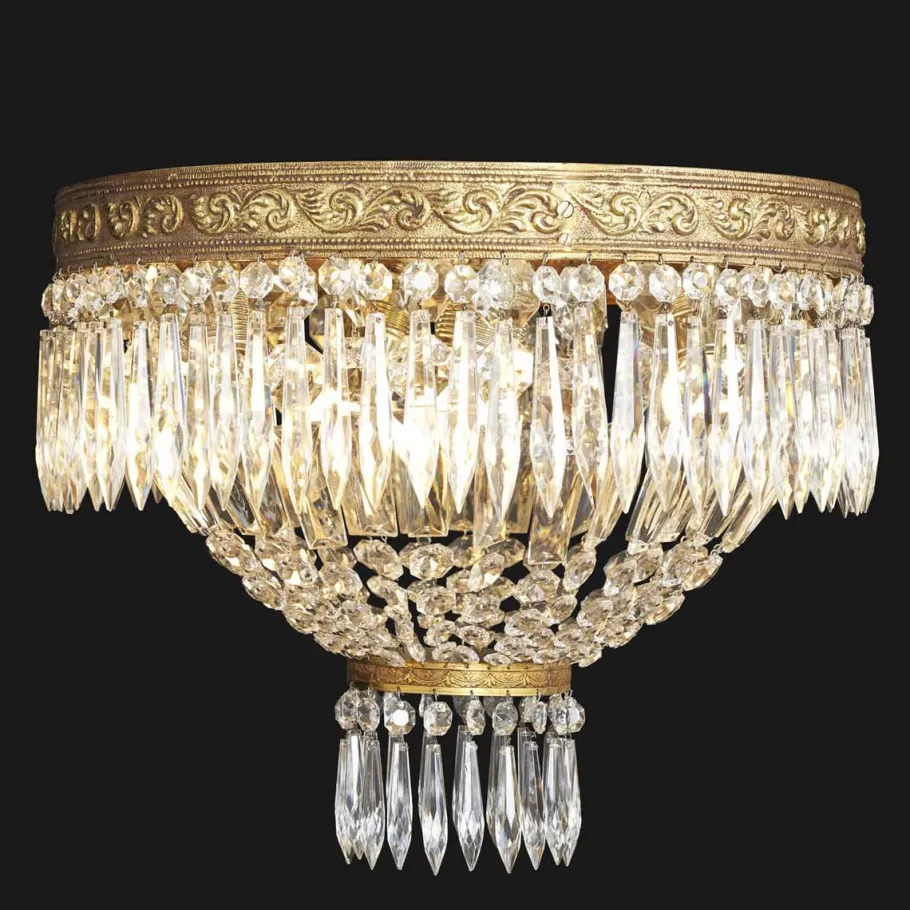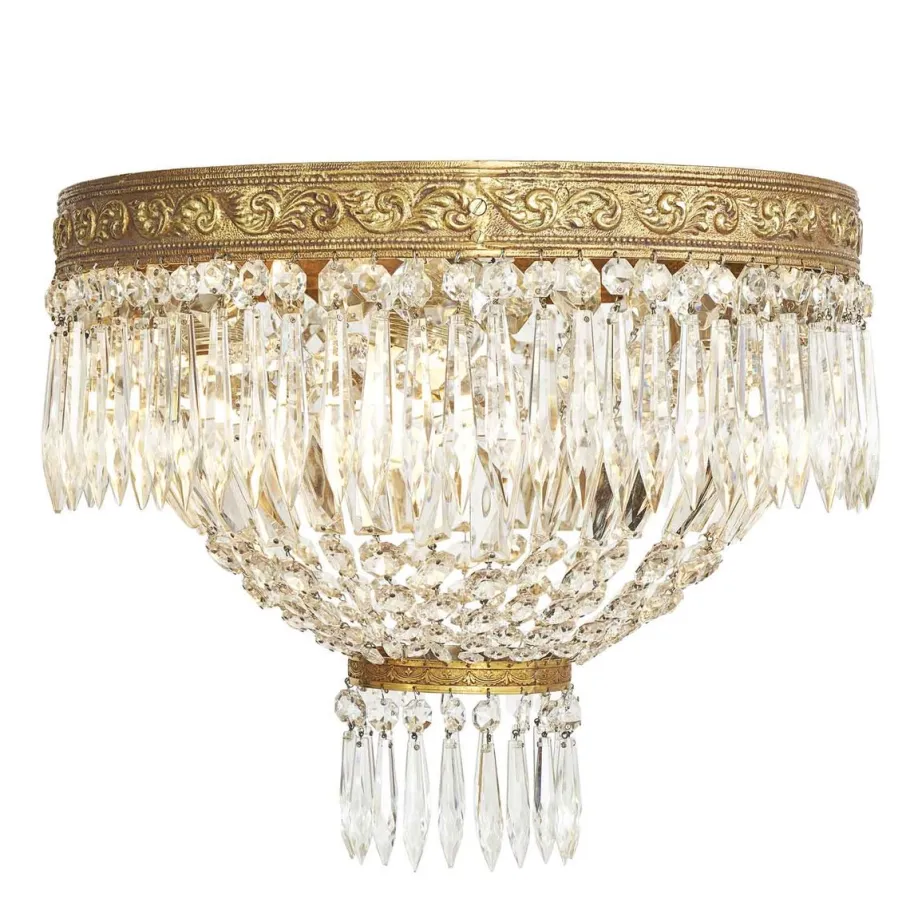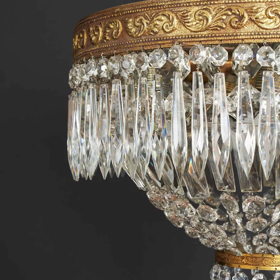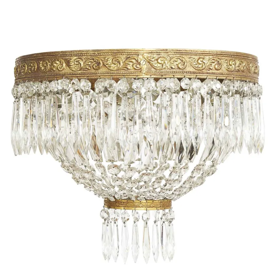 The refraction effect is superb; the light emanating from within the circular structure enhances the vibrant brilliance of the crystals in this late 20th-century ceiling light.