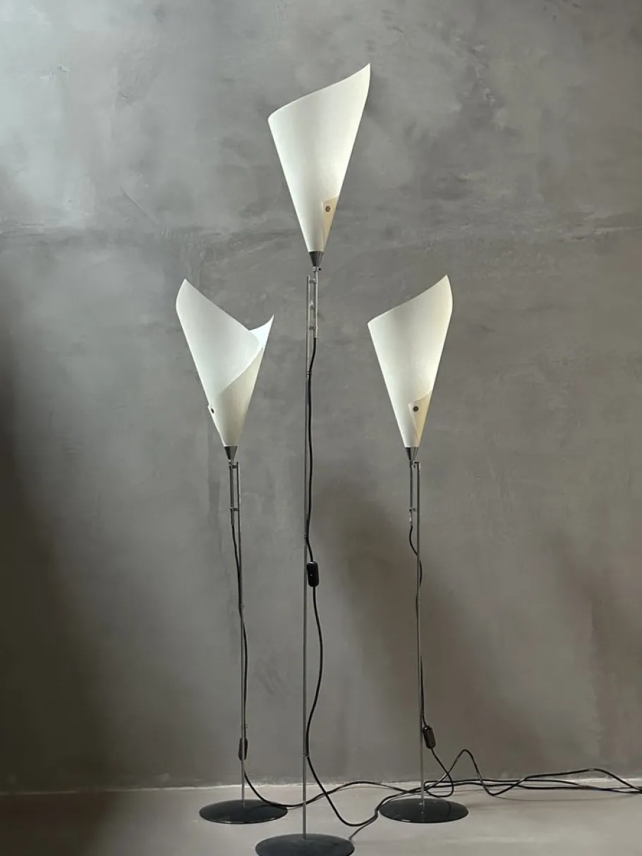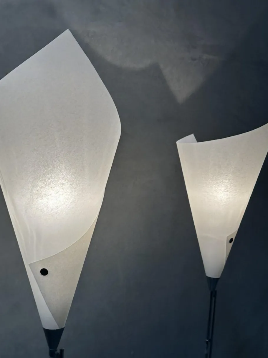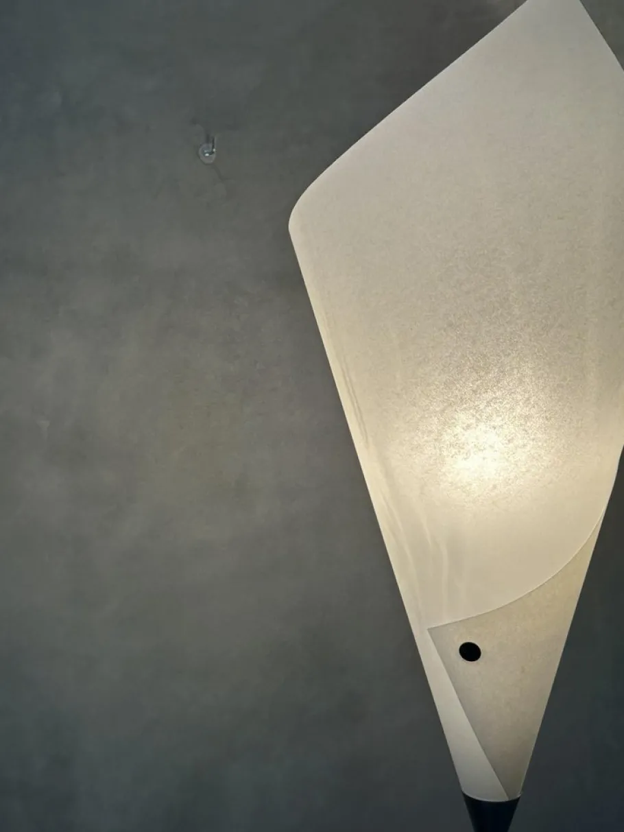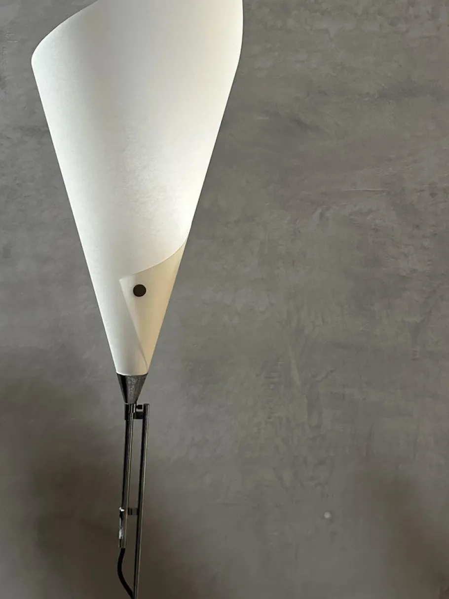Steel structure, black lacquered steel base and ivory parchment reflector.
