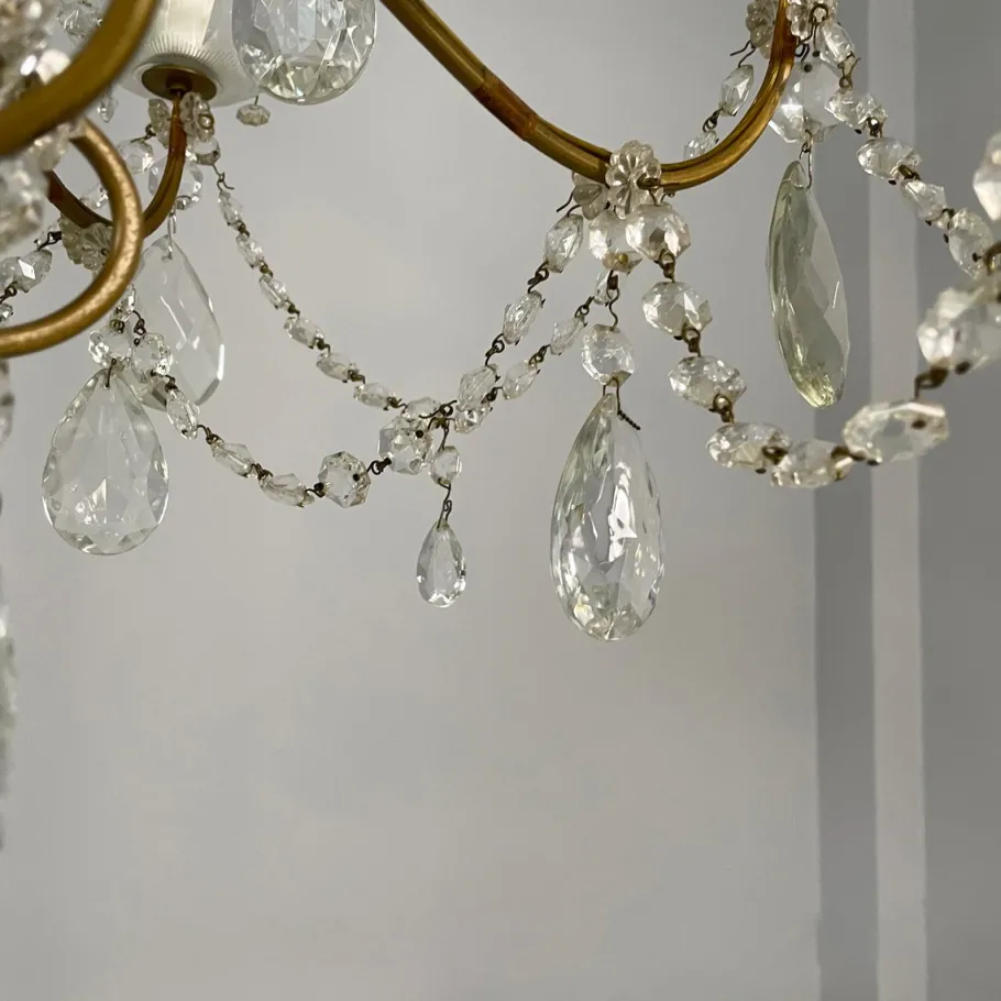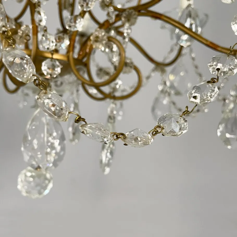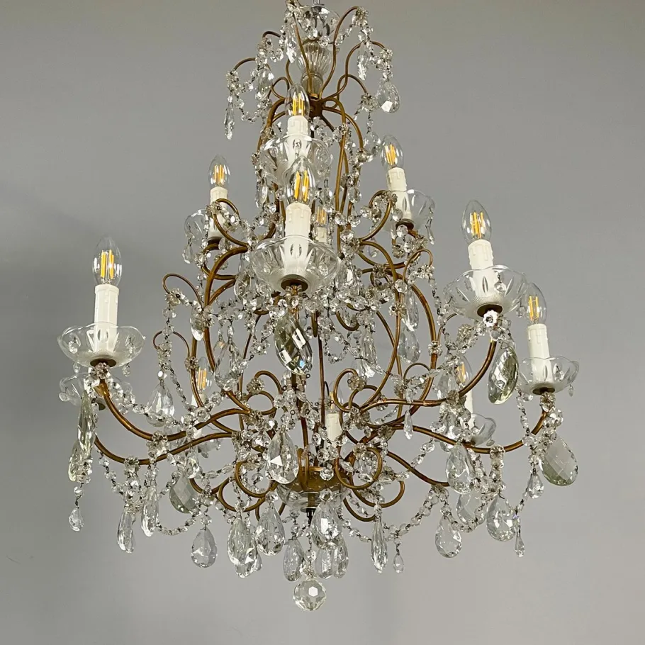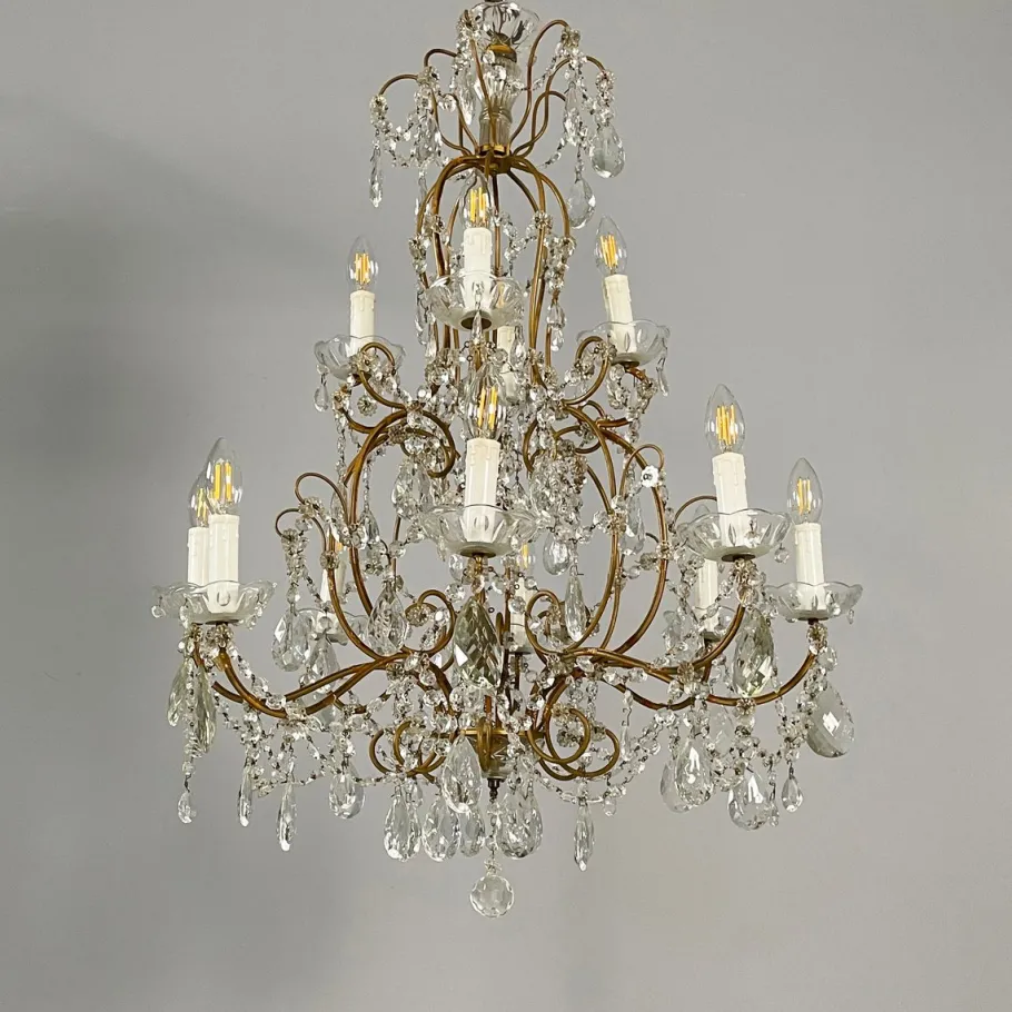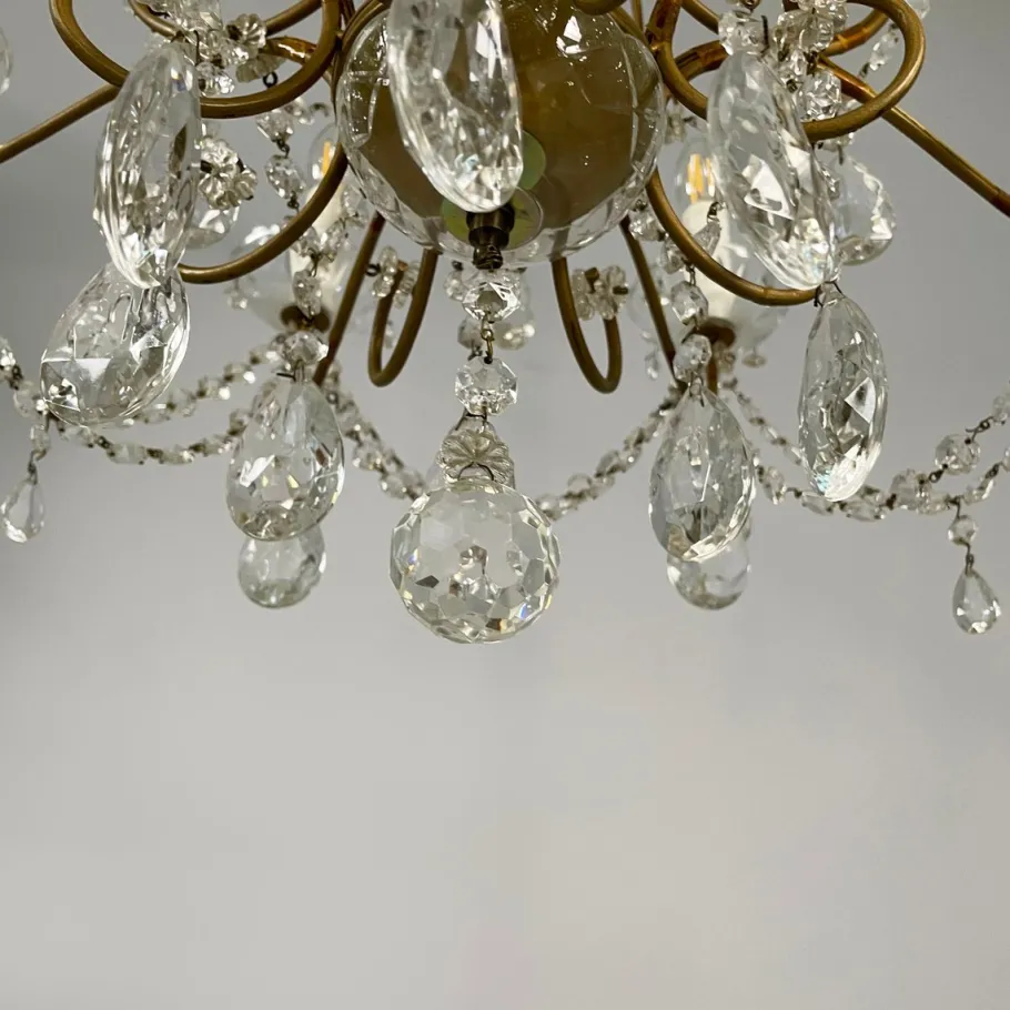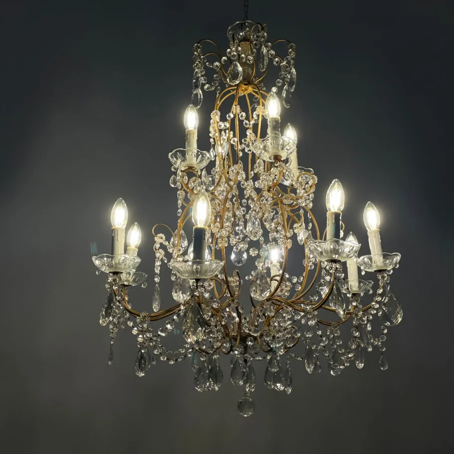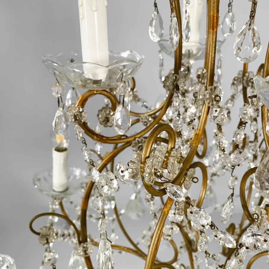 Drop chandelier with twelve candle-shaped lights, divided into two tiers. The structure is composed of several curved brass rods. Shaped glass drops and spheres are arranged throughout the structure, connected by decorative metal chains. The ceiling fixture is made of glass and metal.
