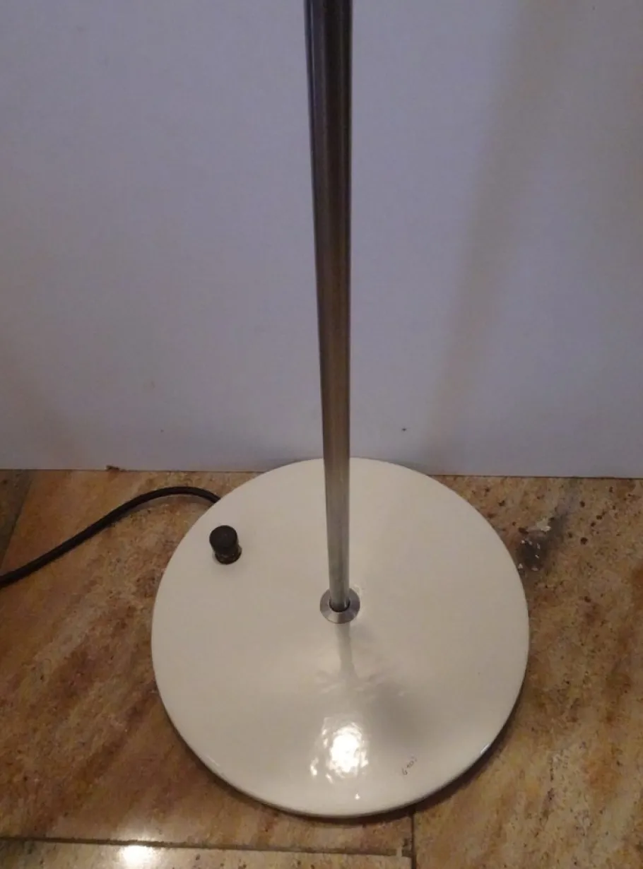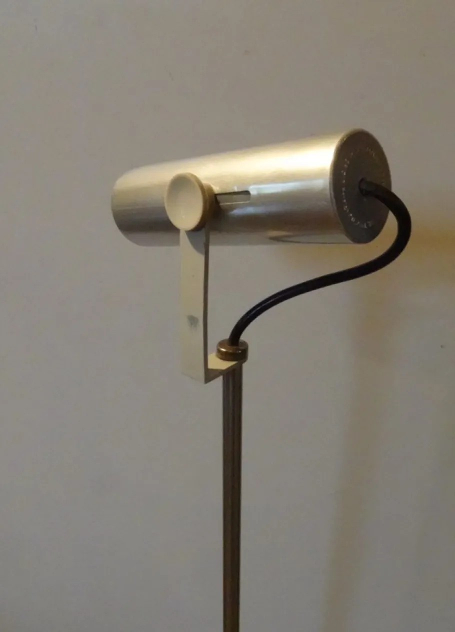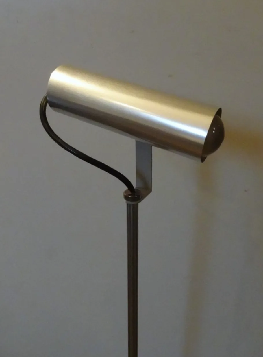 adjustable brushed aluminium shade on chromed rod and white lacquered base