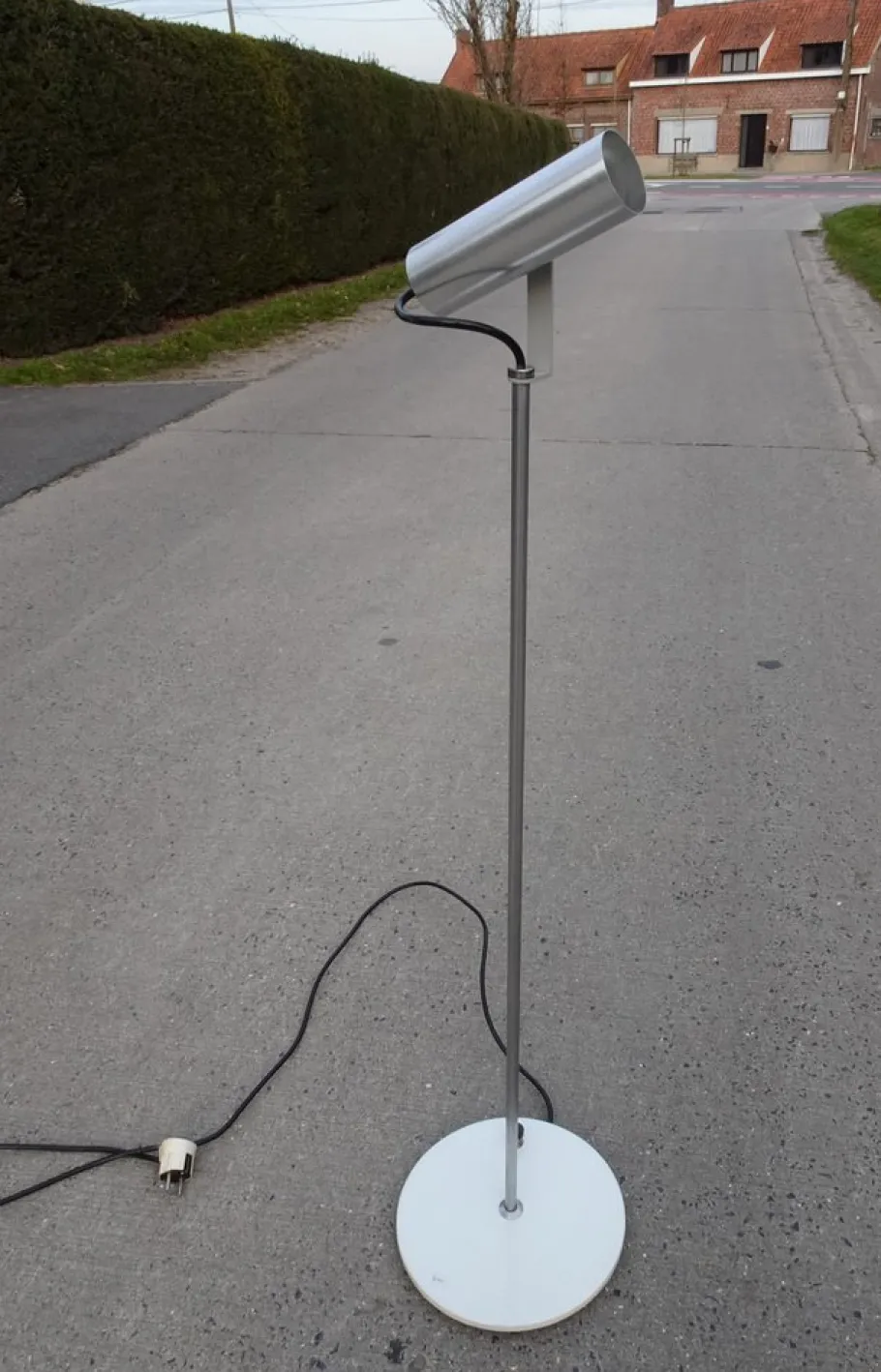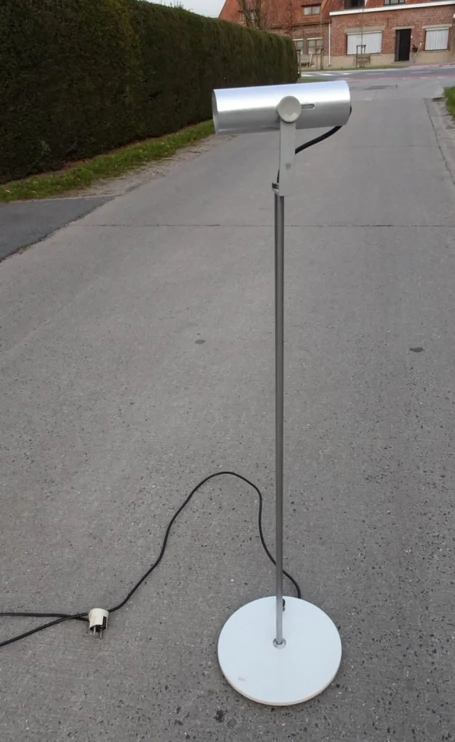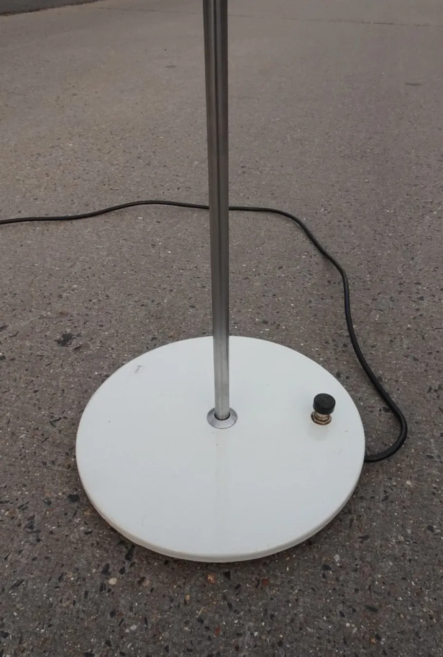 adjustable brushed aluminium shade on chromed rod and white lacquered base