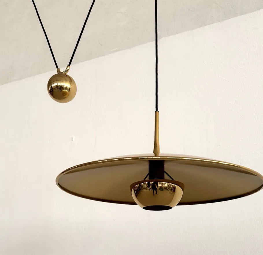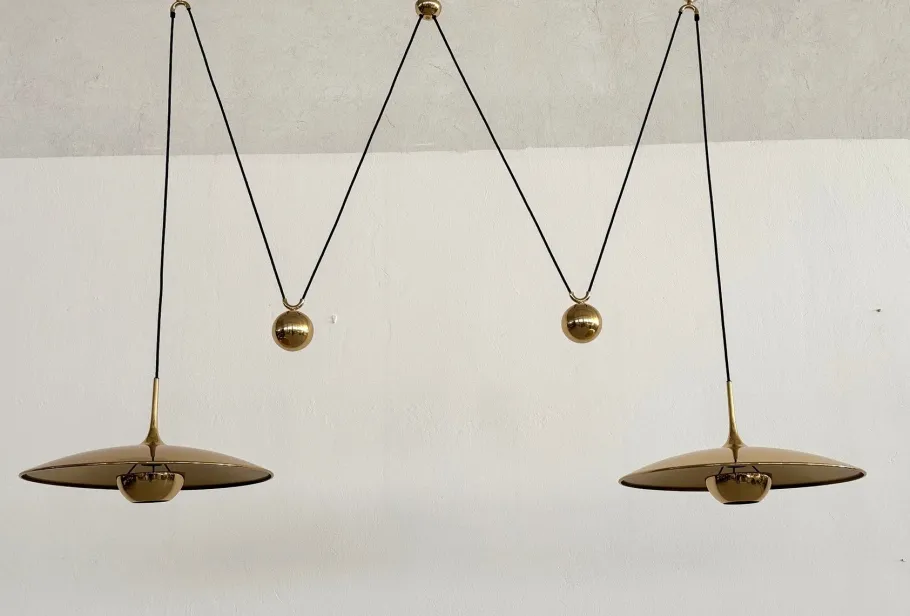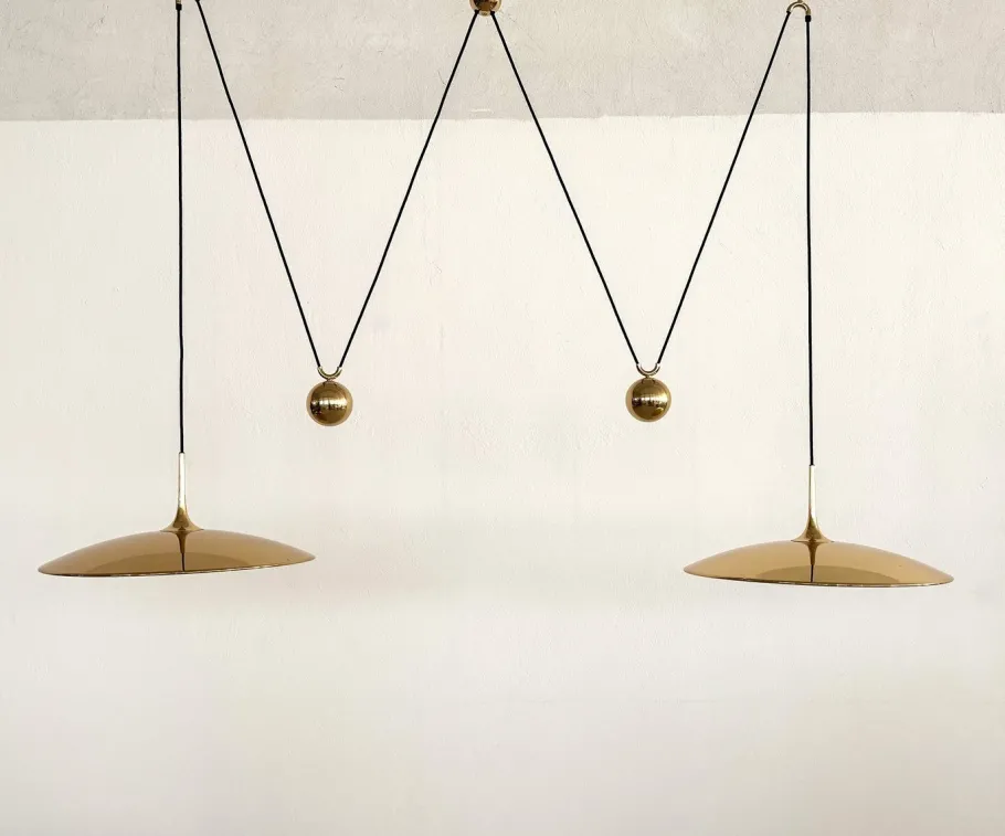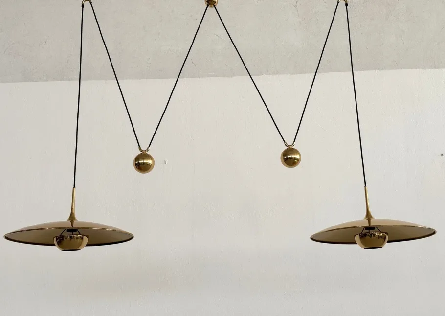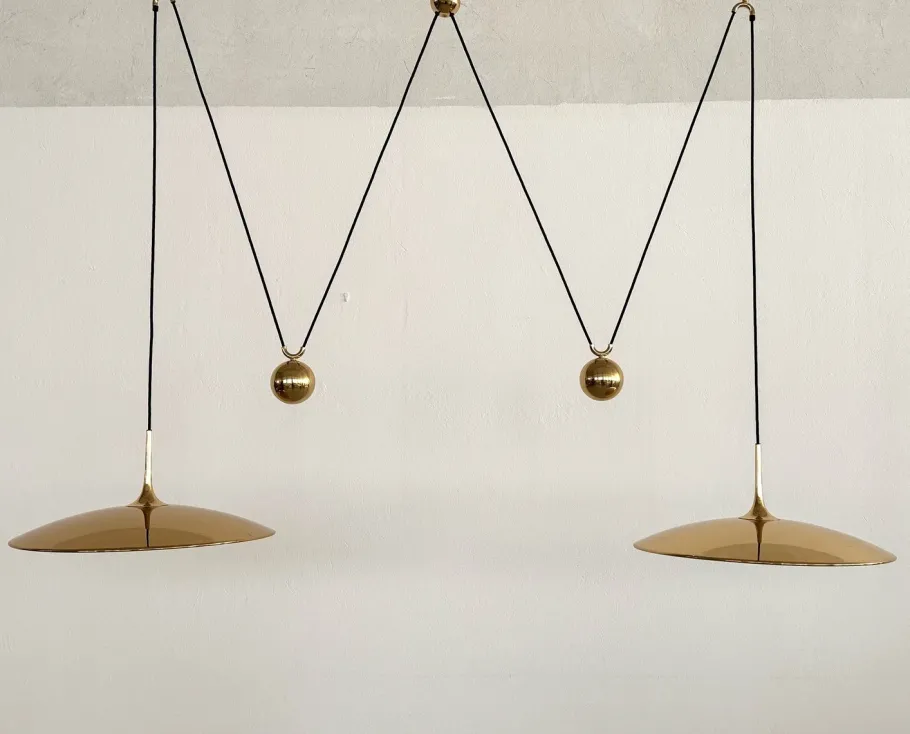 Both lights can be adjusted in height separately by pulling the brass spheres, the length of each cord is 2,80mt (110in).