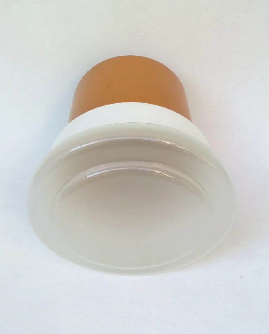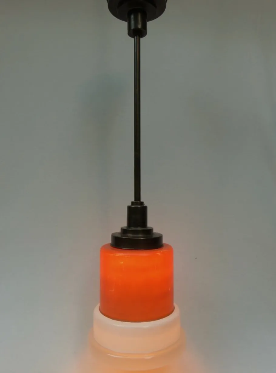 The combination of frosted glass, white overlay glass, and terracotta-colored (painted) glass creates a pleasant, glare-free ambient light, with the light primarily directed downwards.