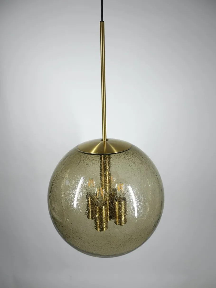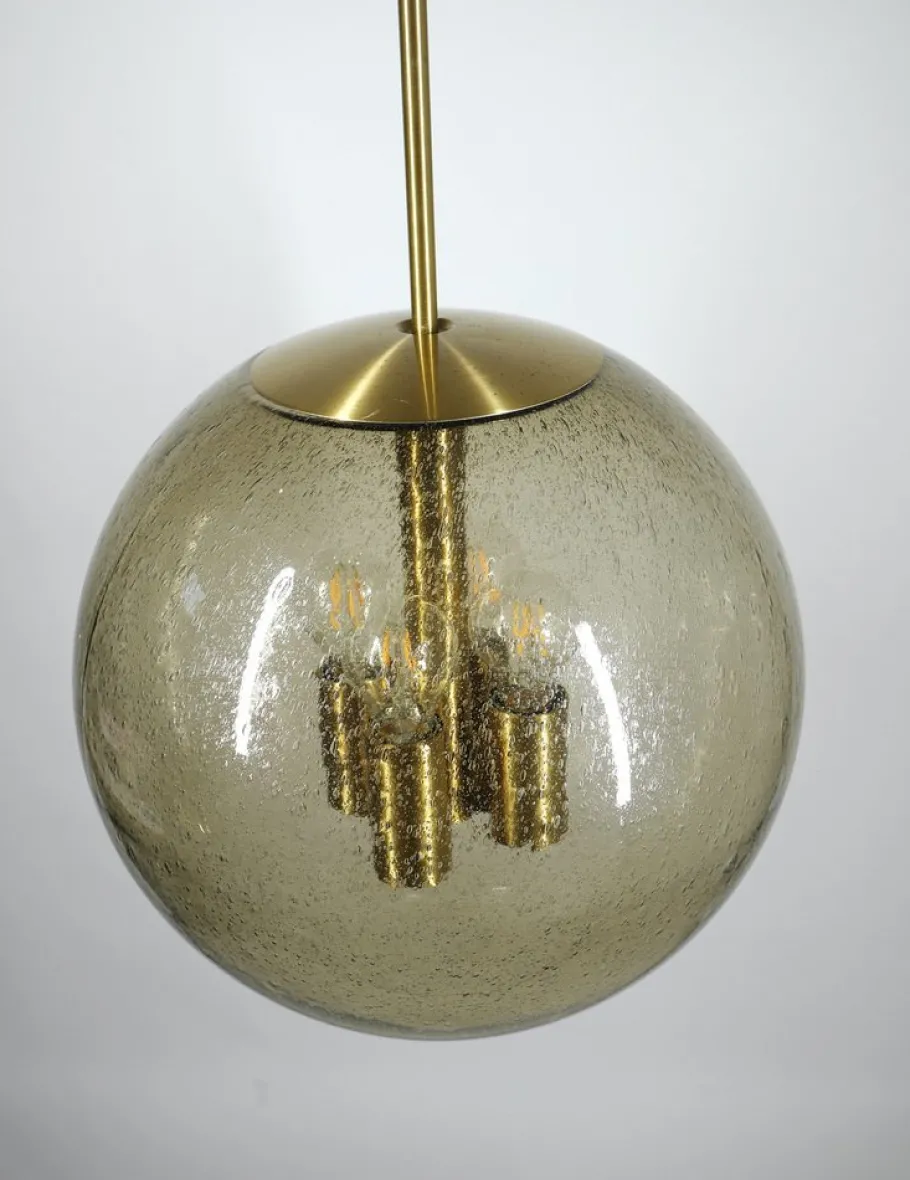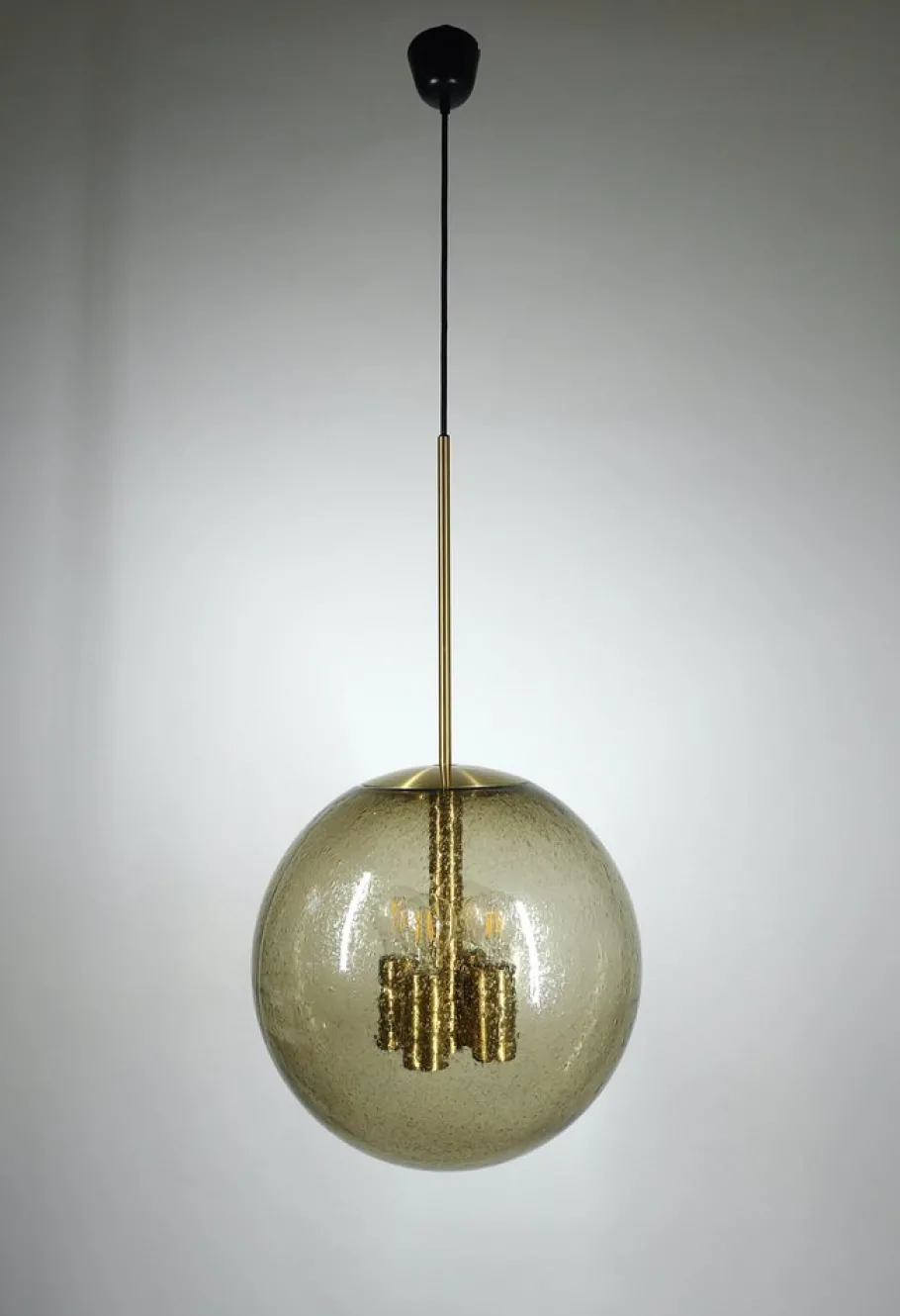 A large, brownish-tinted glass globe with air pockets houses four light sources with E27 lamp sockets. The sockets, the cover, and the pendulum rod, which houses the black cable, are made of brass.
