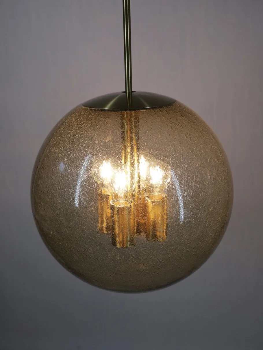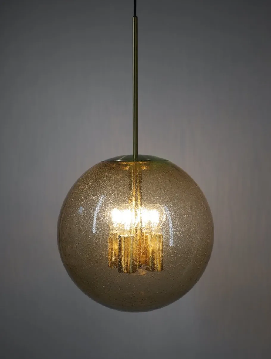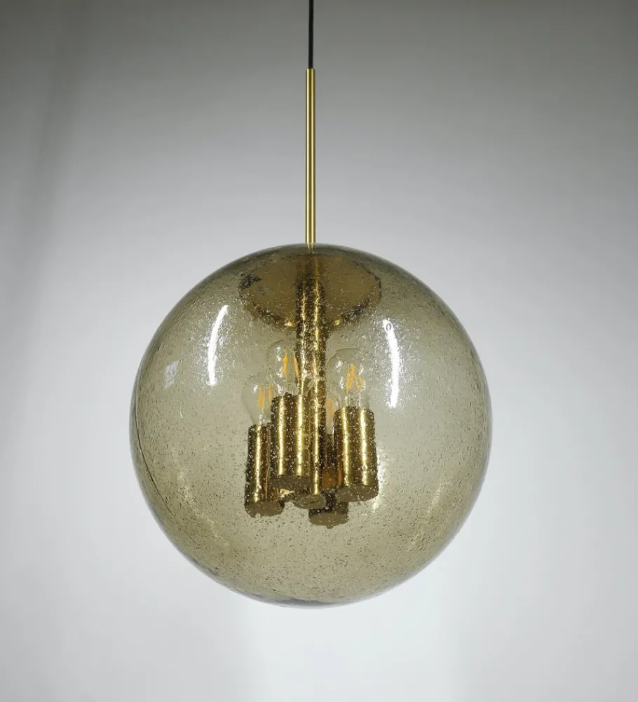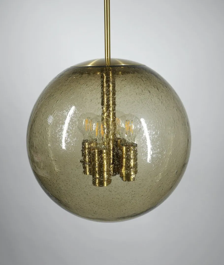 A large, brownish-tinted glass globe with air pockets houses four light sources with E27 lamp sockets. The sockets, the cover, and the pendulum rod, which houses the black cable, are made of brass.