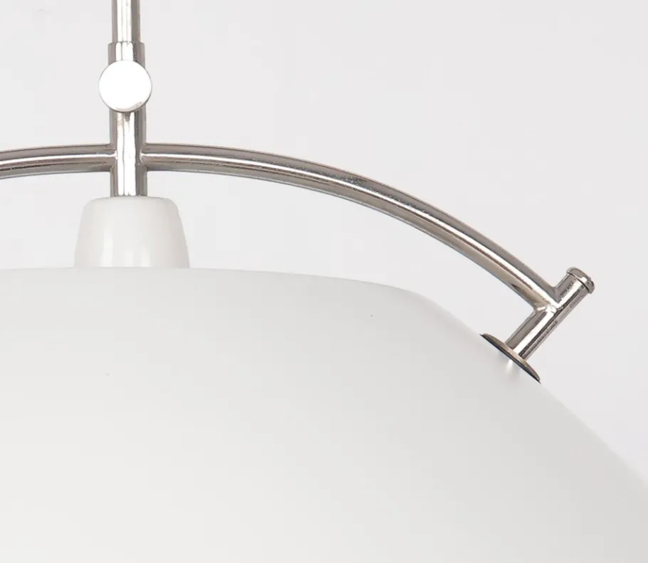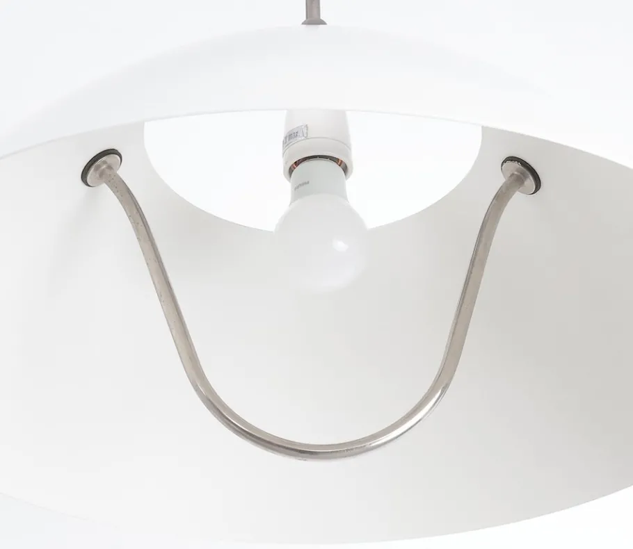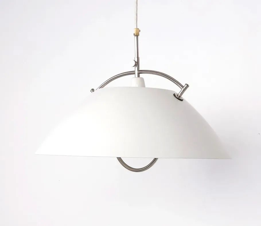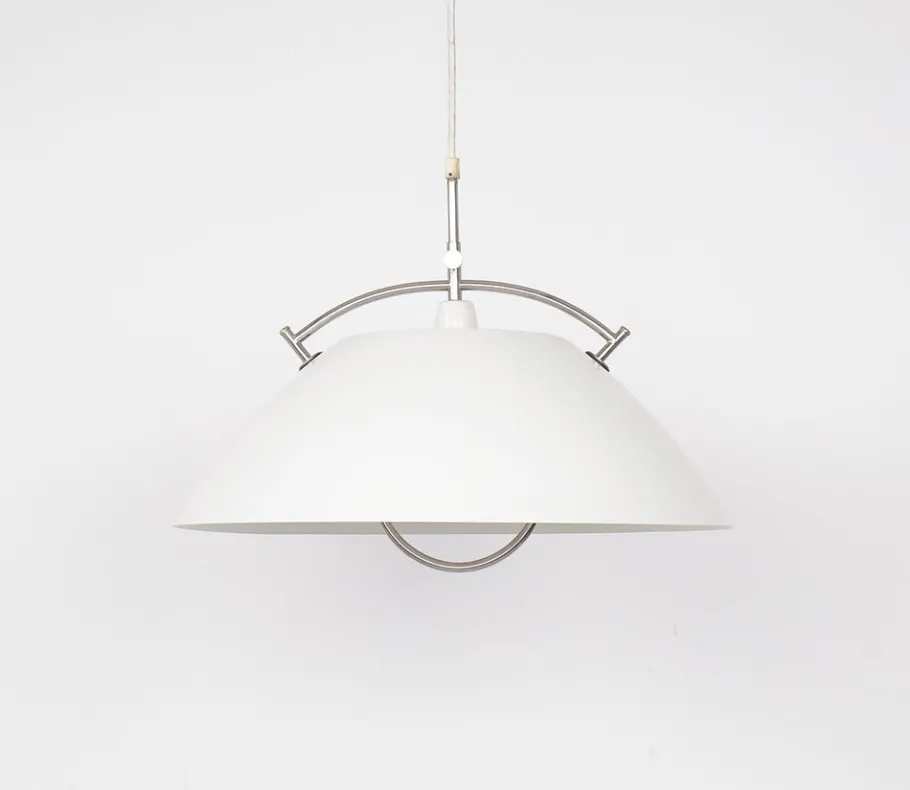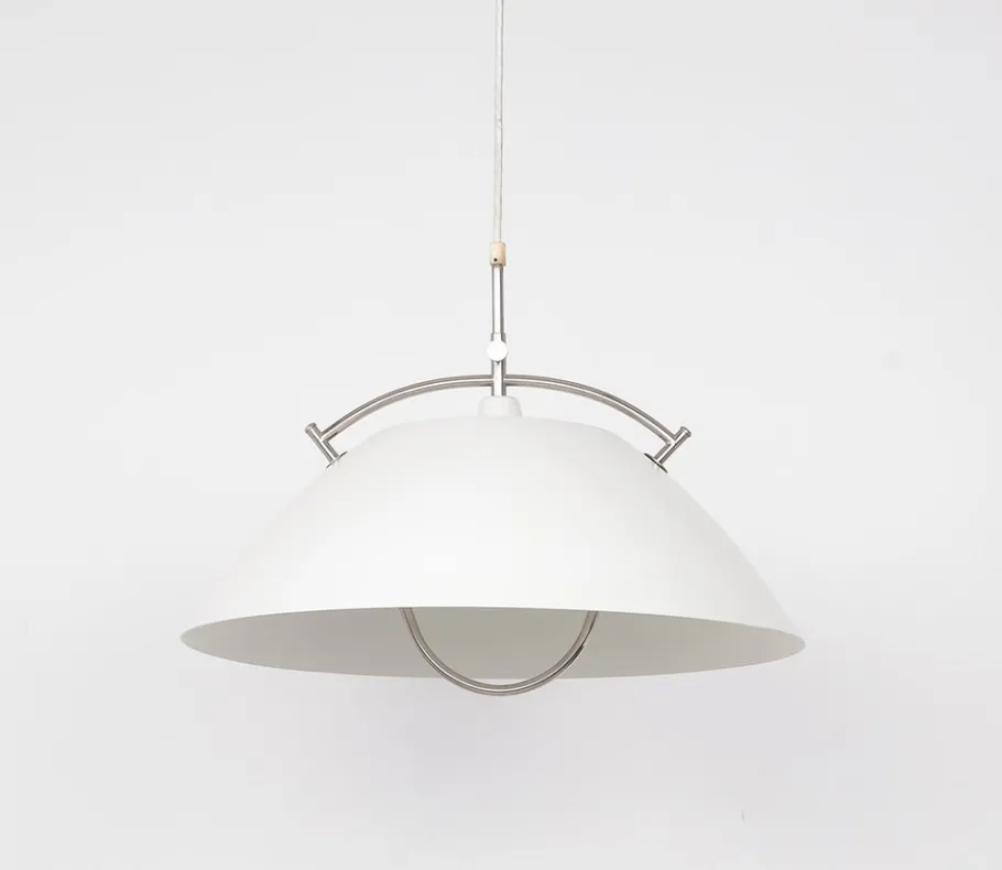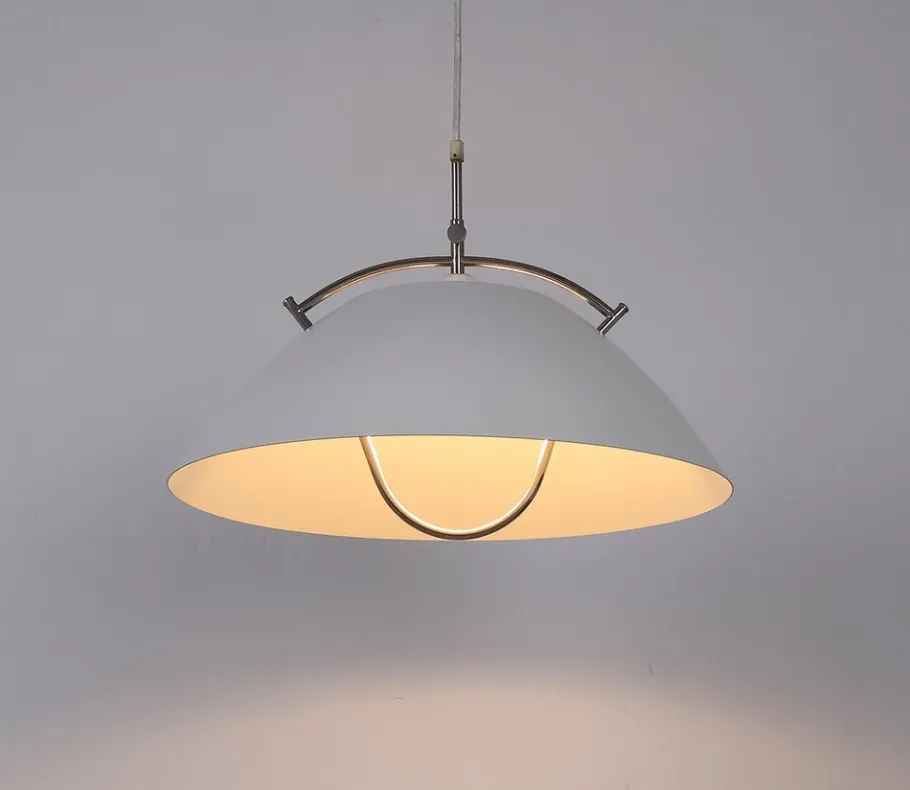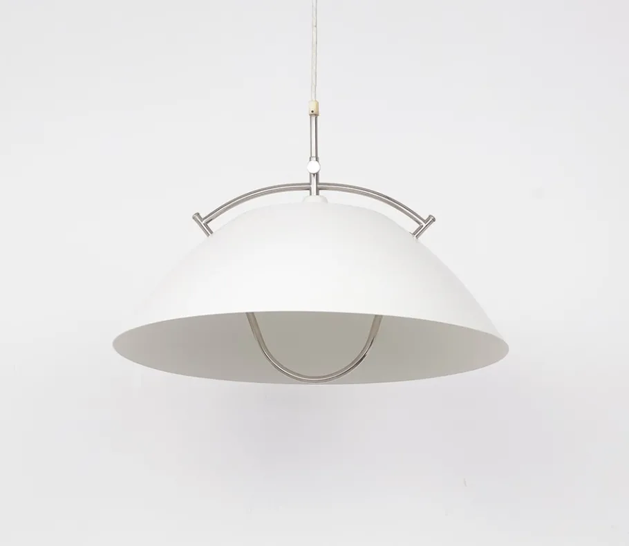 The lamp has a white lacquered aluminum shade and a metal suspension and pull handle.