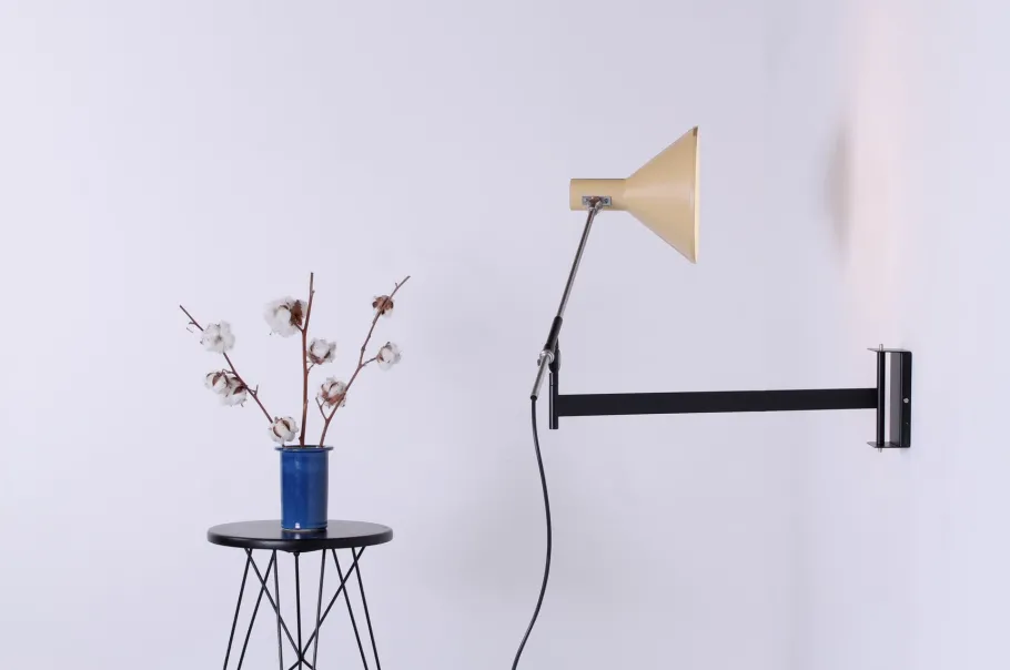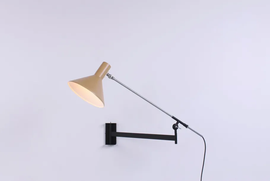 The style is typical modern Italian, inspired by the designs of Stilnovo. Together with Hala and Anvia, Artimeta was one of the Dutch companies who became succesful producing small metal furniture and lighting designs in a new, innovative European style. Sizes: Dia shade: 22 cm, W Black arm: 55 cm, W Chrome arm incl shade: 80 cm. Total Depth from wall 130 cm.