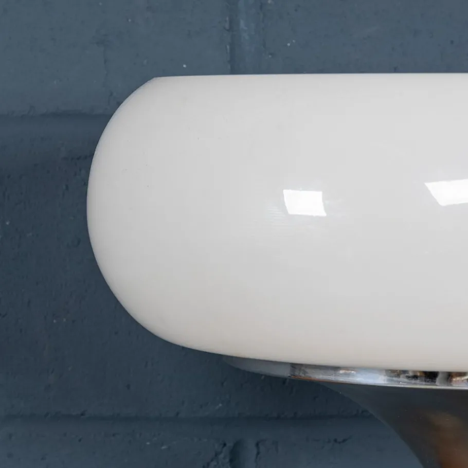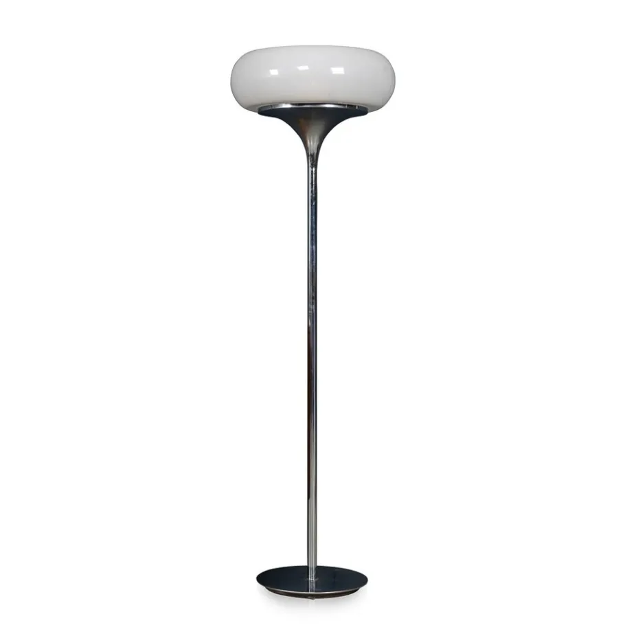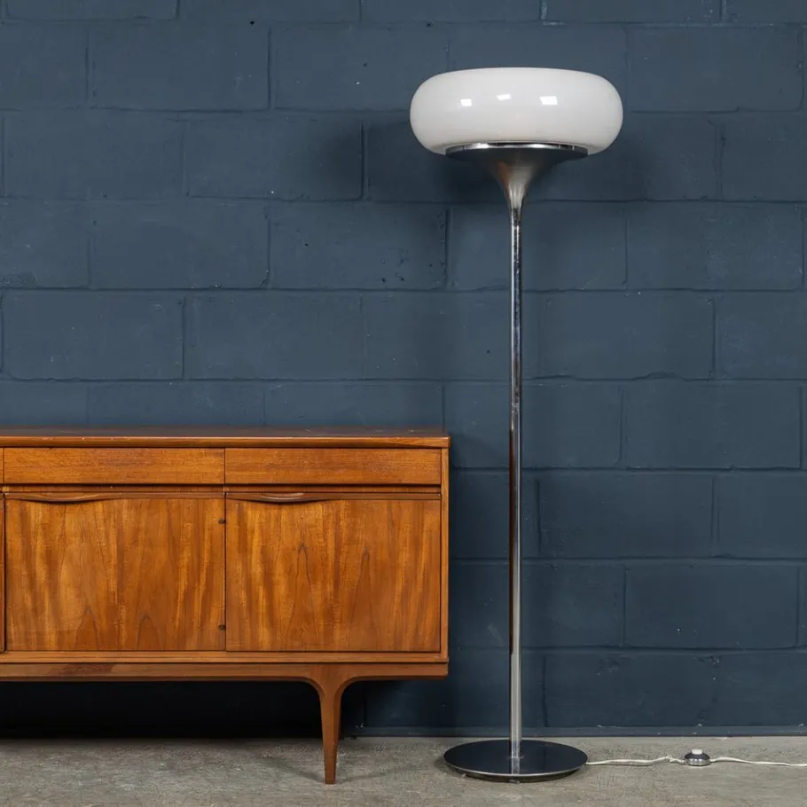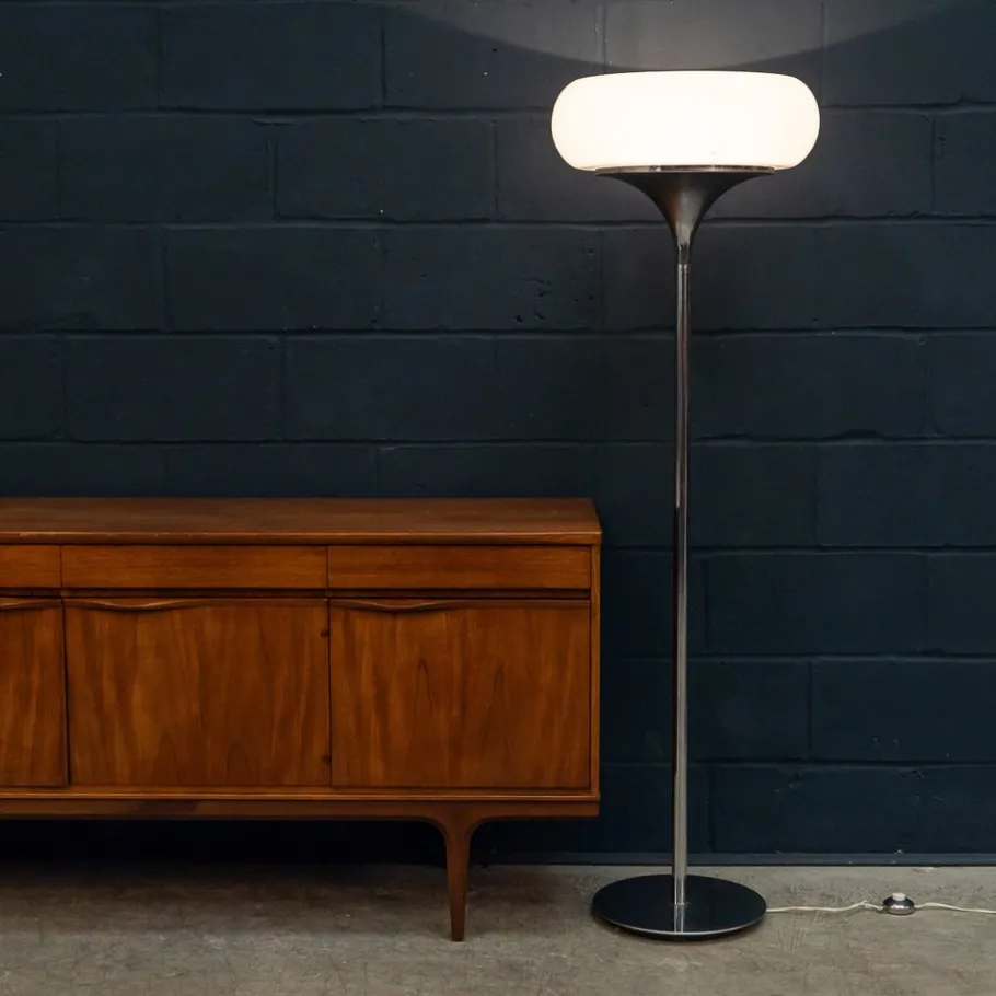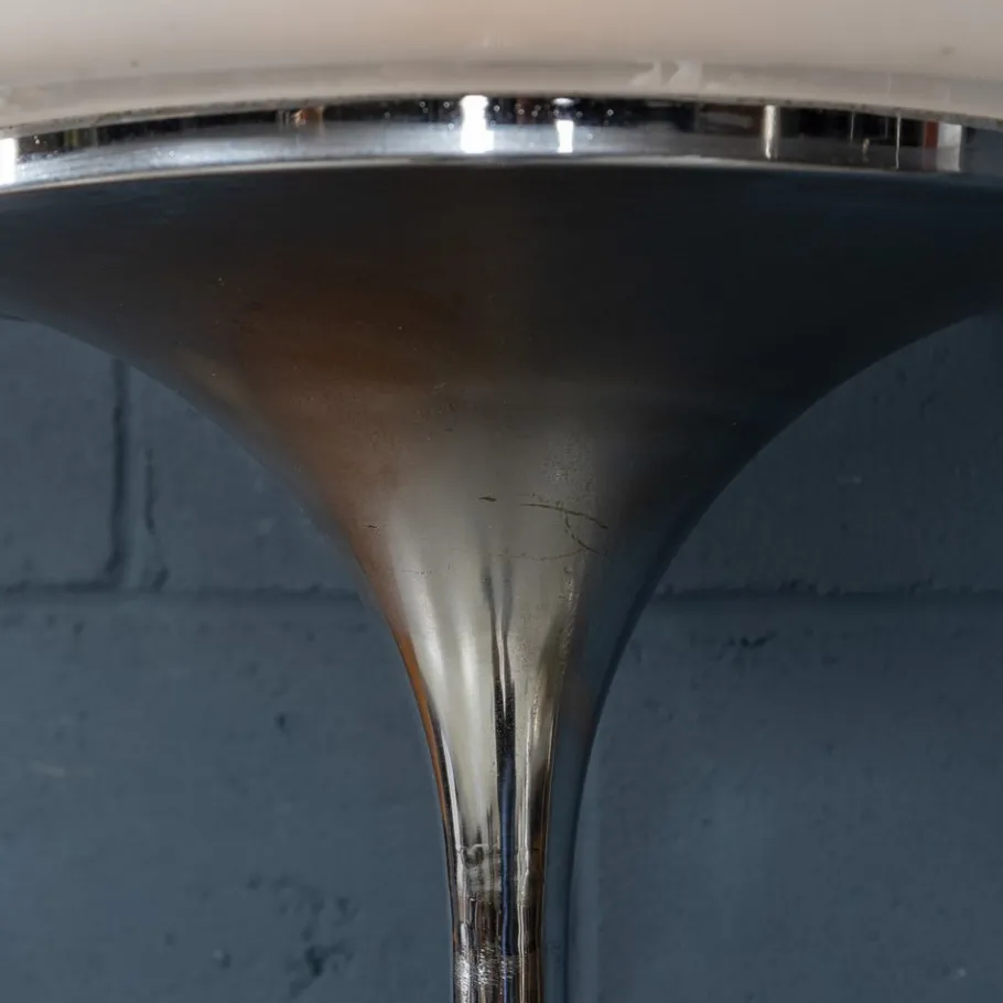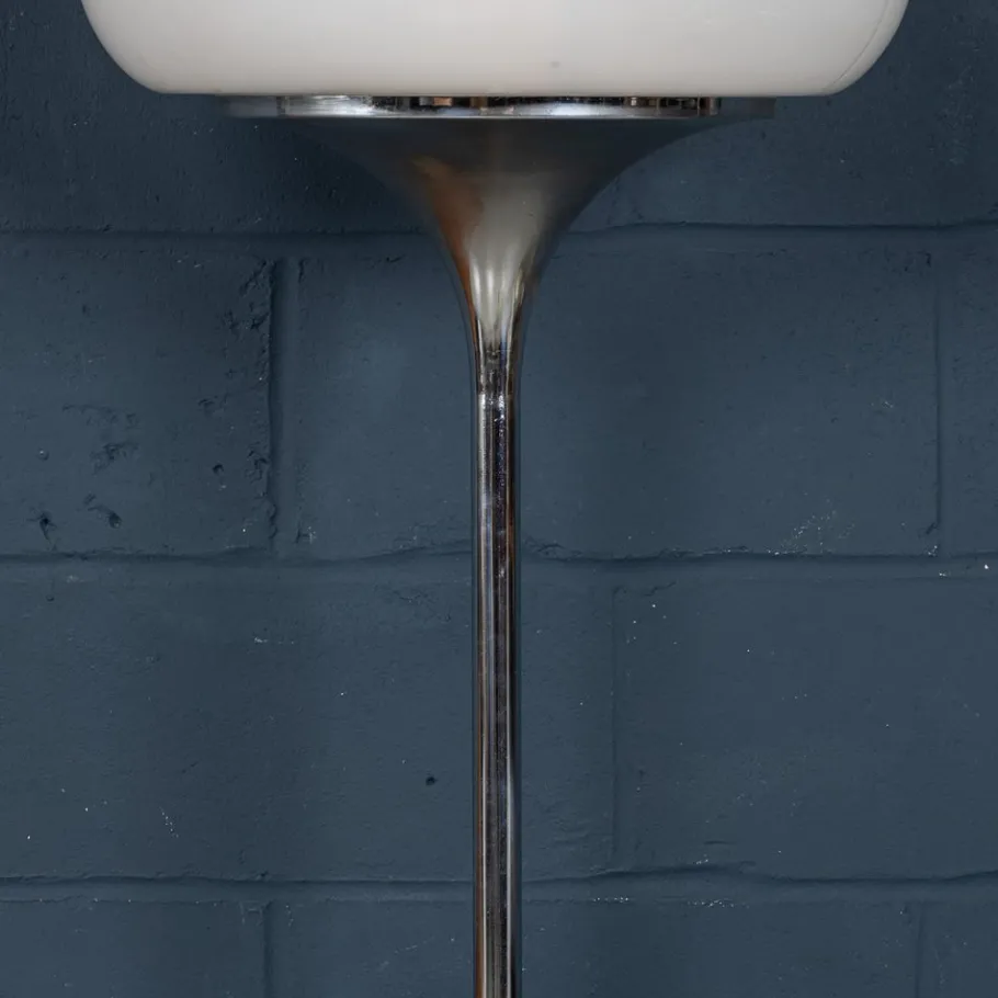 Set on a slender, elegant stem and circular base, the lamp exudes minimalist sophistication while offering a strong sculptural presence. A classic example of mid-century Italian lighting, it embodies the era’s fascination with modern materials and bold, organic forms.