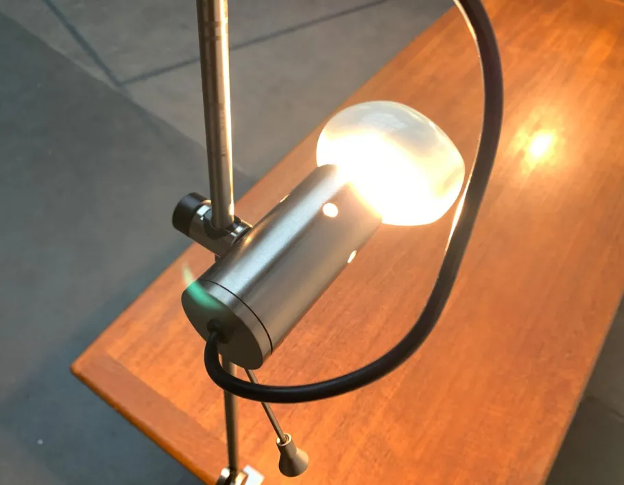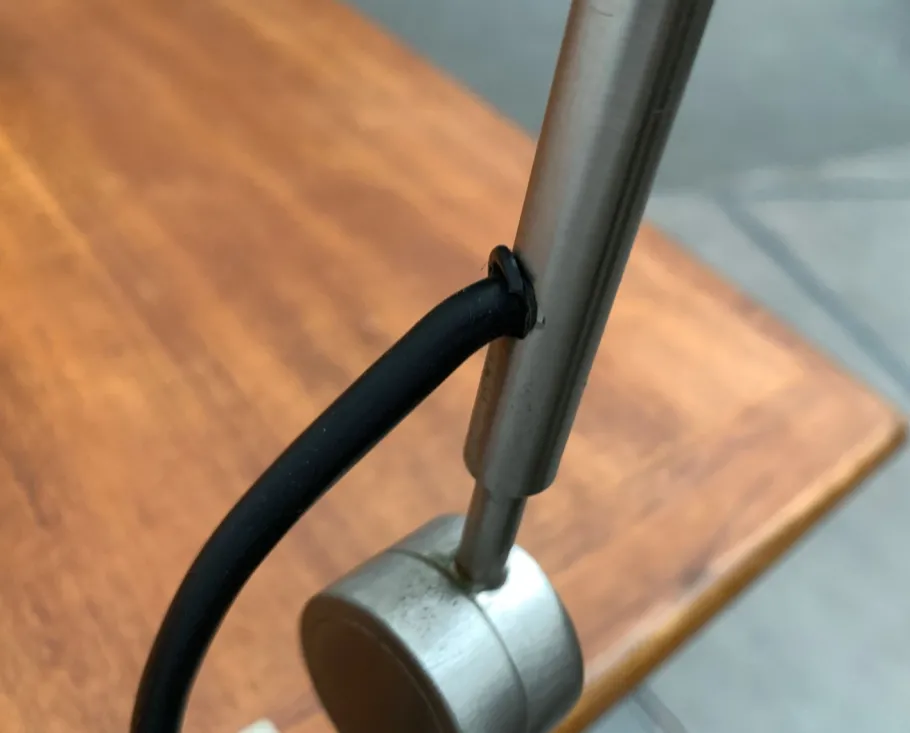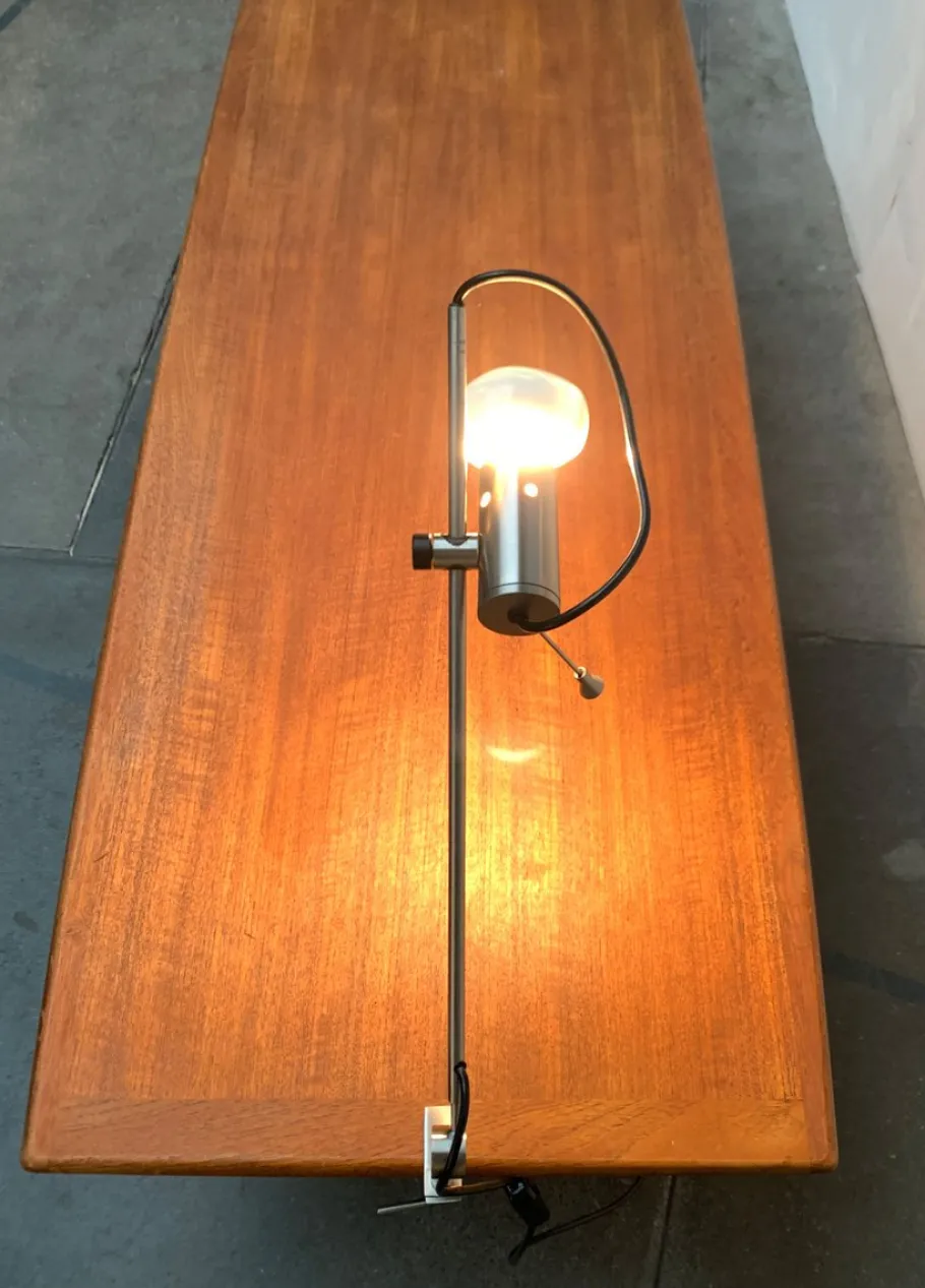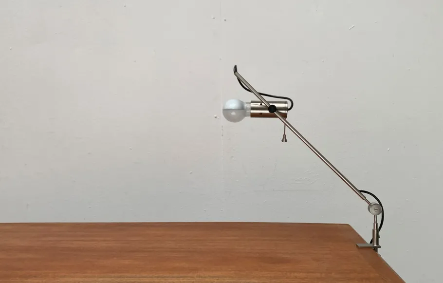 A minimalist design from the 1950s that was far ahead of its time. The light head consists of a simple metal cylinder. The rear end of the cylinder is designed as a disc. This bears the bayonet version inside and is rotatably stored. In this way, the light direction of the lamp can be aligned. A small pen on the disc serves as a handle. The head can be adjusted on the shaft of the lamp in height and fixed with a plastic screw. The cable appears visibly from the shaft in one loop. The shaft is gradually rejuvenated to the joint, which is designed as a simple disc. A special detail is the table clamp, which consists of two simple, parallel -running jams. A decisive design element of the design is the lamp. The lamp is predestined for a Cornalux lamps. This special light bulb is now also available as LED. (Lamps not included)