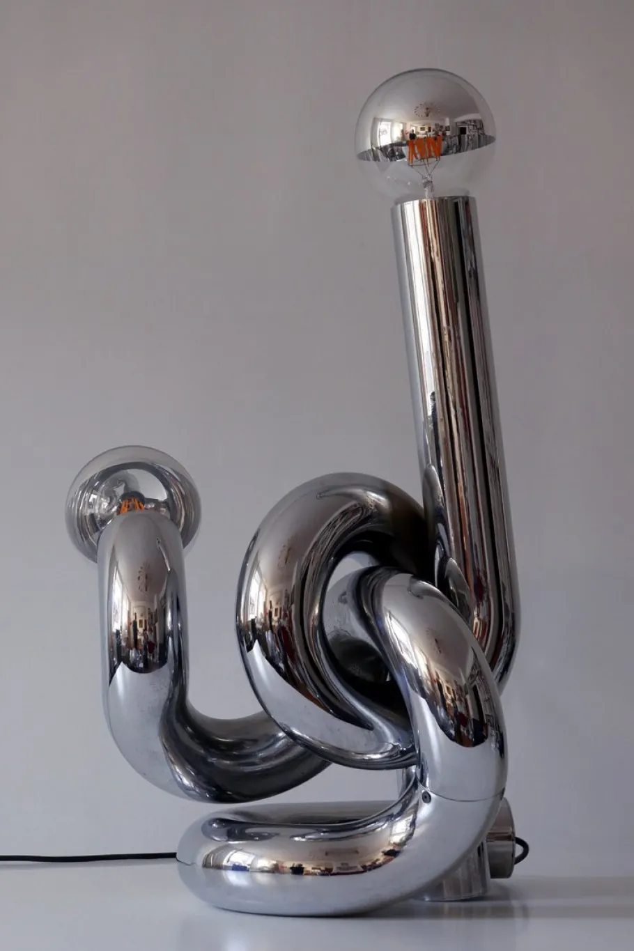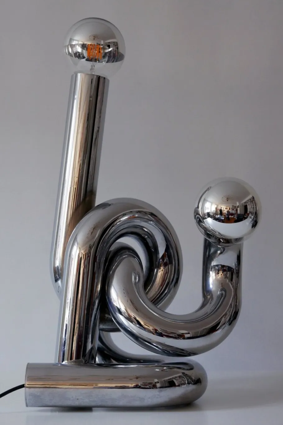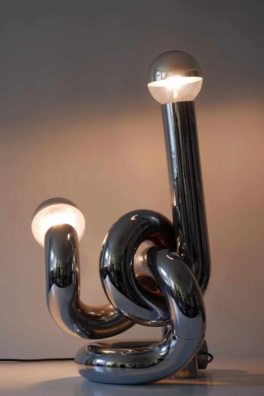 Executed in massive chrome-plated steel, the lamp comes with 2 x E27 / E26 Edison screw fit bulb sockets, is wired, in working condition and runs both on 110 / 230 volt.