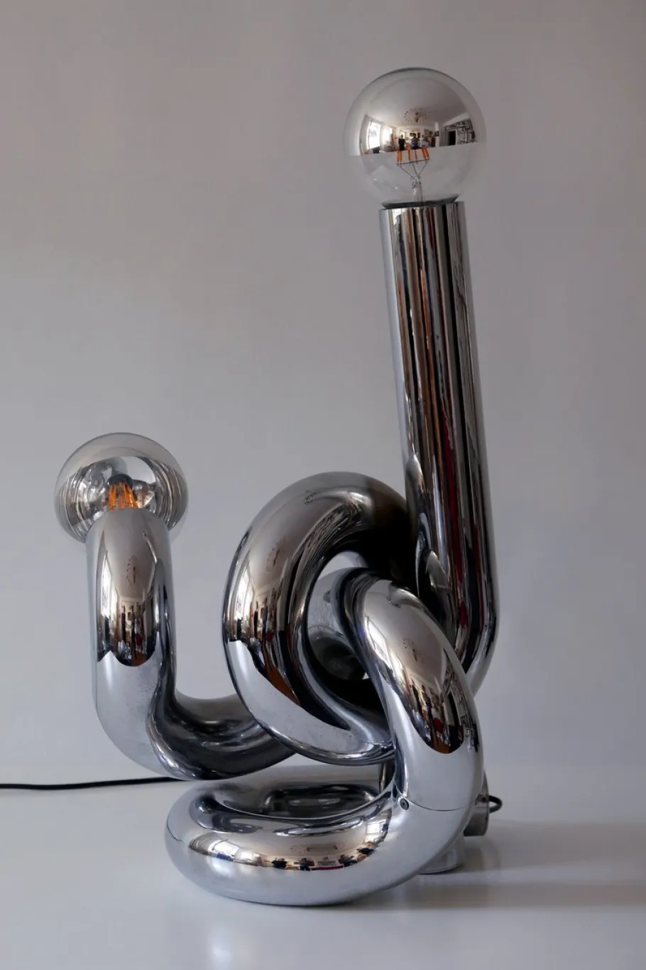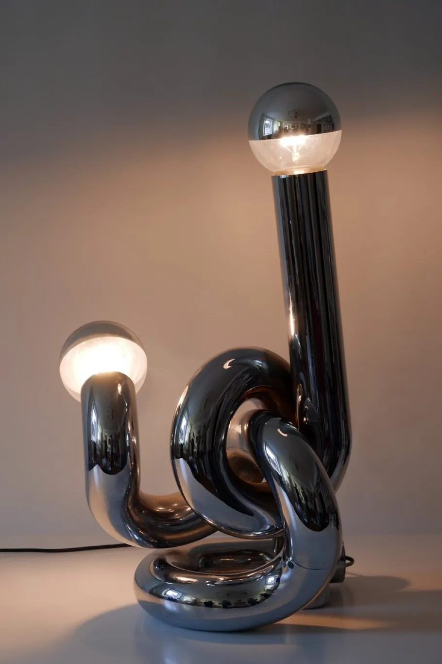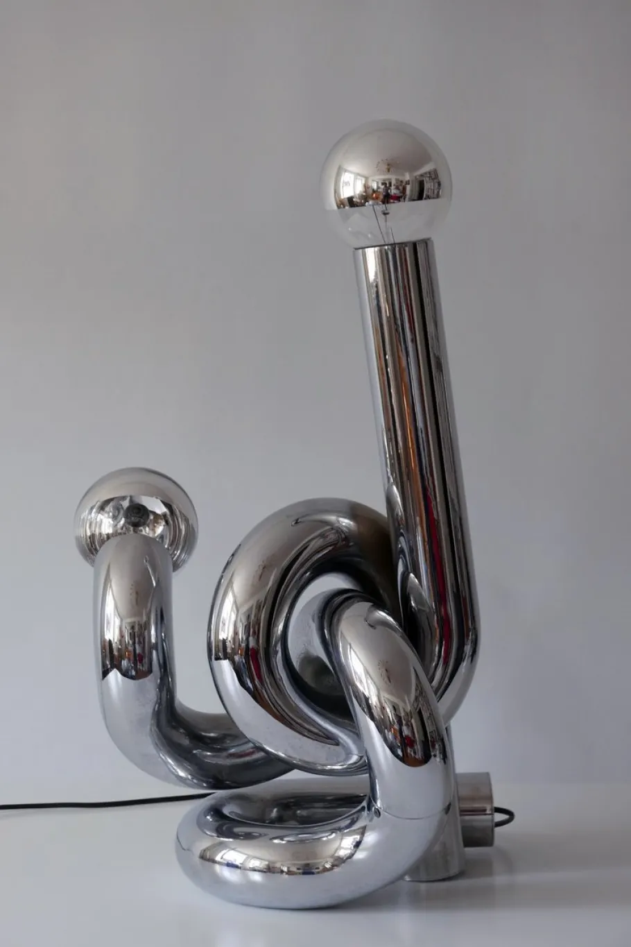 Executed in massive chrome-plated steel, the lamp comes with 2 x E27 / E26 Edison screw fit bulb sockets, is wired, in working condition and runs both on 110 / 230 volt.