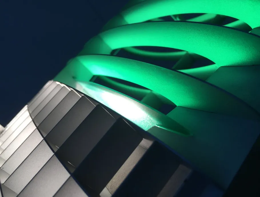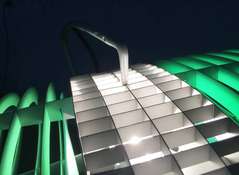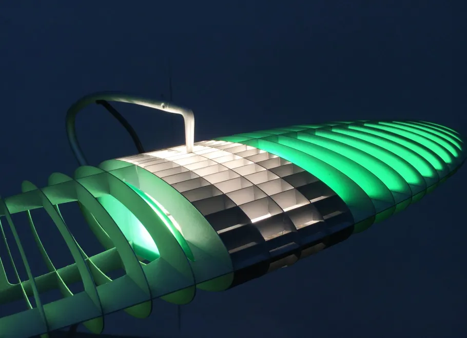The lamp body as a reflector consists of a finely executed aluminum skeleton, which forms the shape of a wing. The light source is located in the center of the wing. The luminaire can be individualized in color using various pairs of color filters. The filters color the alumininium ribs, and functinal white light emerges from the center. The special feature of the Titania Terra is the lamp arm and base, which are very finely executed and gracefully curved ends in a counterweight. The lamp head almost seems to float. The lamp is dimmable via a cord dimmer. A set of different color filters is included.