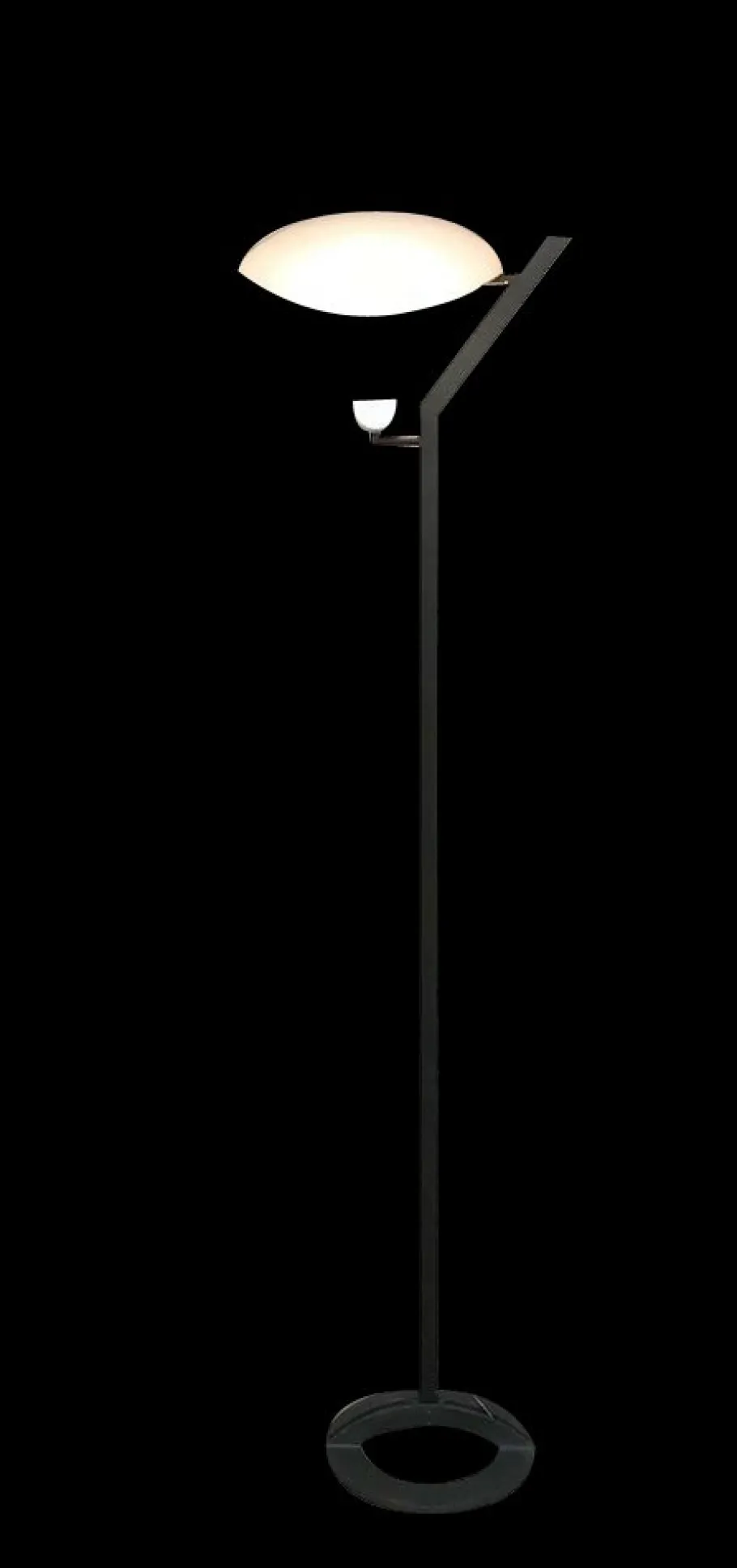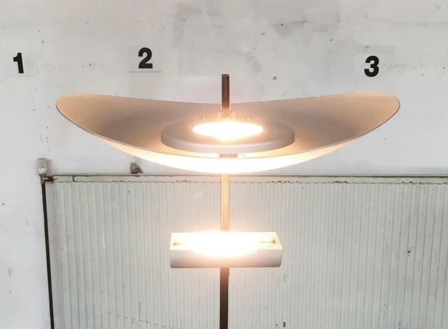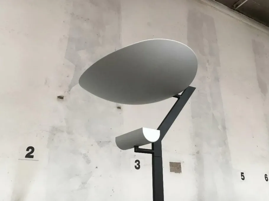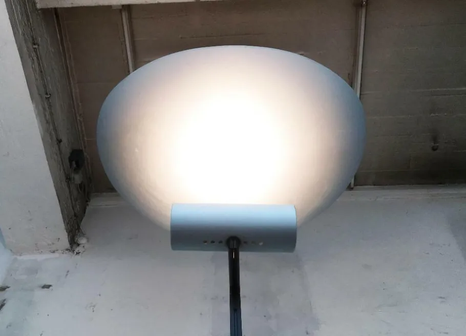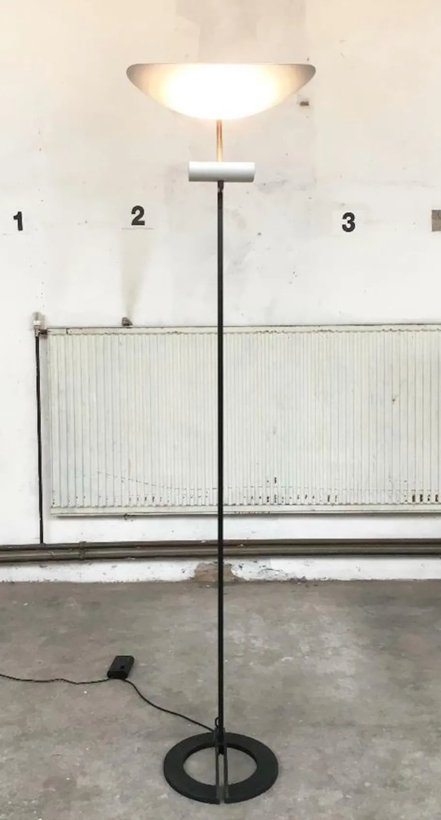 Due to the height of just over 200cm and the large, curved reflector shell, this floor lamp looks particularly impressive. At the same time, the black, narrow foot withdraws very much. In addition, there is the unique lighting effect, which both staged the luminaire body and immerses the room in different lighting moods. There are two light sources for indirect light. A light source illuminates the large reflector from below and distributes the light down into the room. The second light source is a dimmable ceiling flooder within the reflector that is aimed at the ceiling. The upper bowl can be tilted somewhat in both directions, which changes the light and appearance of the lamp. Both lamps can be switched independently of one another or use together.