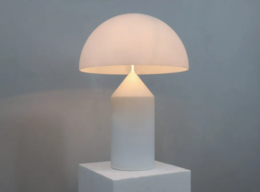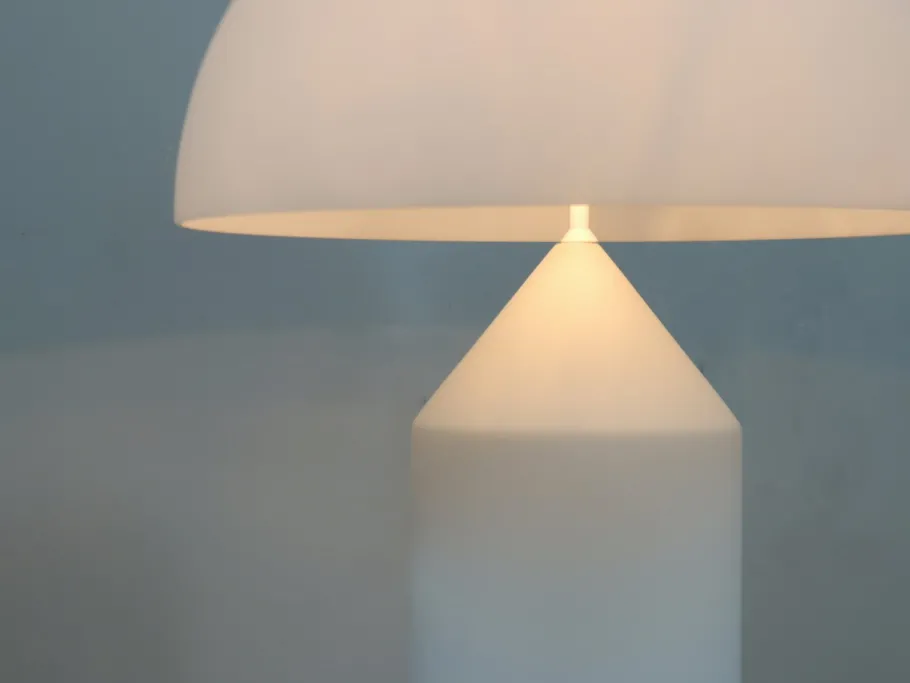 Its blown opaline glass diffuses a soft, ambient glow, ideal for adding warmth and sophistication to any space. The lamp’s architectural balance composed of a cylinder, cone, and hemisphere, is further enhanced by a tiltable shade, allowing flexible light direction while maintaining the lamp’s striking visual harmony.