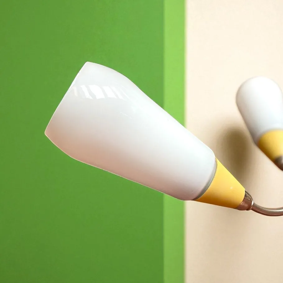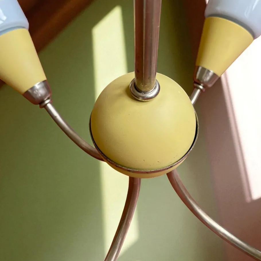 It is in very good vintage condition. All electrics have been renewed. Some age marks on chrome parts. Shades are made of a reverse-painted white glass. The shades are reverse -painted white glass. One of the shades has tiny bits of paint missing on the rim. You won´t see it when it is hung up.