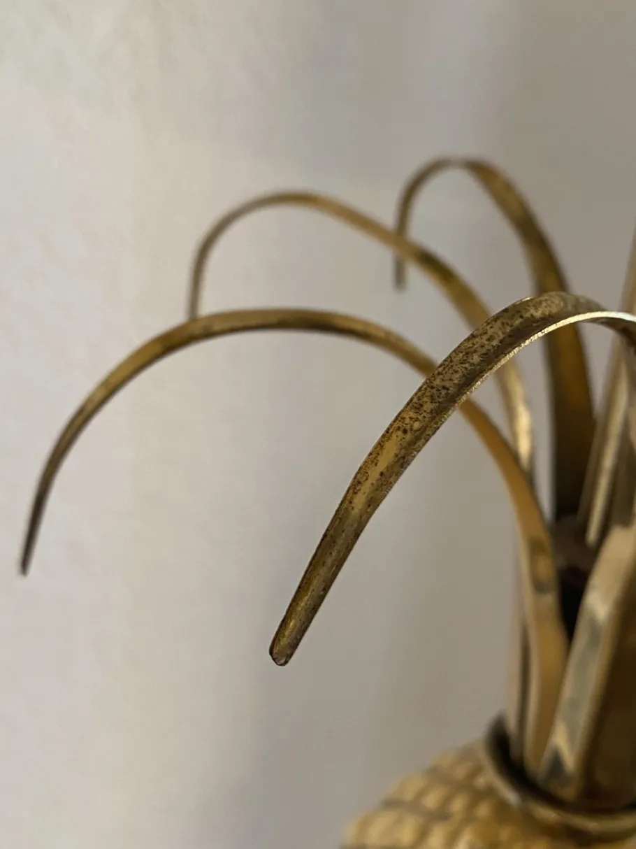 The pineapple is made of porcelain, the base is acrylic glass, and the leaves and stem are made of gilded metal.
