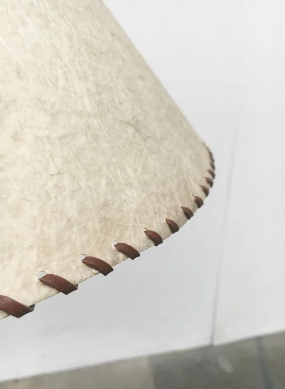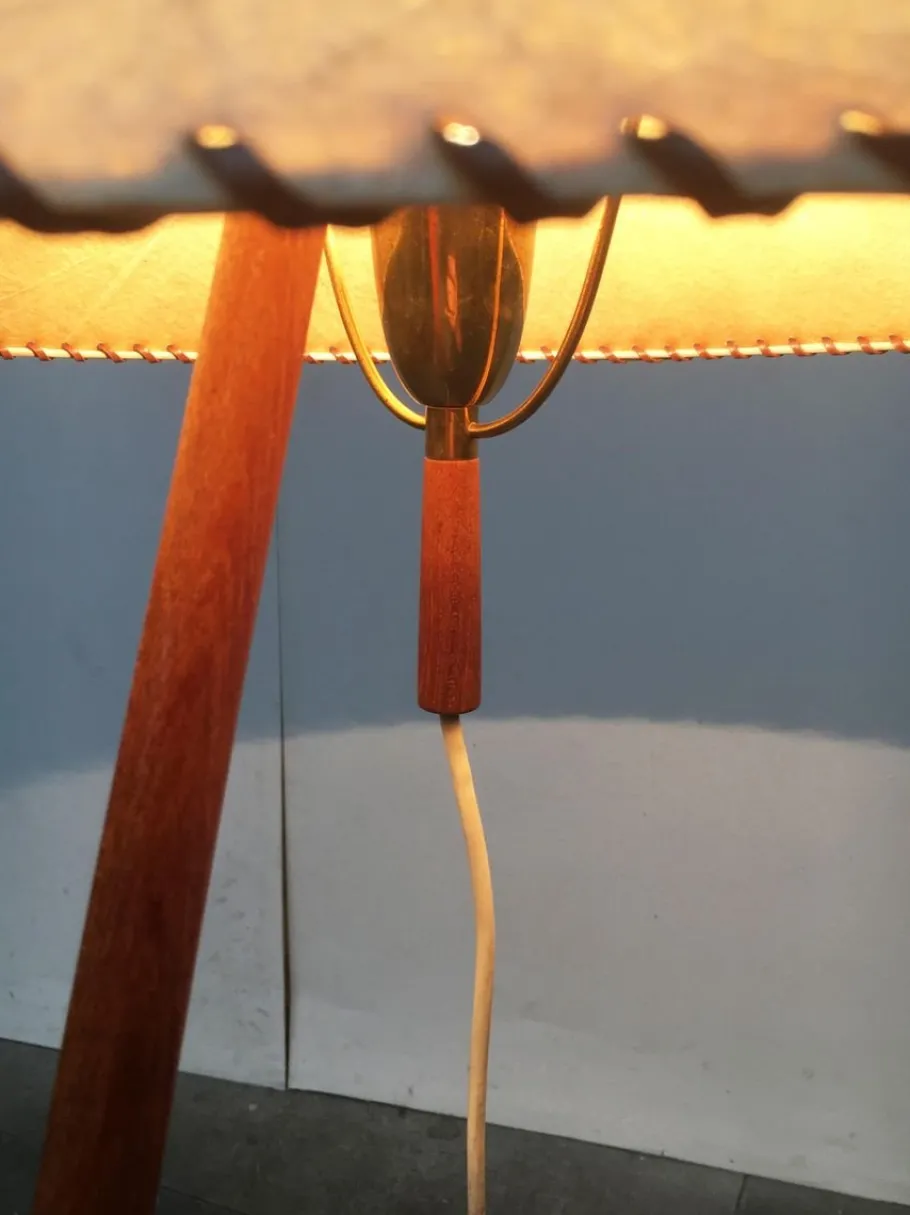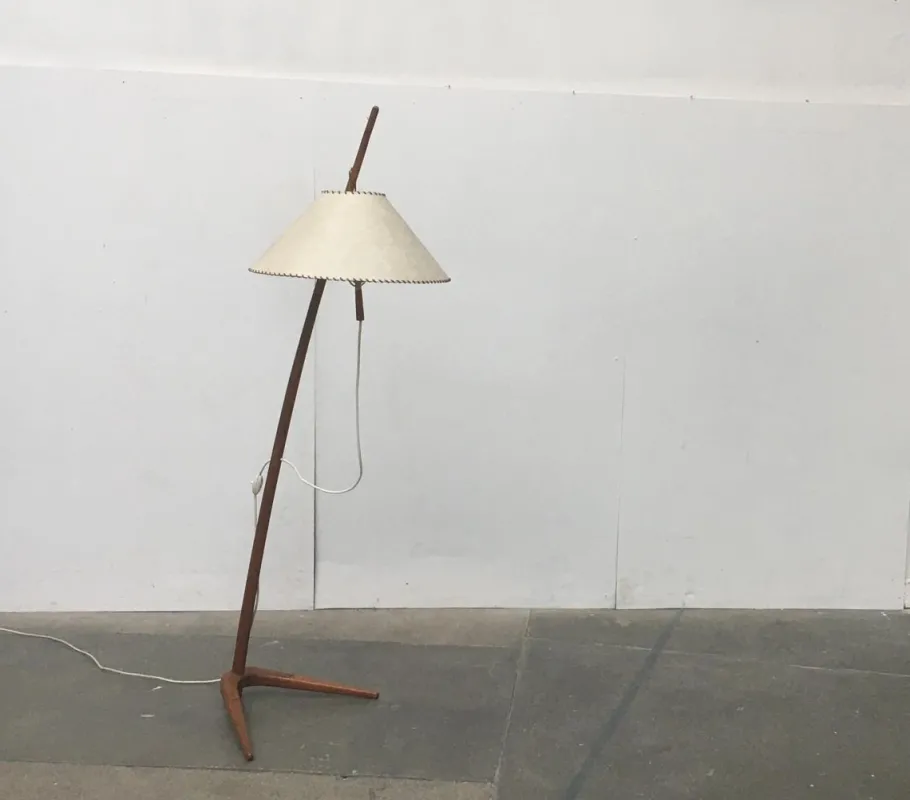 An early design classic that draws its elegance from the functionality of the design. The particularity lies in the arrangement of the lampshade. The saber-shaped shaft pierces the screen and passes upwardly projecting from the opening. The design allows a manual height adjustment. For this purpose, are located at regular intervals pins at the upper end in which the lamp shade is mounted the shaft. On the screen are to a temple and a wooden handle on the bottom. This simple height adjustment resulting from the actual design of this floor lamp as a reading light. Another special feature is the design of the foot. Instead of a heavy plate foot, the foot is bifurcated dissolved in two prongs here who wear the burden of the cantilevered shaft.