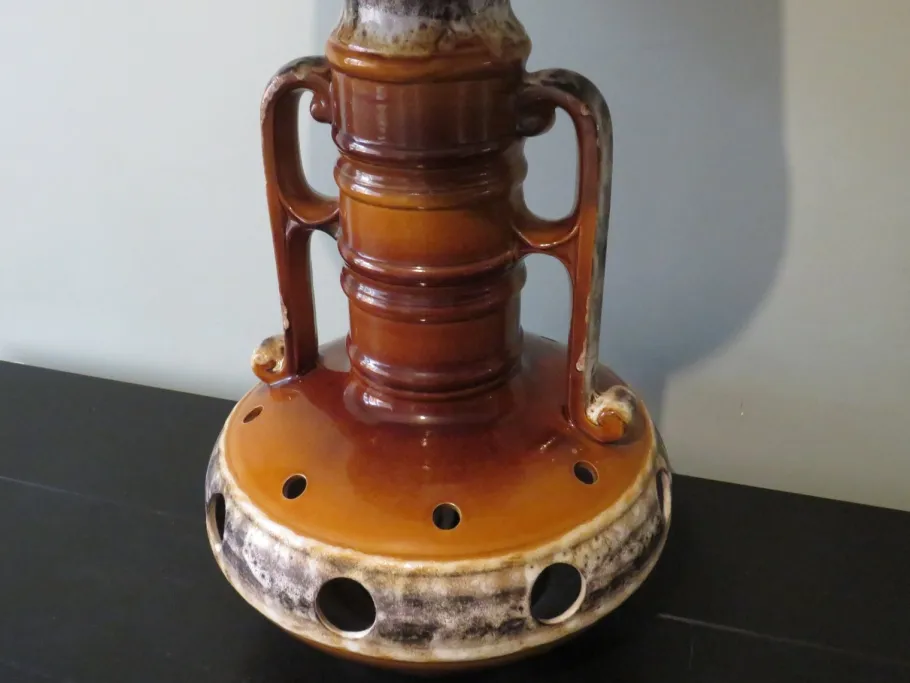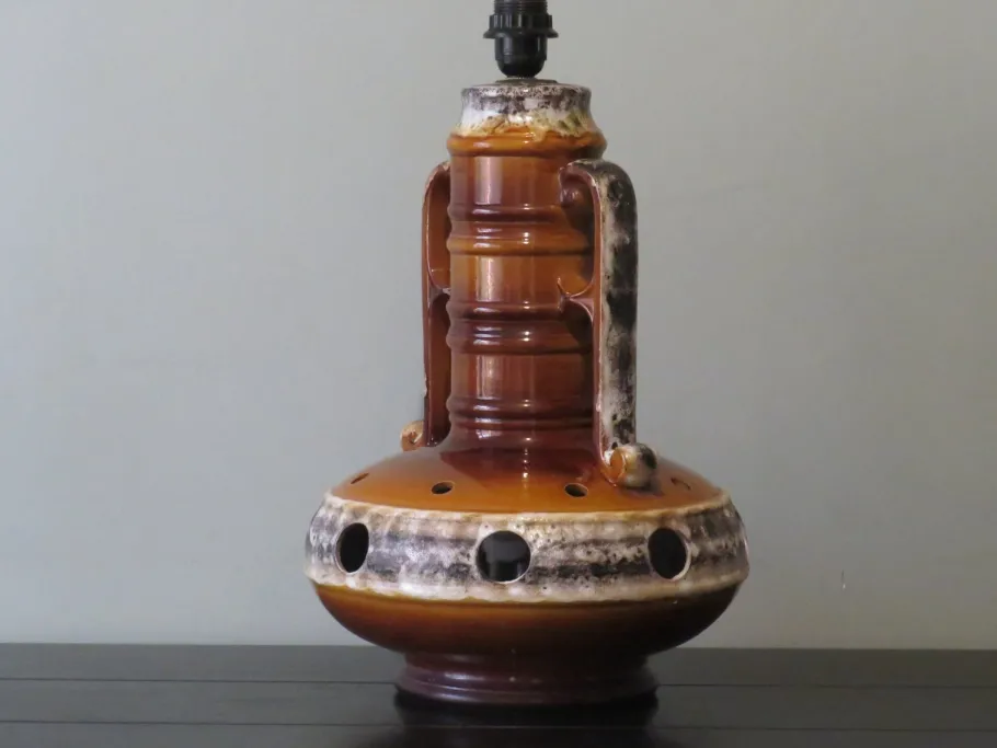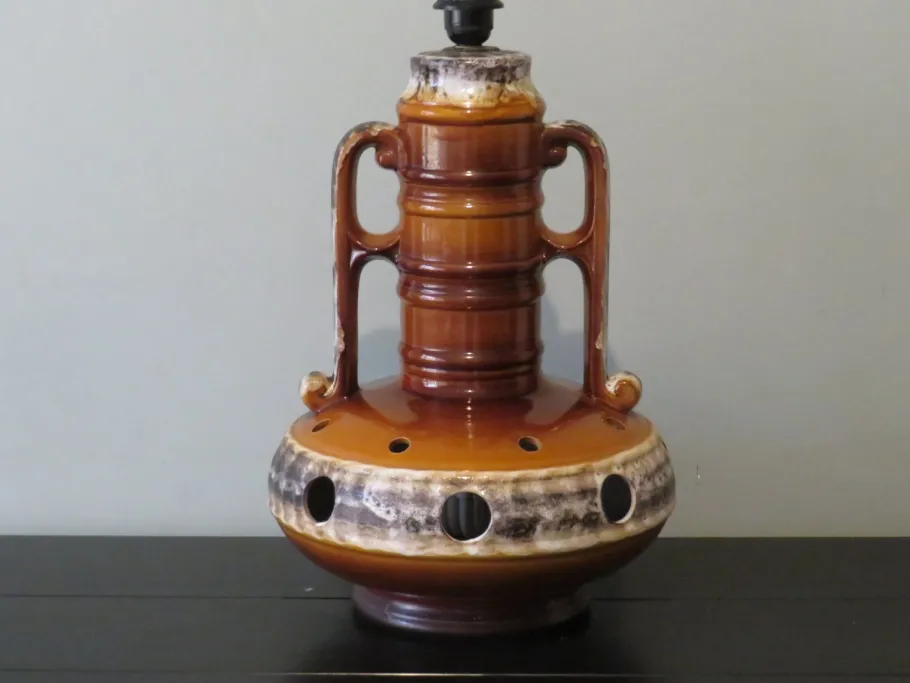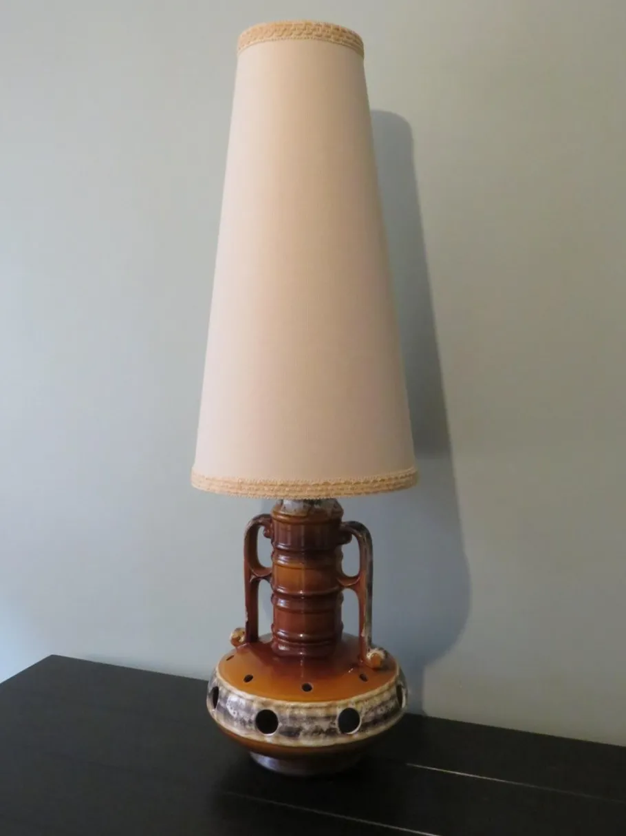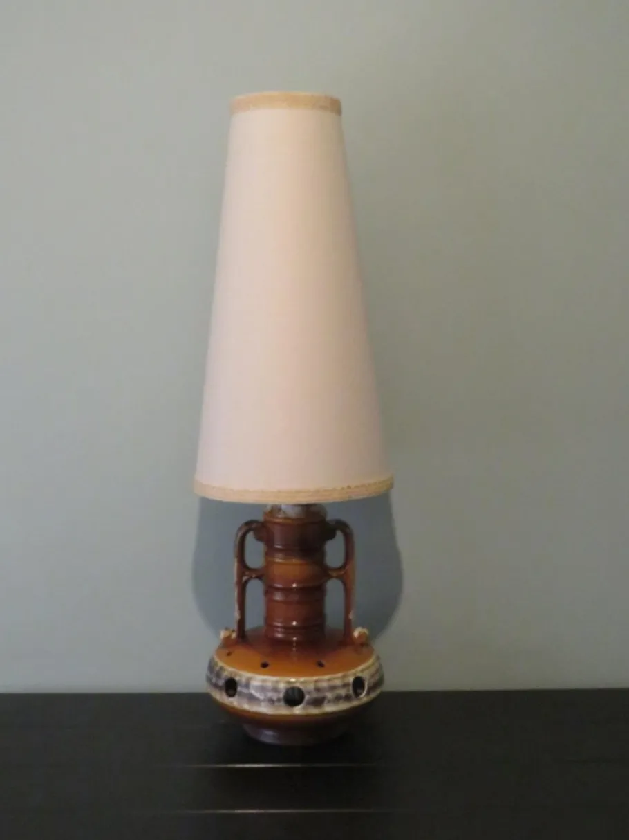 The lamp has a light beige shade with a border at the bottom and top in the same shades as the shade.