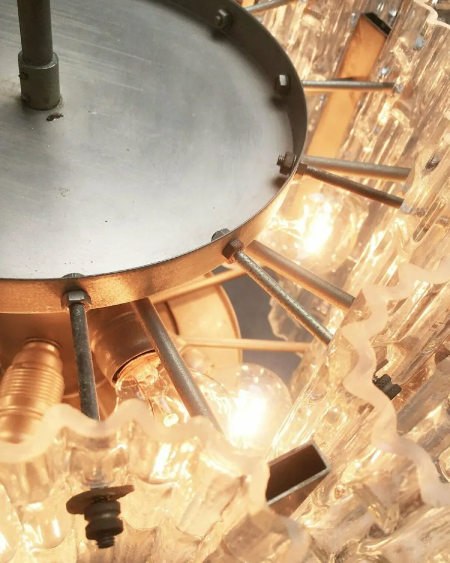 The elements of structural glass break and potentiate the light of the lamp inside. This makes them a functional lamp and light object in one. The glass elements are arranged in a ring and are held on rods. The tubular glasses are separated with simple jetties from and each. The underside of the candlestick is covered by a simple metal plate. This combination of simple metal elements and the ornamental glasses gives this impressive design a rather factual appearance. The glass elements are carried out hollow on the inside, which gives the whole an additional transparency and lightness.
